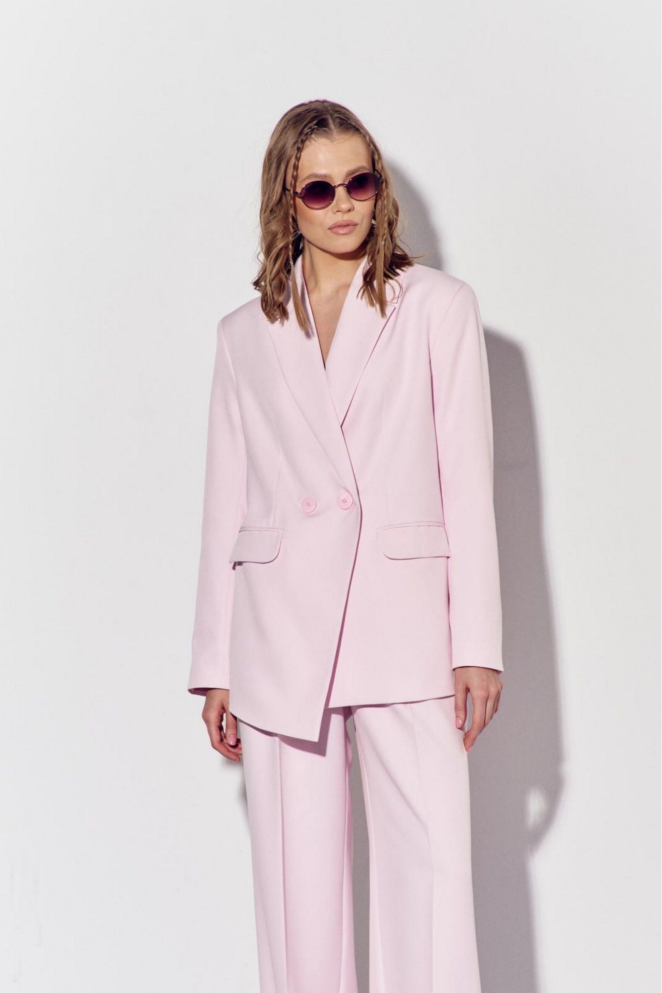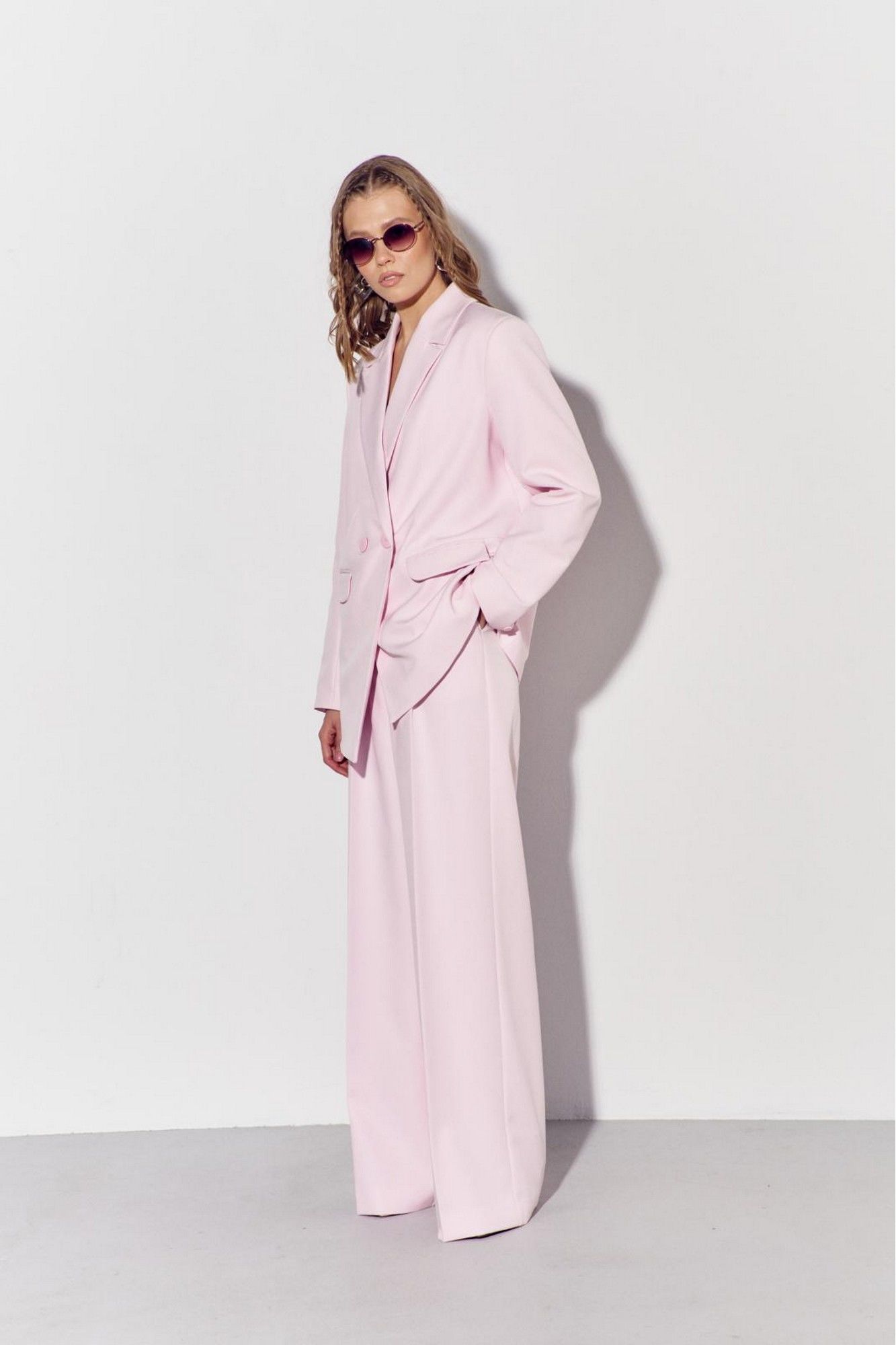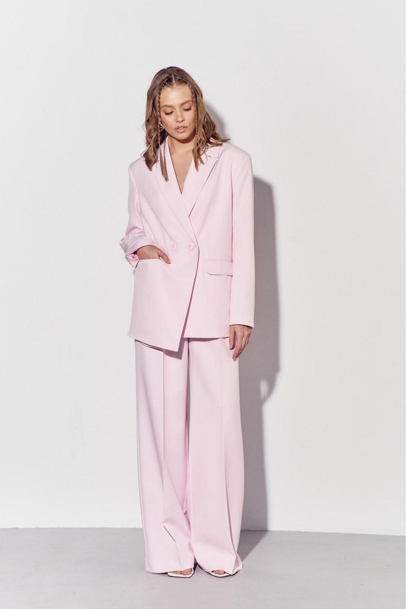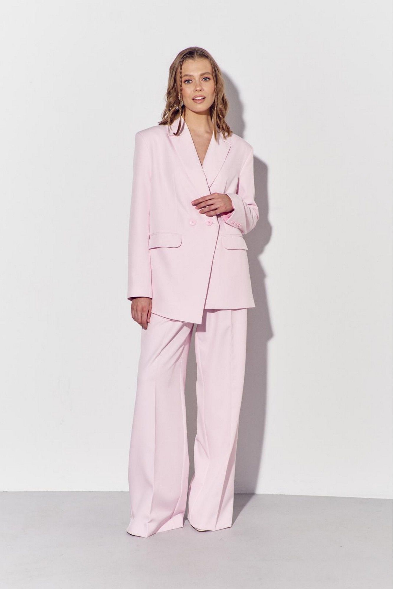 Костюм женский, состоящий из жакета и брюк. Жакет прямого силуэта с двубортной застежкой на 2 петли и пуговицы. Полочки - с прорезными карманами с клапаном и 2-мя обтачками, с нагрудными вытачками от кармана вверх. Низ переда асимметричный. Правая полочка удлинена к борту. Спинка со средним швом и рельефами от низа до проймы. Воротник пиджачного типа с отложными лацканами. Рукава длинные, втачные, 2-хшовные, с передним и локтевым швами. В нижней части локтевого шва обработана закрытая шлица с 4-мя пуговицами. Жакет на х/б подкладке и с плечевыми накладками. Брюки - палаццо с застежкой, с гульфиком и откоском на тесьму-молнию; с притачным поясом с резинкой по спинке. Пояс со шлевками (2 широкие -по переду и 3 узких по спинке). Пояс застегивается на потайной крючок. Передние половинки брюк со складками и боковыми карманами. Задние половинки брюк с талиевыми вытачками.