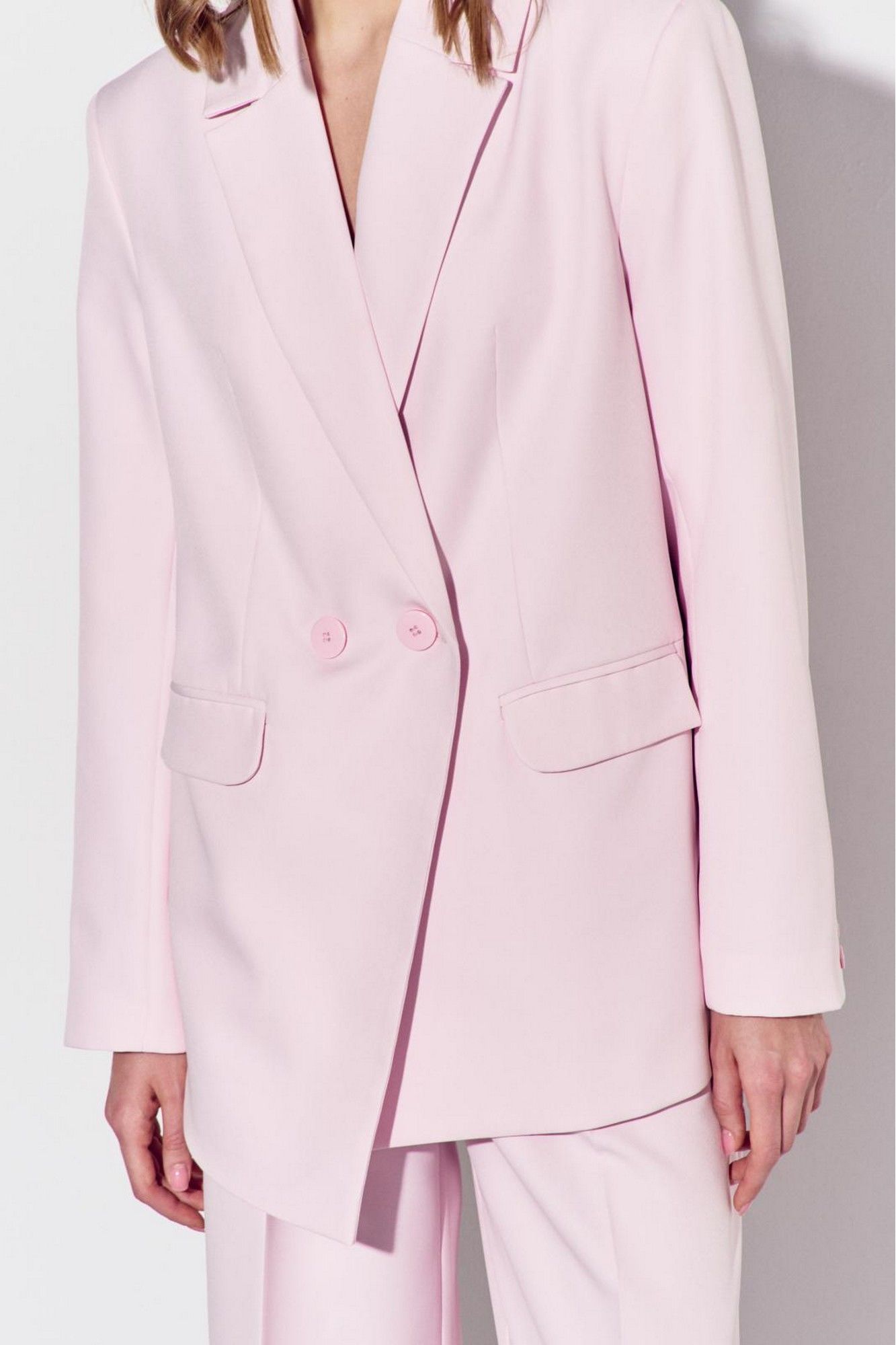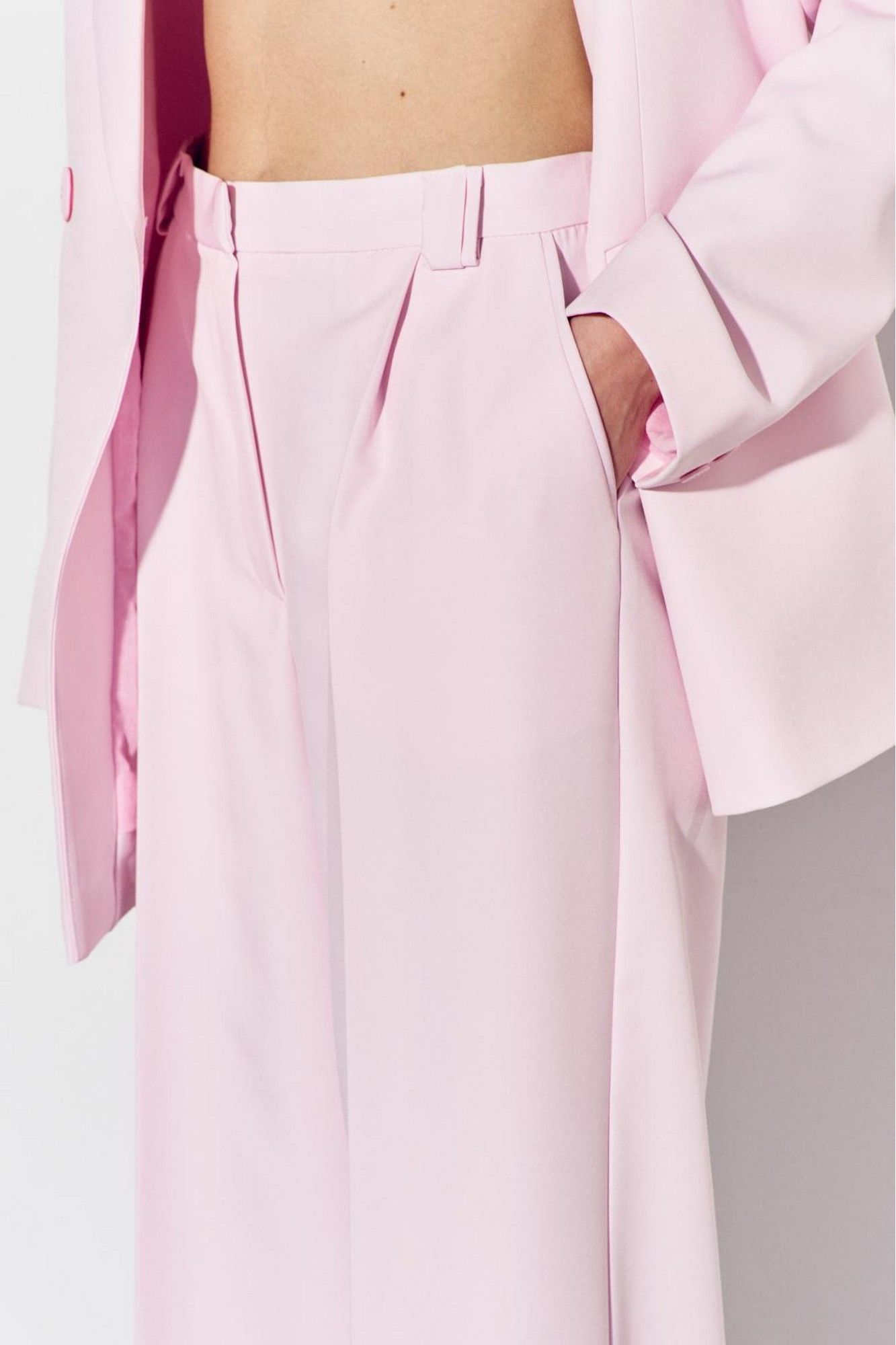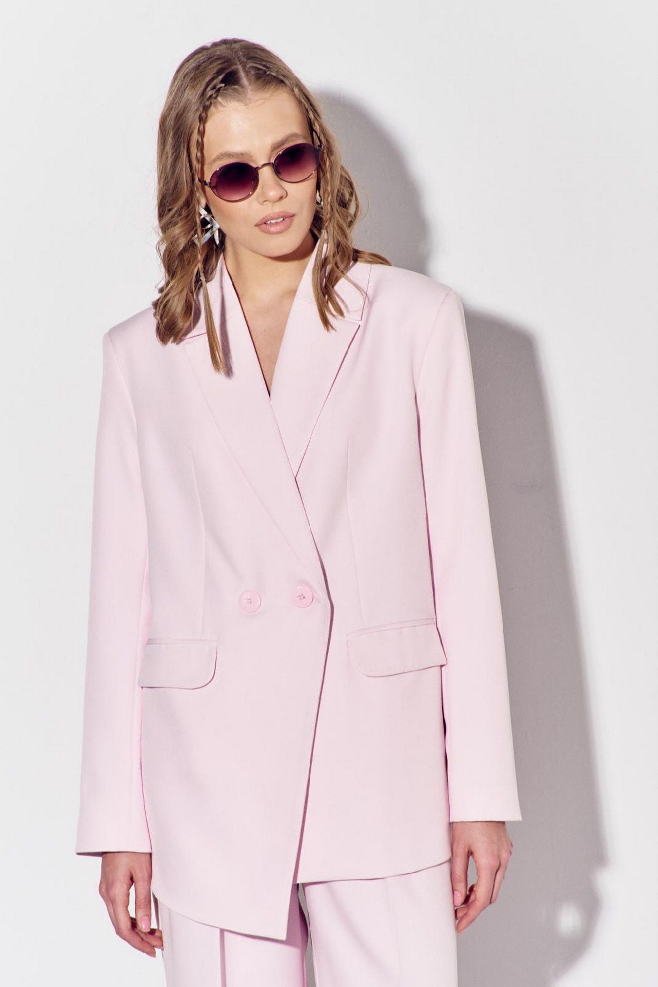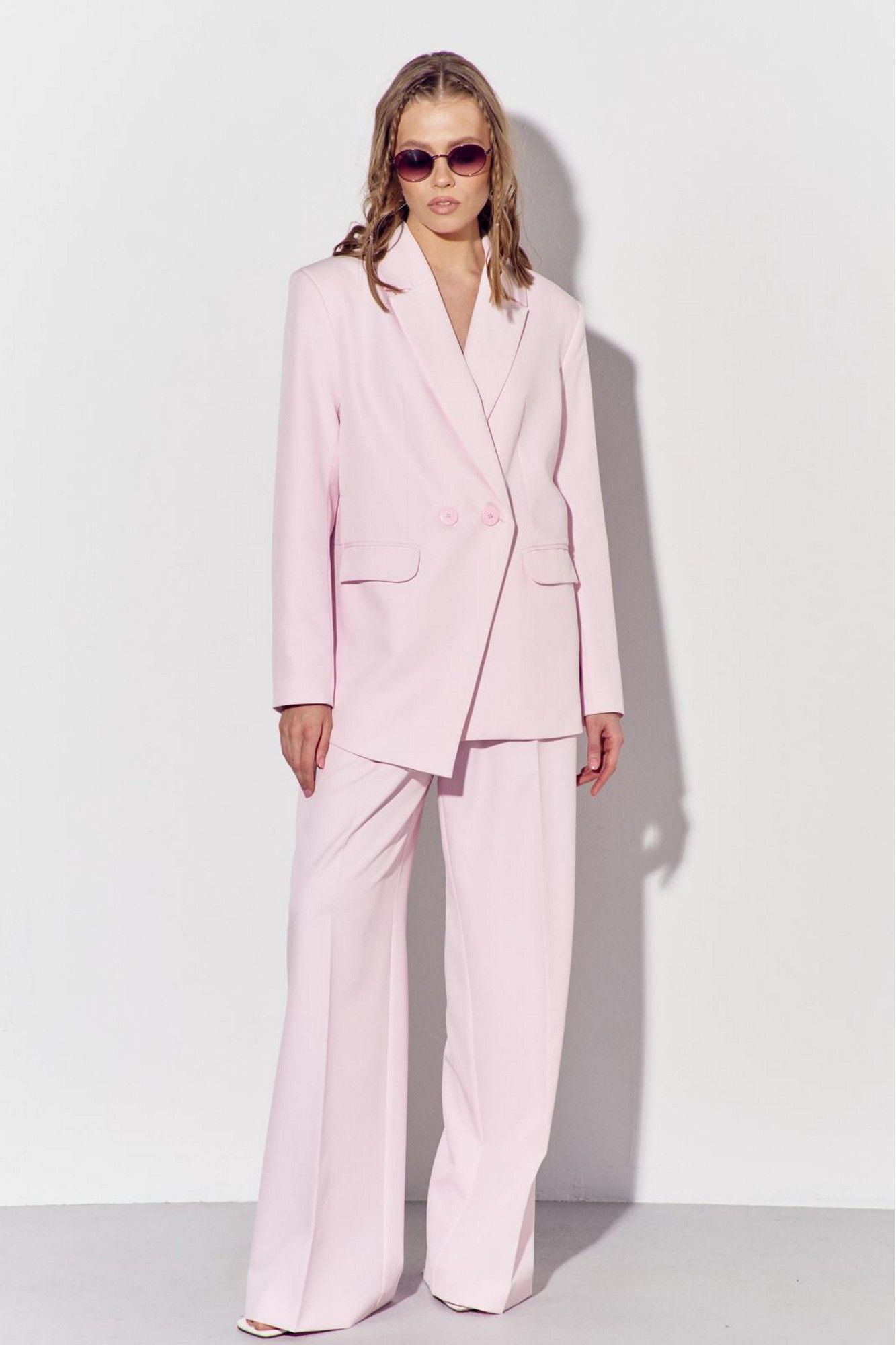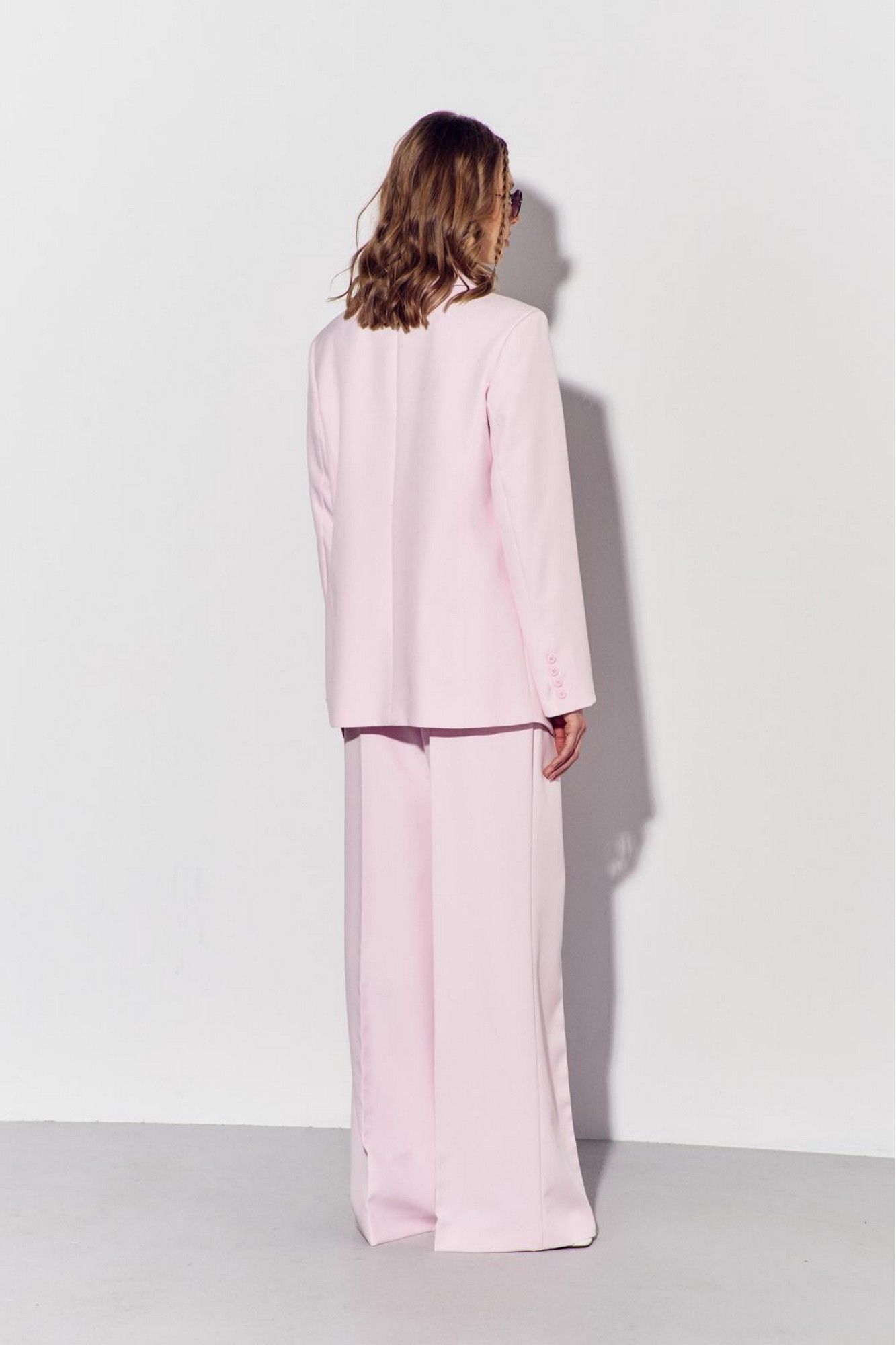 Костюм женский, состоящий из жакета и брюк. Жакет прямого силуэта с двубортной застежкой на 2 петли и пуговицы. Полочки - с прорезными карманами с клапаном и 2-мя обтачками, с нагрудными вытачками от кармана вверх. Низ переда асимметричный. Правая полочка удлинена к борту. Спинка со средним швом и рельефами от низа до проймы. Воротник пиджачного типа с отложными лацканами. Рукава длинные, втачные, 2-хшовные, с передним и локтевым швами. В нижней части локтевого шва обработана закрытая шлица с 4-мя пуговицами. Жакет на х/б подкладке и с плечевыми накладками. Брюки - палаццо с застежкой, с гульфиком и откоском на тесьму-молнию; с притачным поясом с резинкой по спинке. Пояс со шлевками (2 широкие -по переду и 3 узких по спинке). Пояс застегивается на потайной крючок. Передние половинки брюк со складками и боковыми карманами. Задние половинки брюк с талиевыми вытачками.