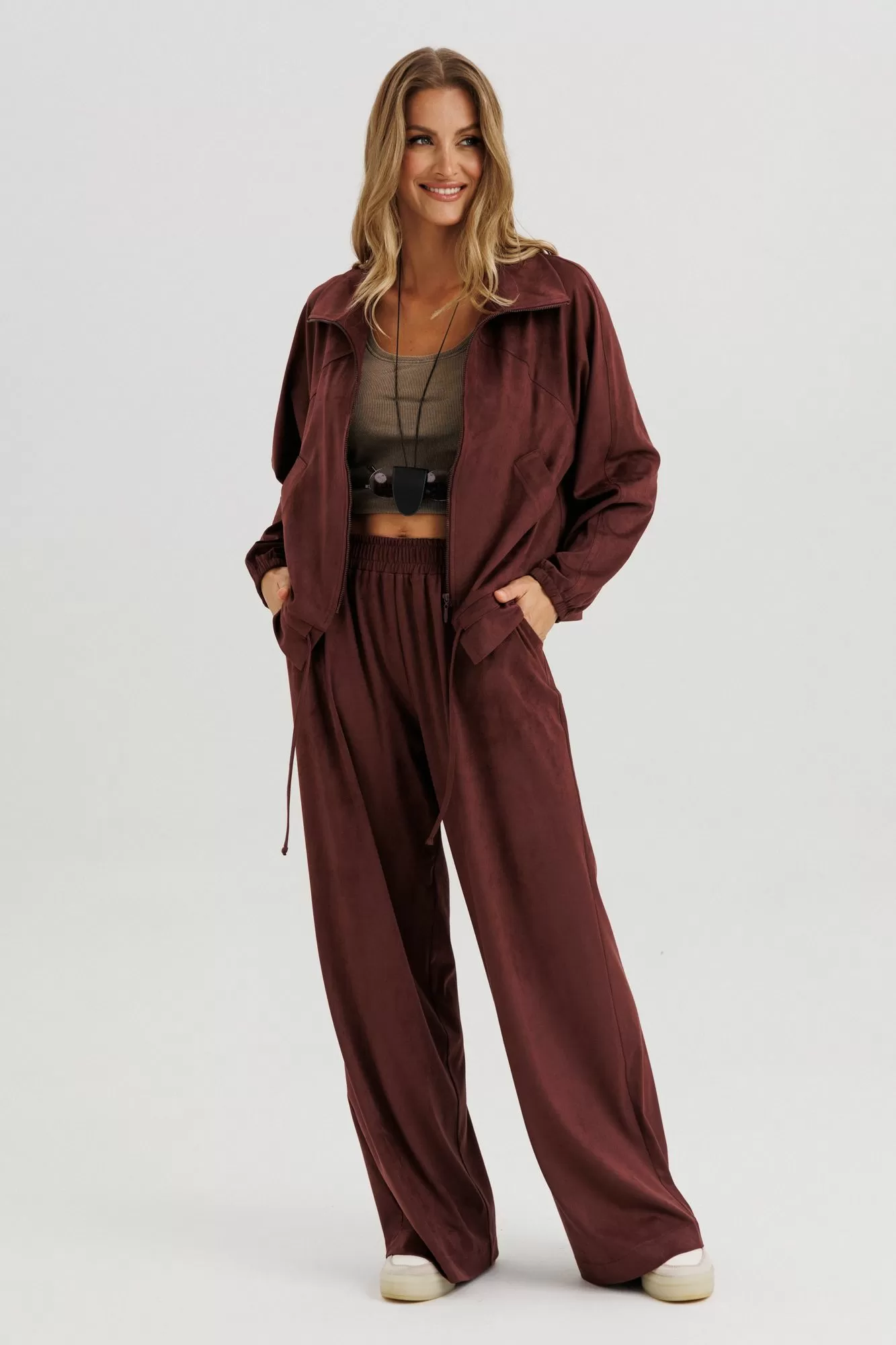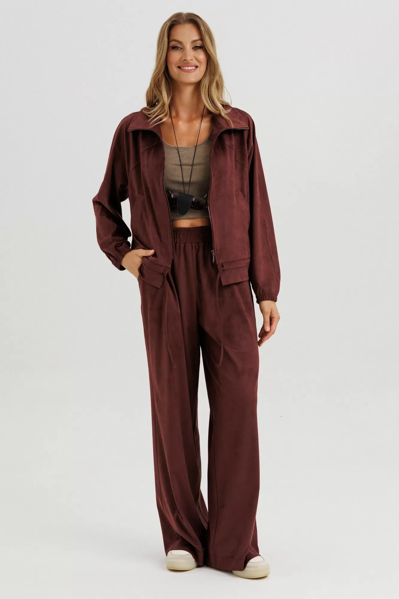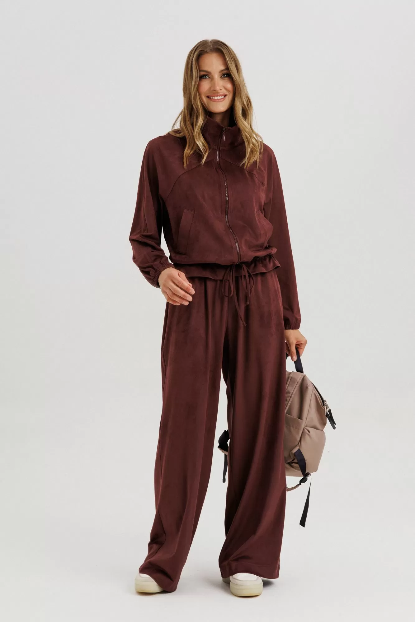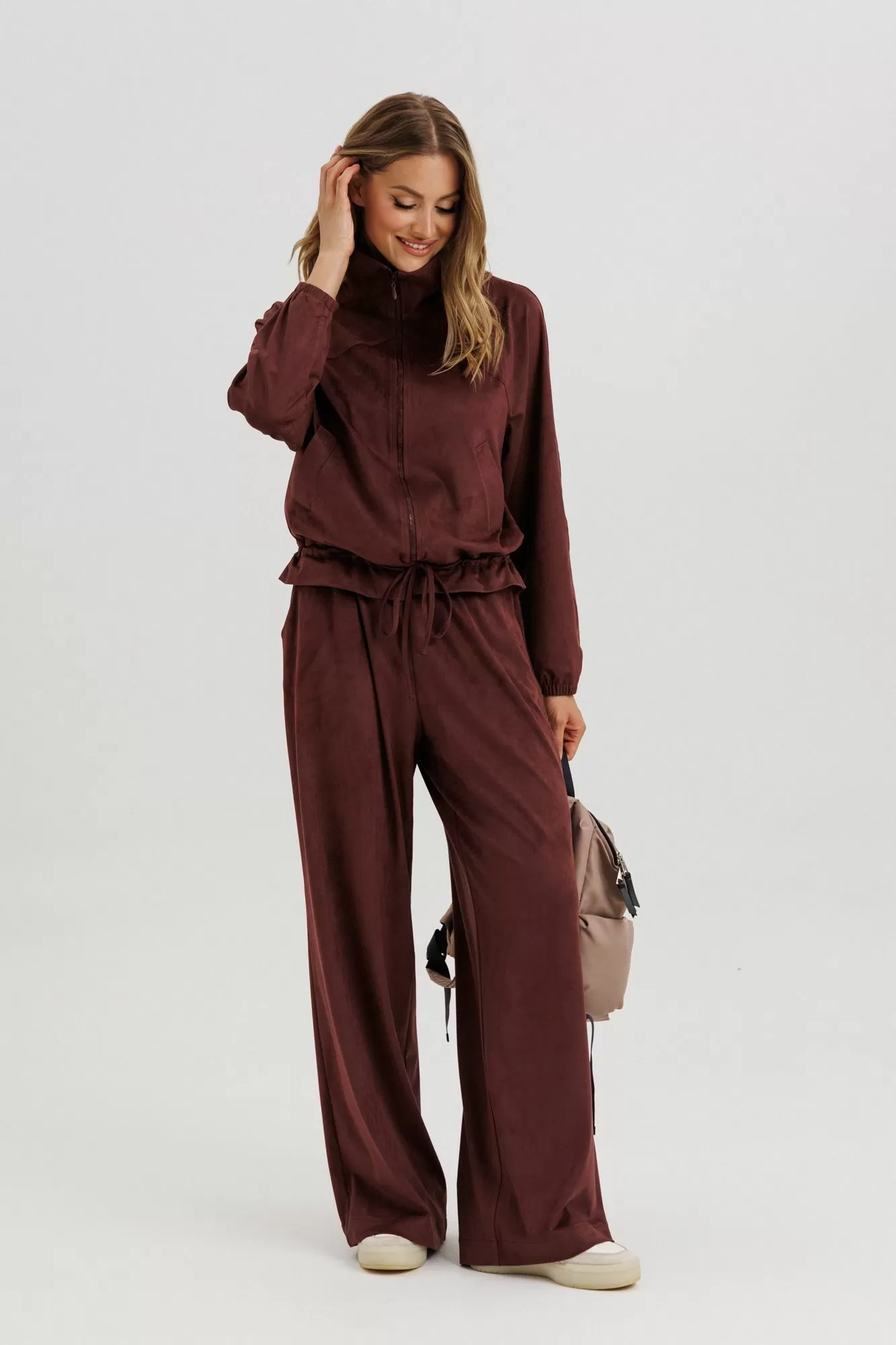 Костюм женский, состоящий из ветровки и брюк. Костюм выполнен из искусственной замши. Ветровка с центральной застежкой на тесьму-молнию, с притачной по низу планкой, с кулисой. По переду обработаны карманы с листочкой. Рукава - реглан, с нижним швом и вытачкой, с резинкой по низу. Воротник -стойка. Брюки с притачным поясом с резинкой. По поясу проложены 2 параллельных строчки. На передних половинках брюк обработаны боковые карманы