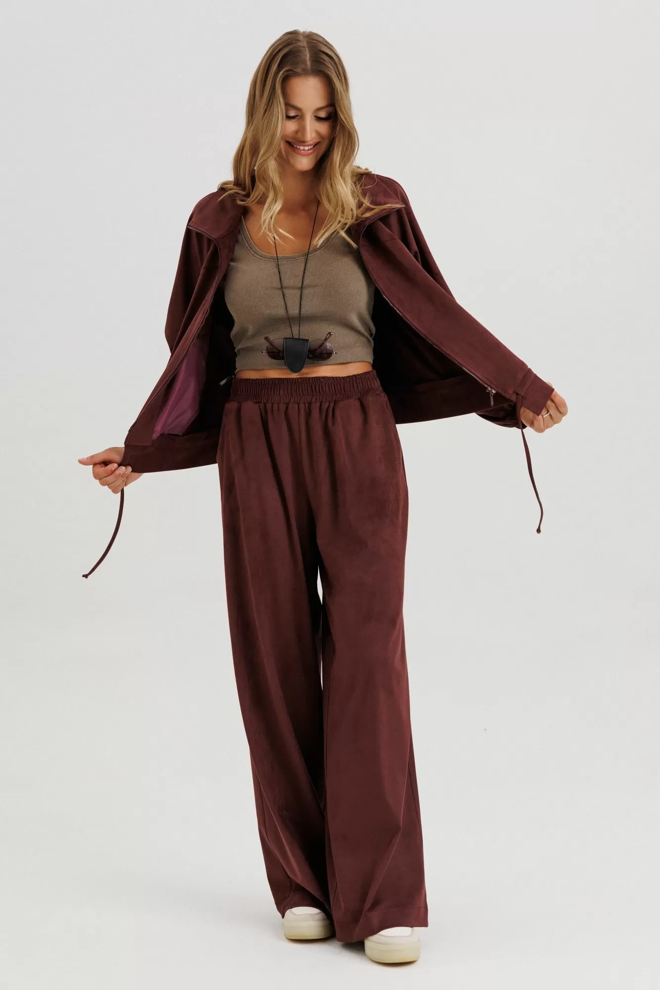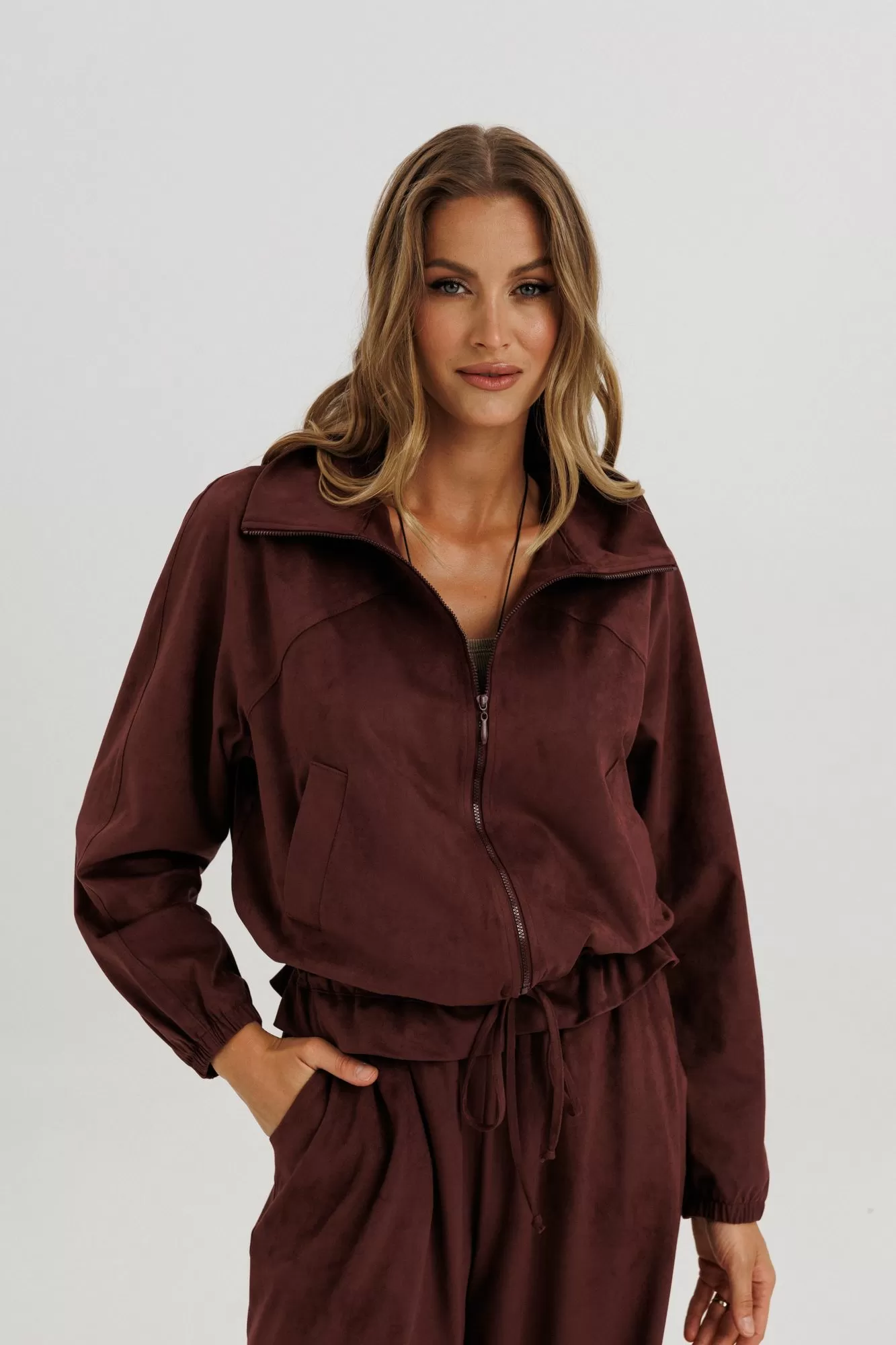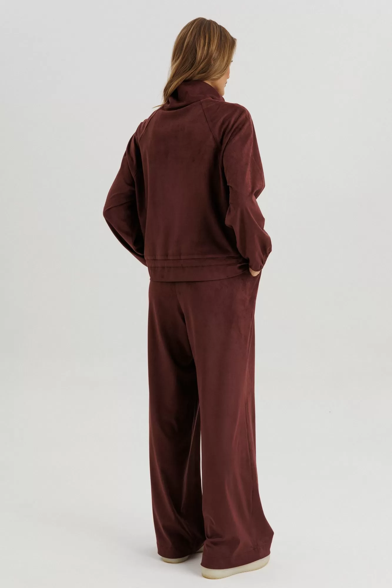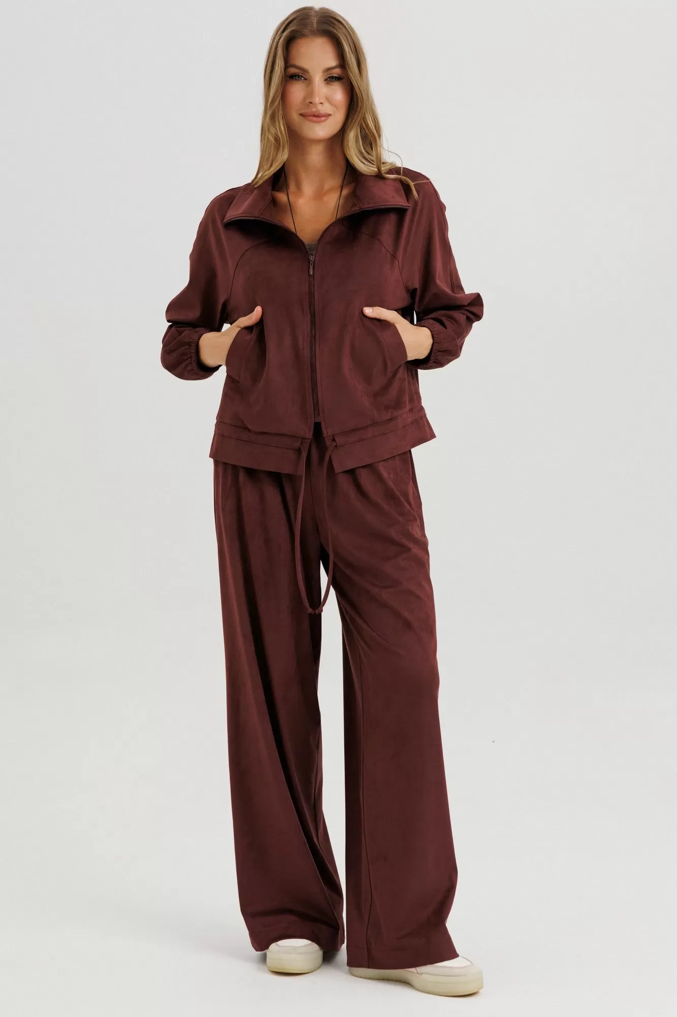 Костюм женский, состоящий из ветровки и брюк. Костюм выполнен из искусственной замши. Ветровка с центральной застежкой на тесьму-молнию, с притачной по низу планкой, с кулисой. По переду обработаны карманы с листочкой. Рукава - реглан, с нижним швом и вытачкой, с резинкой по низу. Воротник -стойка. Брюки с притачным поясом с резинкой. По поясу проложены 2 параллельных строчки. На передних половинках брюк обработаны боковые карманы
