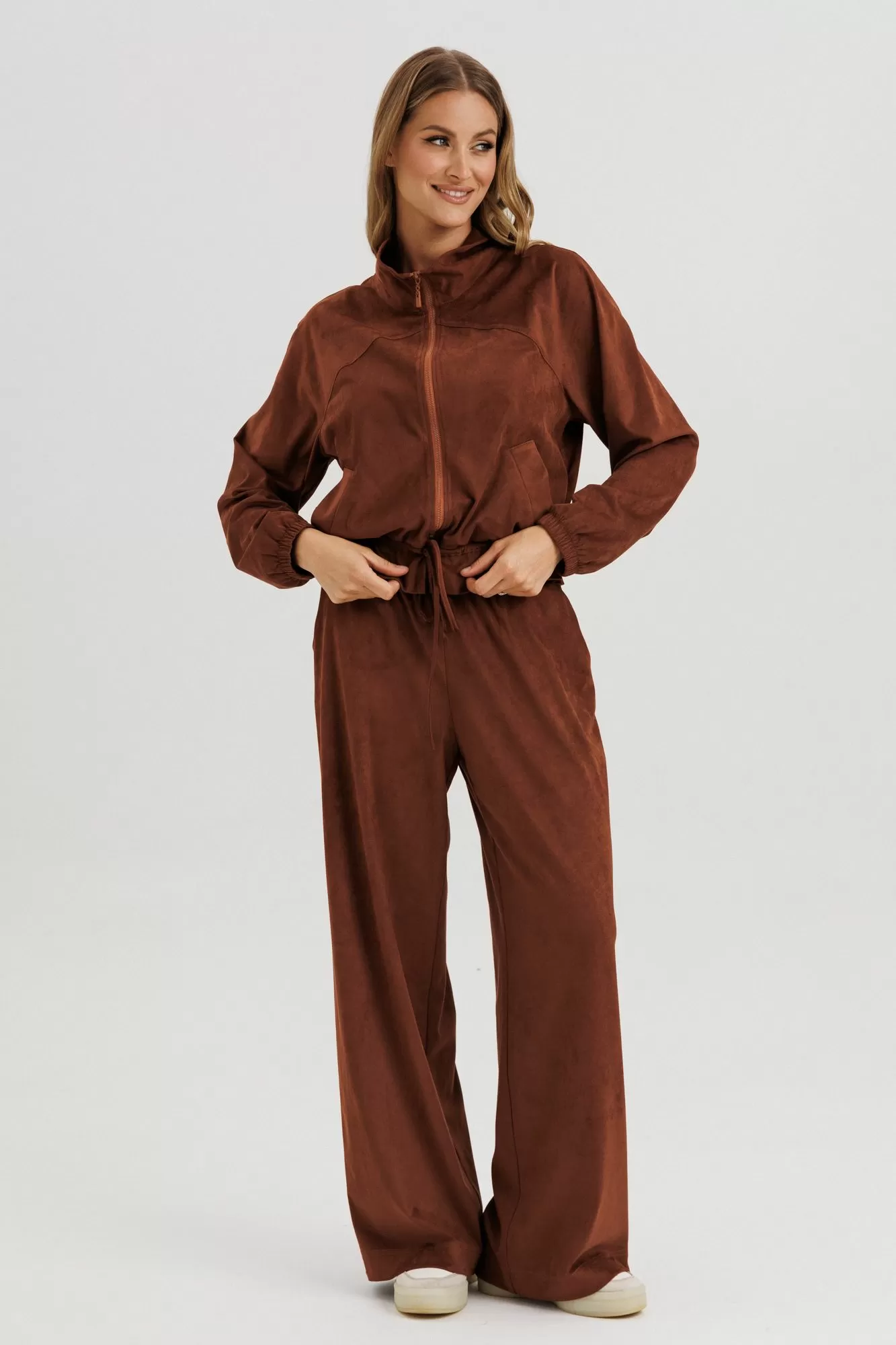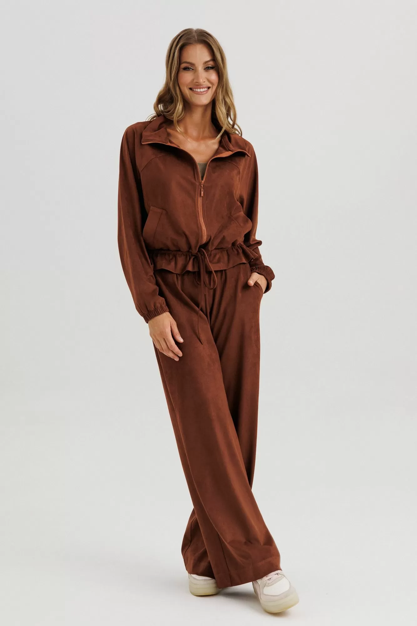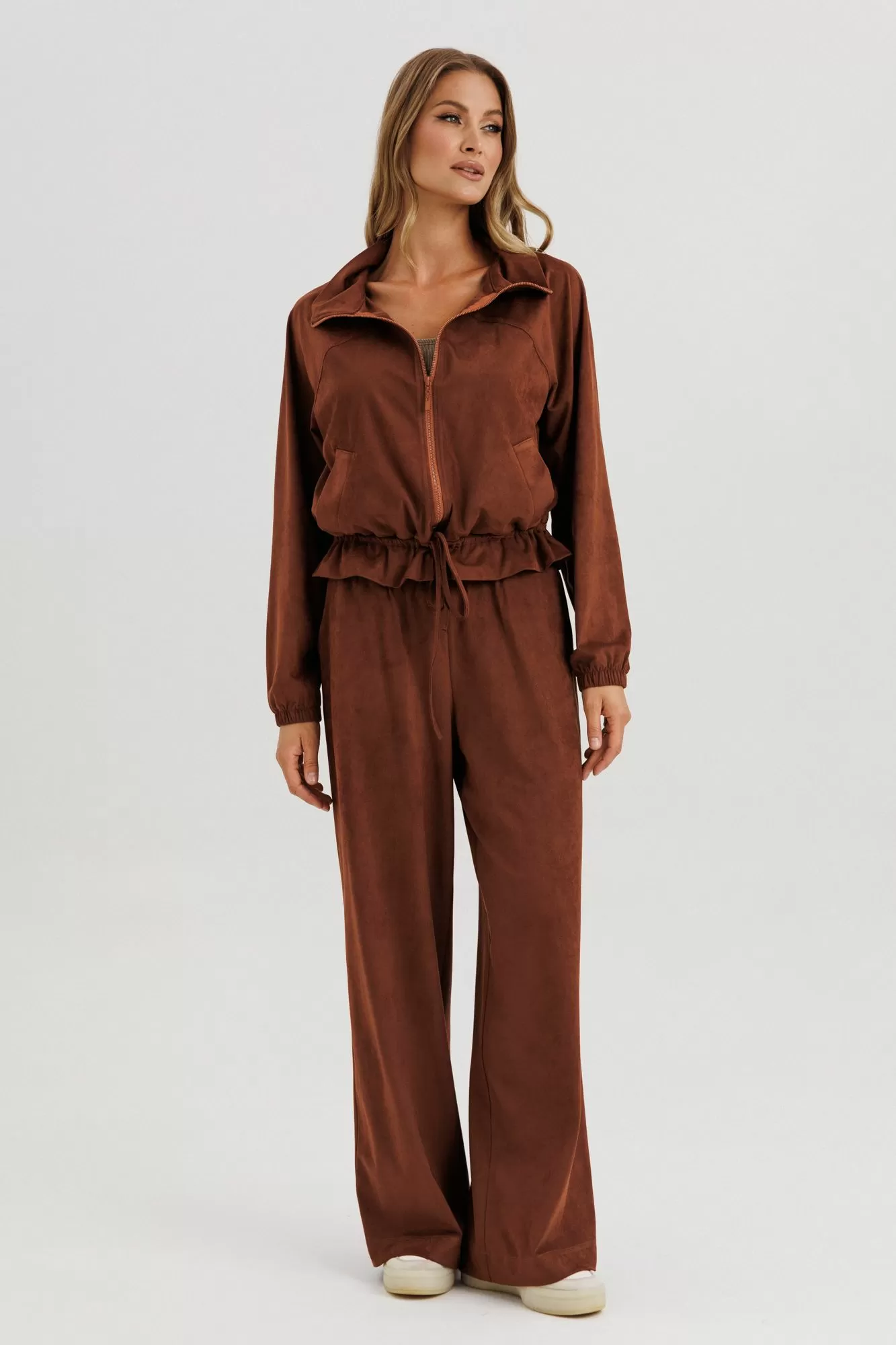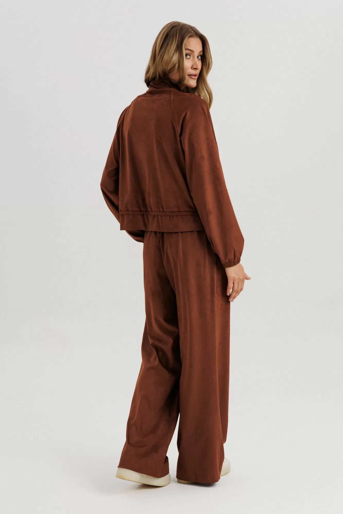 Костюм женский, состоящий из ветровки и брюк. Костюм выполнен из искусственной замши. Ветровка с центральной застежкой на тесьму-молнию, с притачной по низу планкой, с кулисой. По переду обработаны карманы с листочкой. Рукава - реглан, с нижним швом и вытачкой, с резинкой по низу. Воротник -стойка. Брюки с притачным поясом с резинкой. По поясу проложены 2 параллельных строчки. На передних половинках брюк обработаны боковые карманы