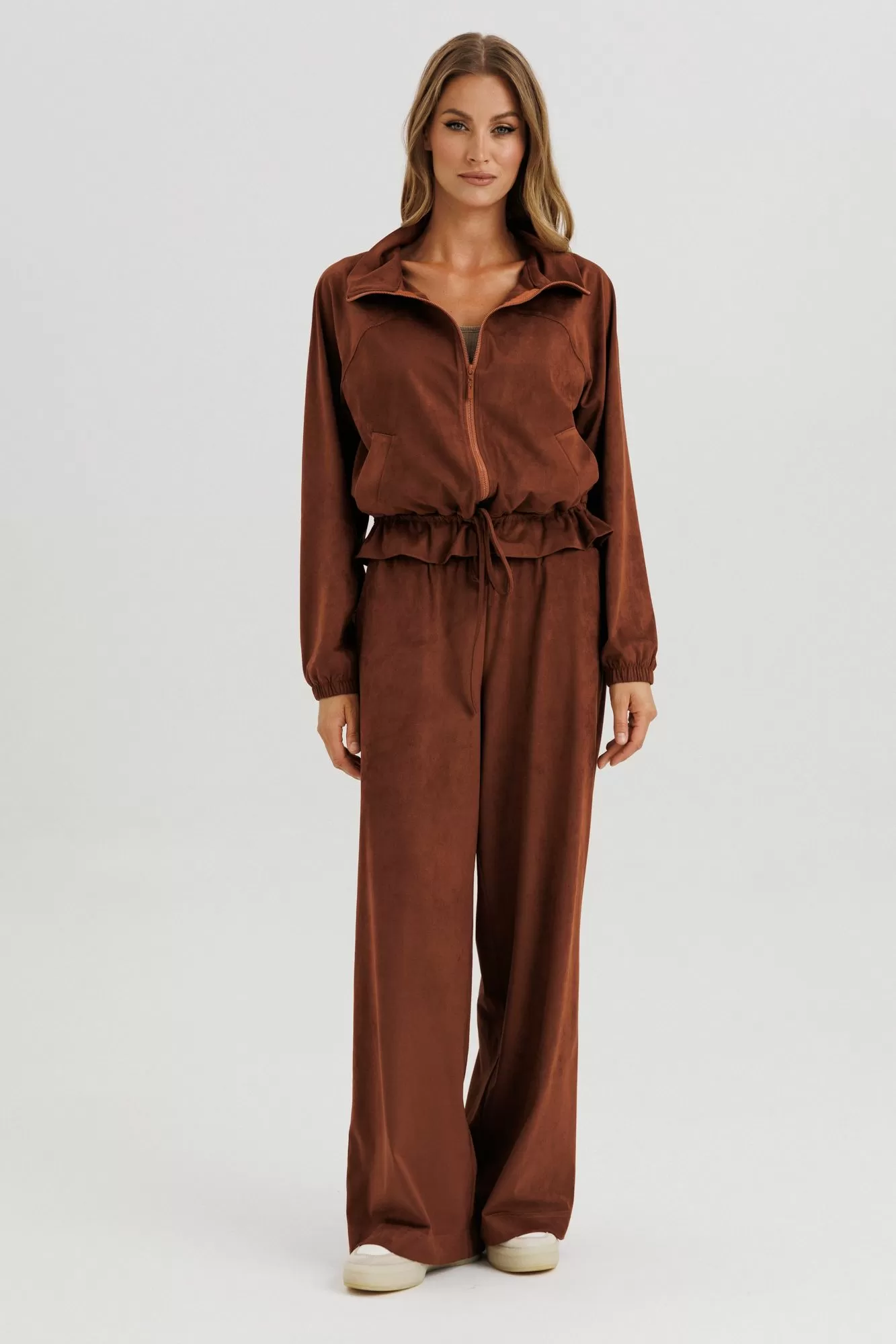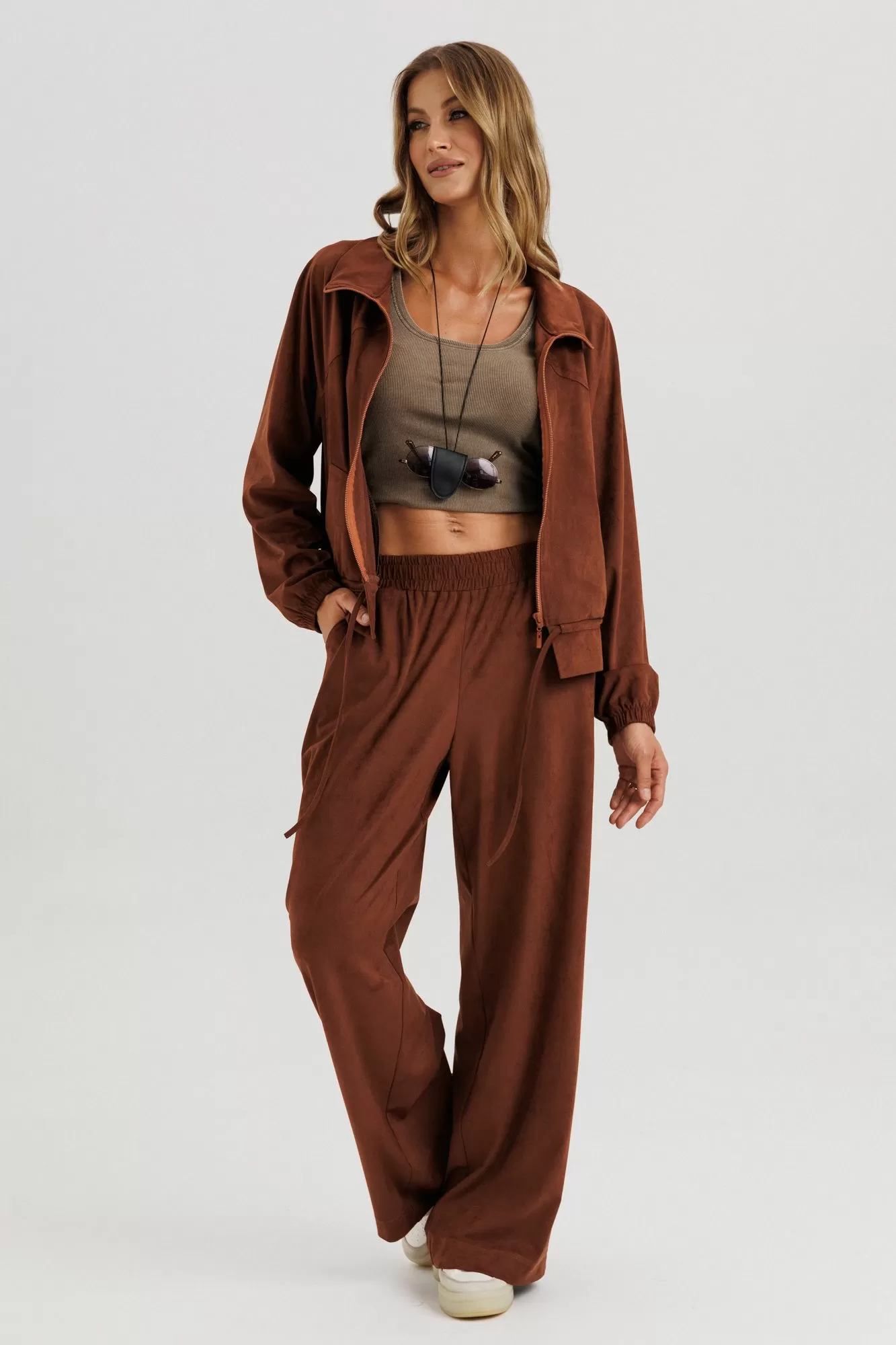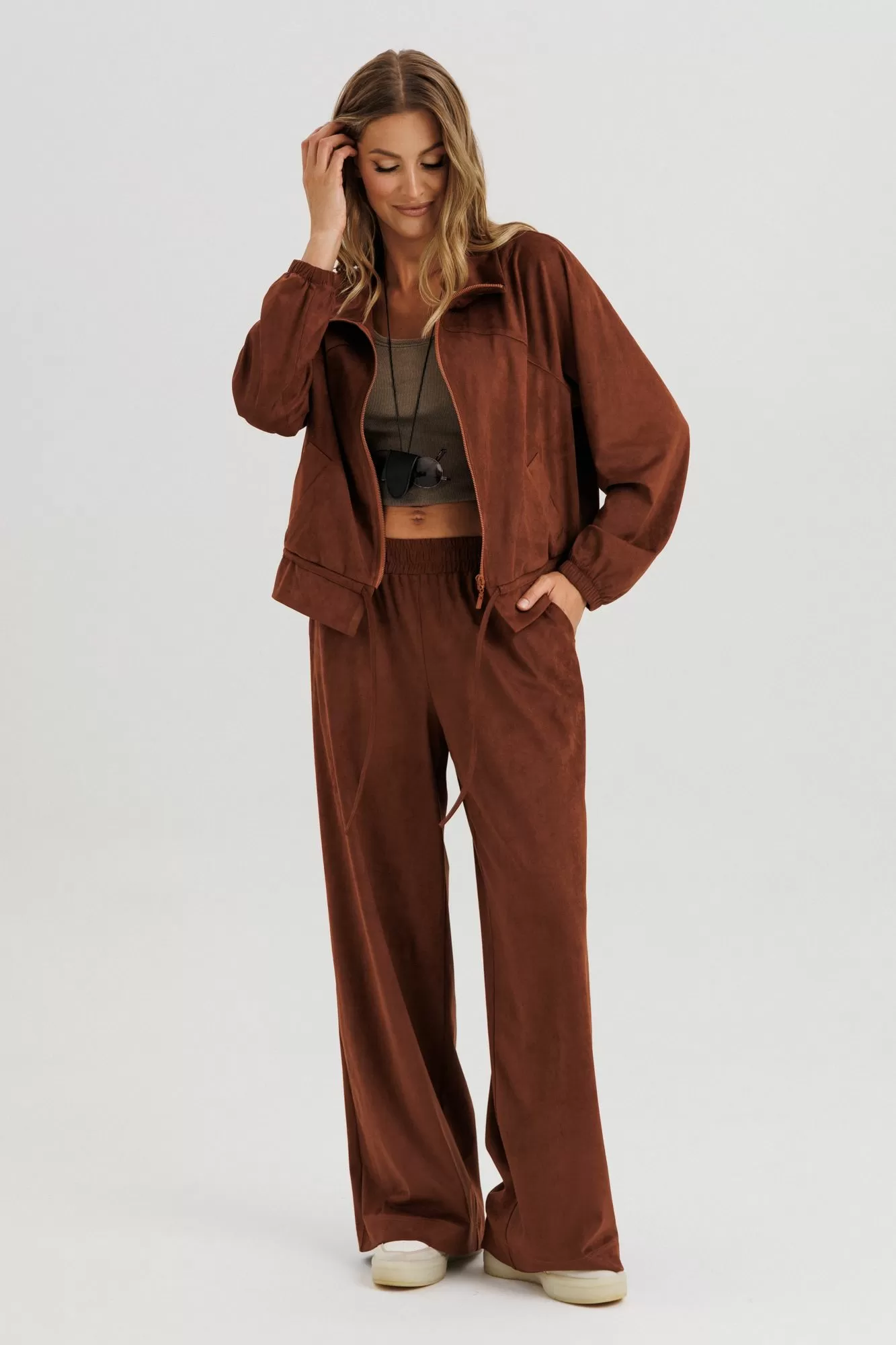 Костюм женский, состоящий из ветровки и брюк. Костюм выполнен из искусственной замши. Ветровка с центральной застежкой на тесьму-молнию, с притачной по низу планкой, с кулисой. По переду обработаны карманы с листочкой. Рукава - реглан, с нижним швом и вытачкой, с резинкой по низу. Воротник -стойка. Брюки с притачным поясом с резинкой. По поясу проложены 2 параллельных строчки. На передних половинках брюк обработаны боковые карманы
