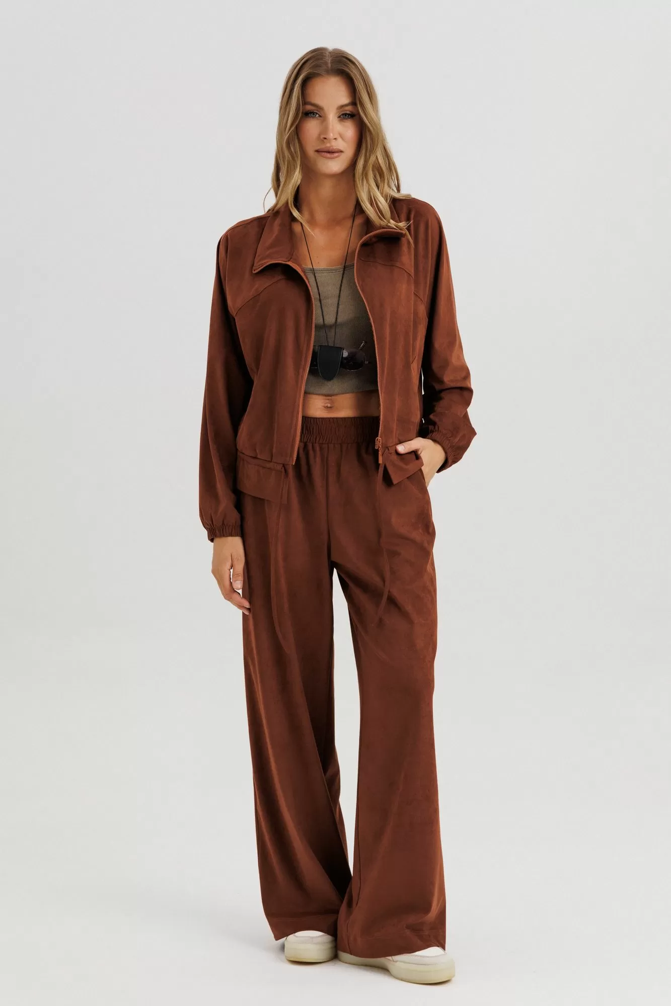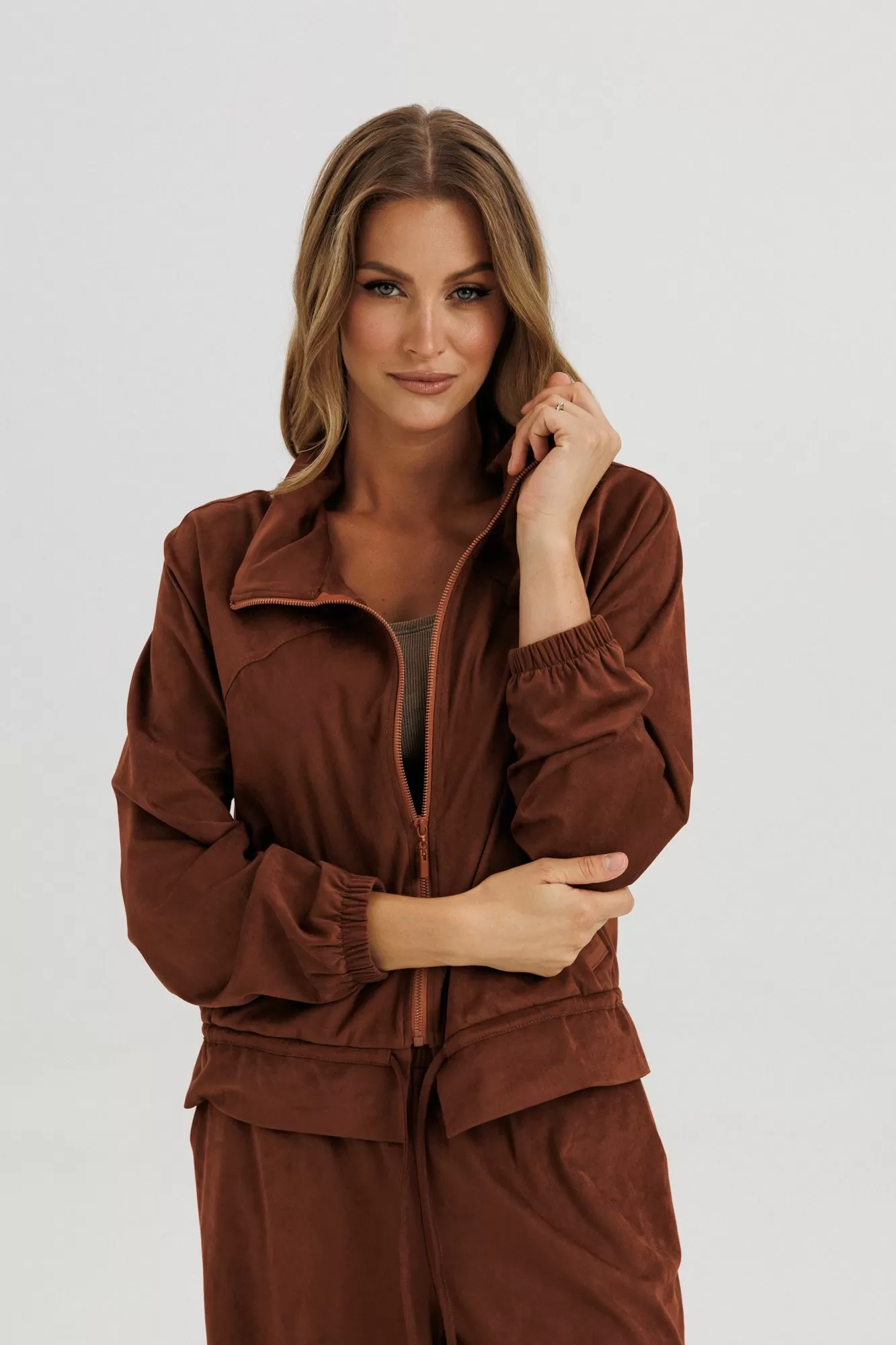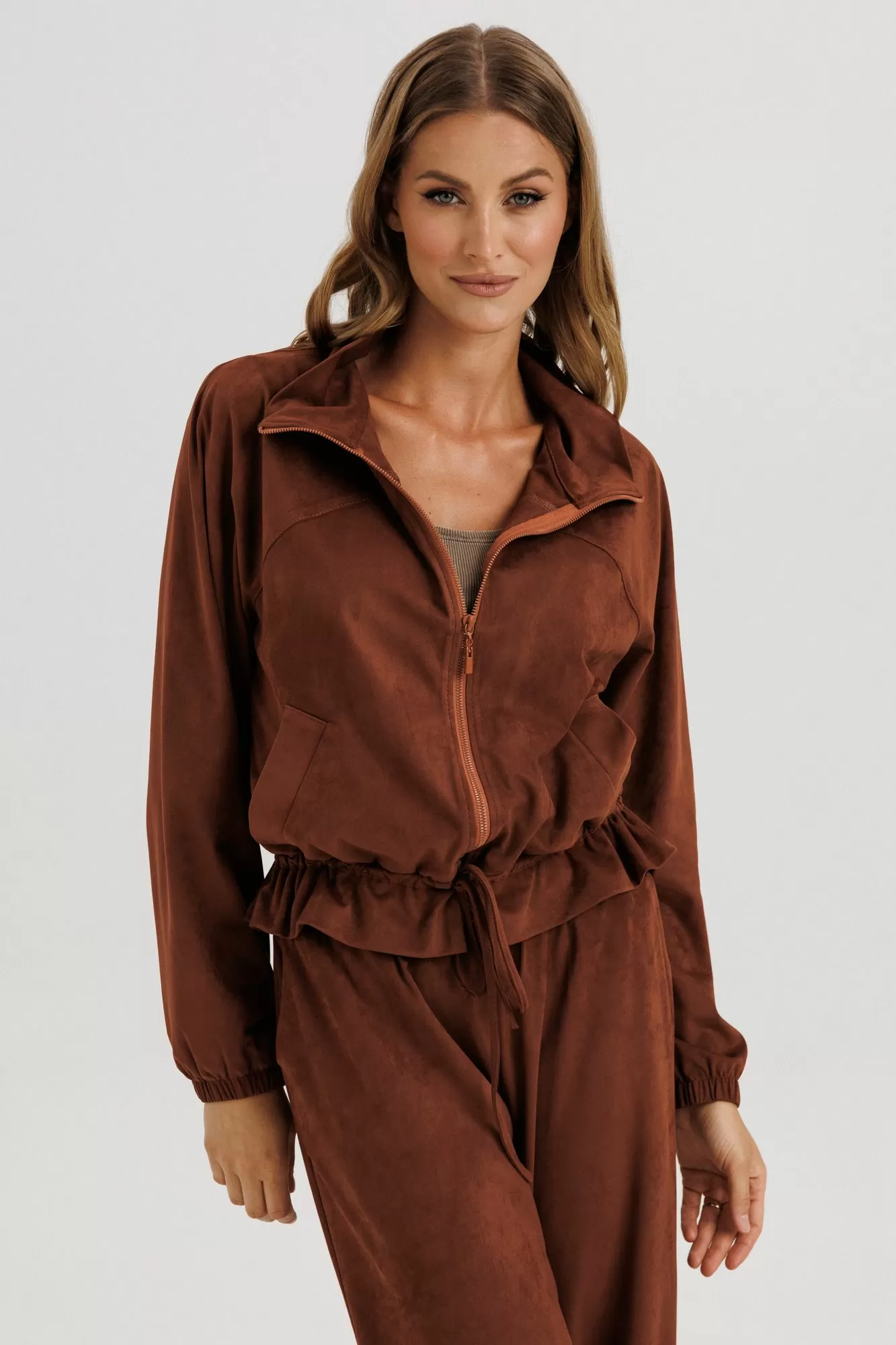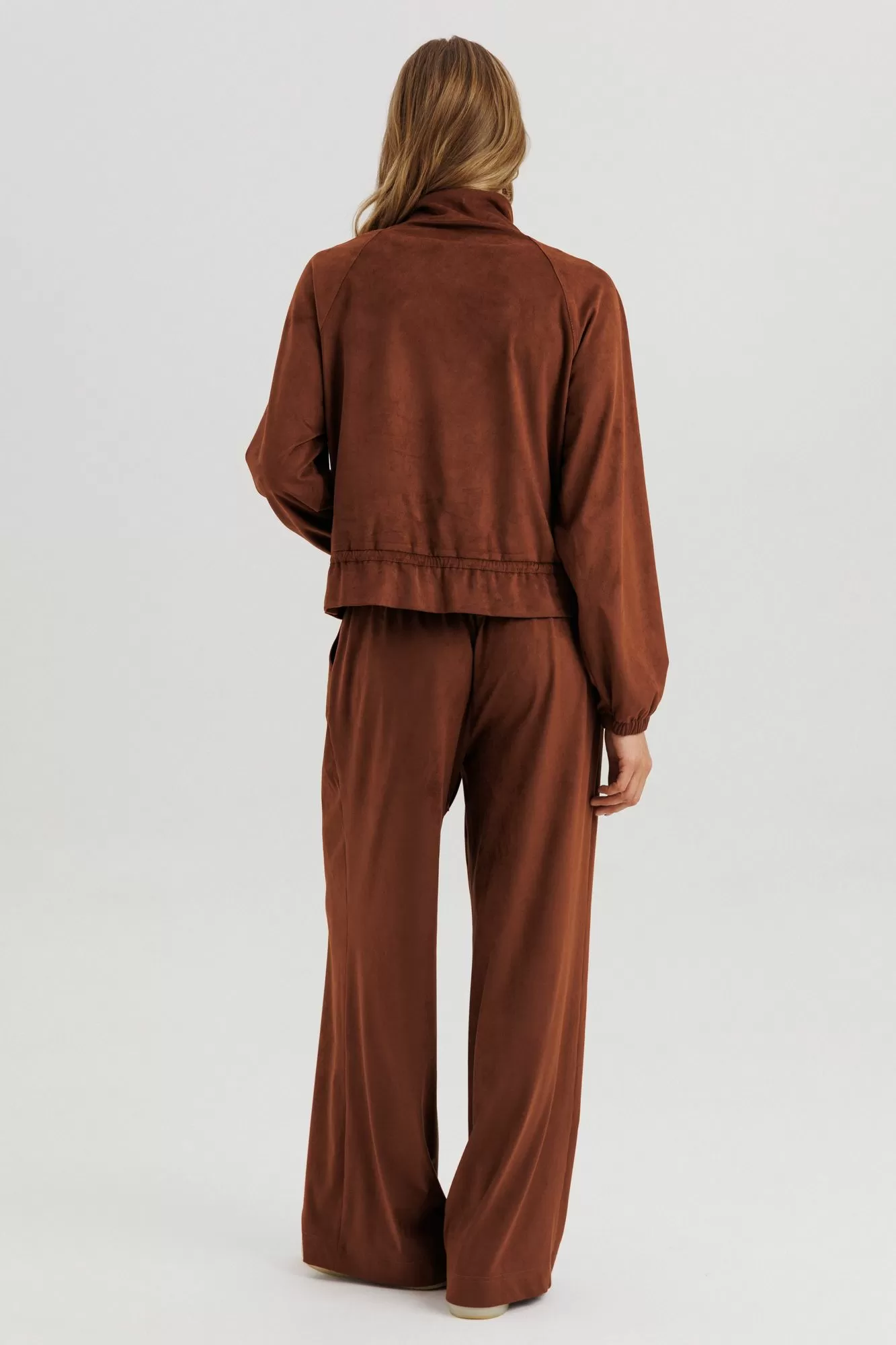 Костюм женский, состоящий из ветровки и брюк. Костюм выполнен из искусственной замши. Ветровка с центральной застежкой на тесьму-молнию, с притачной по низу планкой, с кулисой. По переду обработаны карманы с листочкой. Рукава - реглан, с нижним швом и вытачкой, с резинкой по низу. Воротник -стойка. Брюки с притачным поясом с резинкой. По поясу проложены 2 параллельных строчки. На передних половинках брюк обработаны боковые карманы