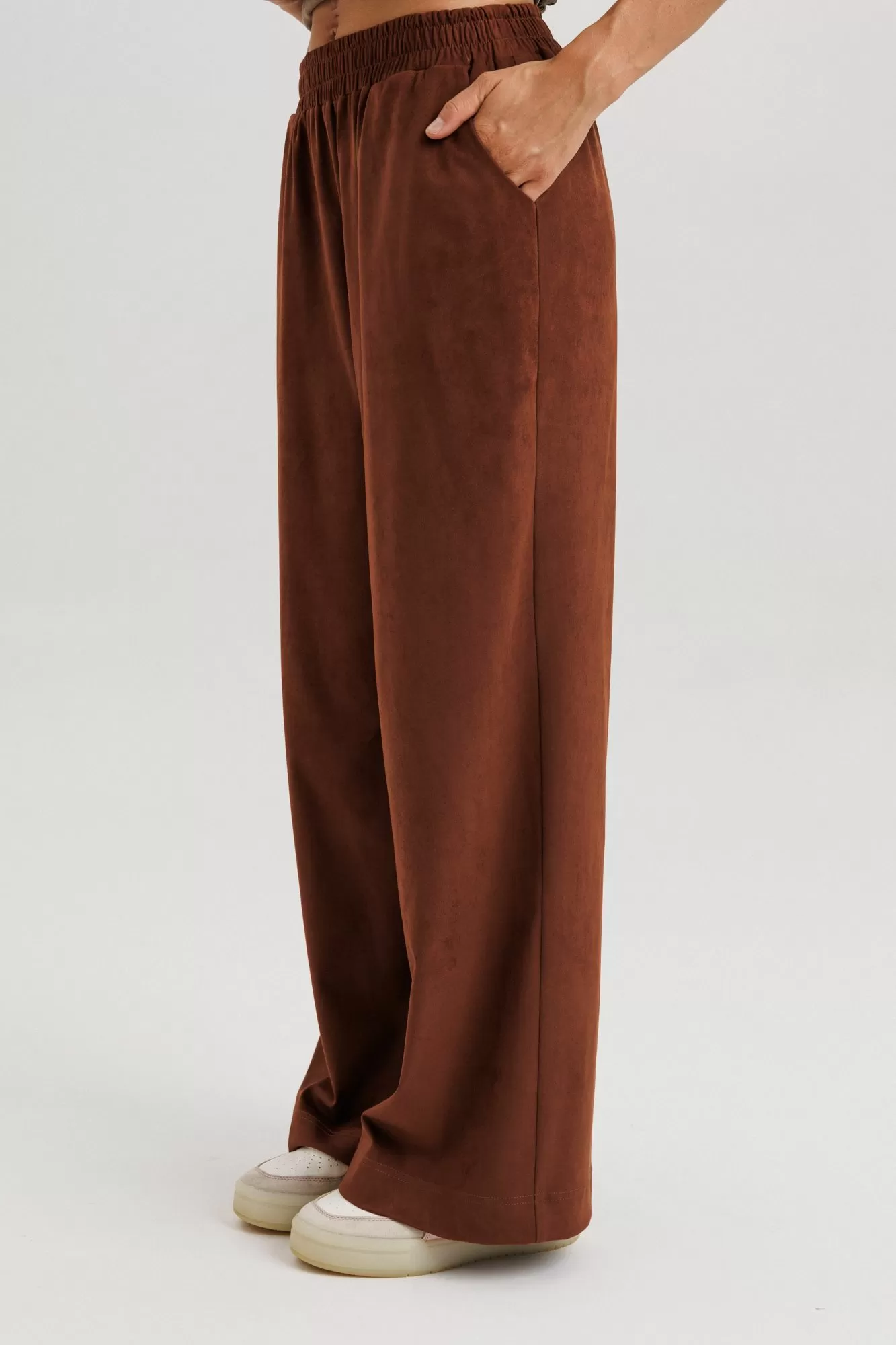 Брюки-палаццо с притачным поясом с резинкой. По поясу проложены 2 параллельных строчки. Брюки выполнены из искусственной замши. На передних половинках брюк обработаны боковые карманы. Задние половинки брюк без конструктивных особенностей.