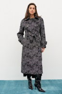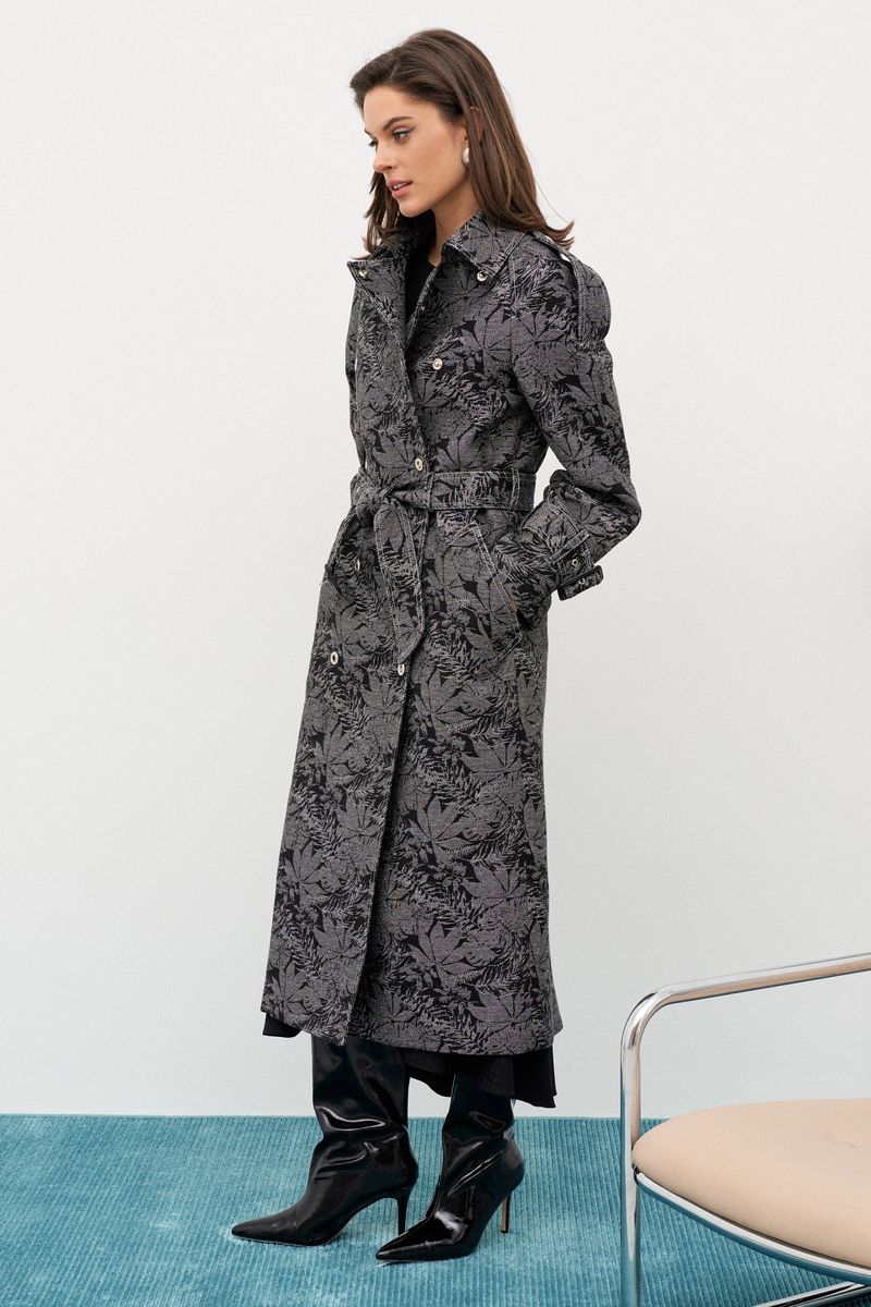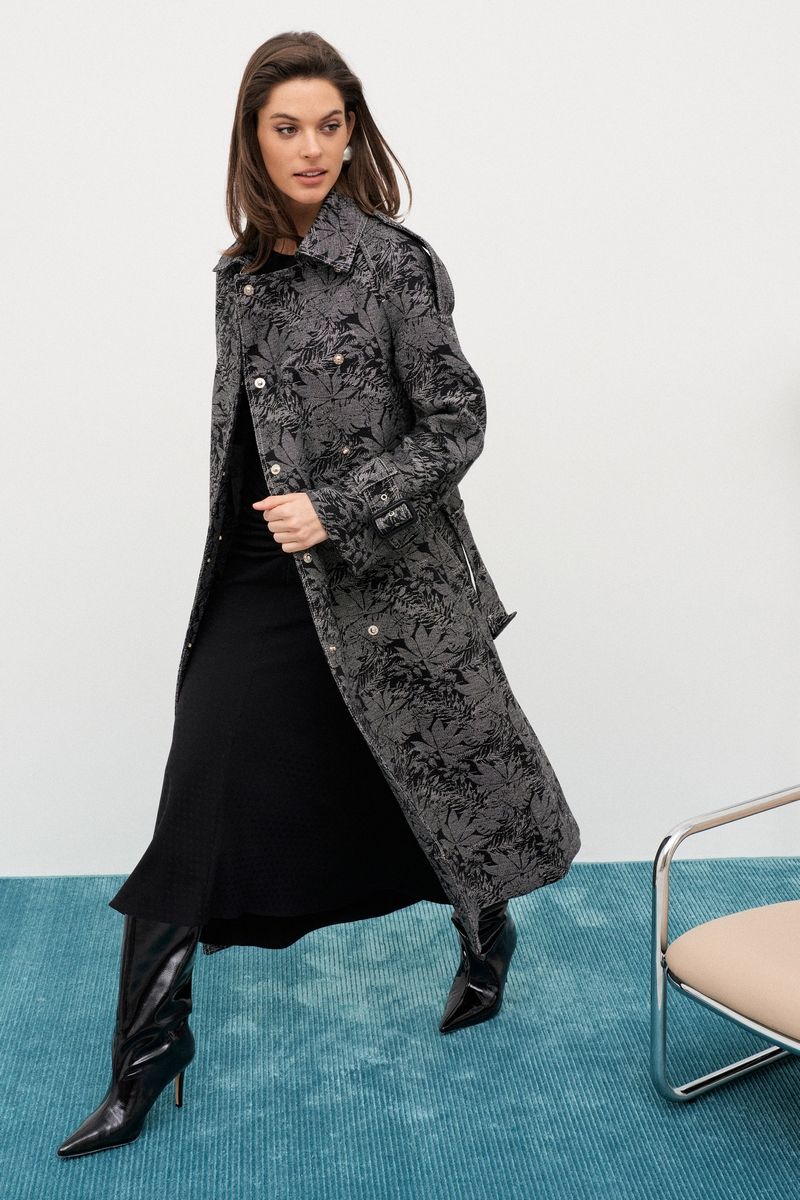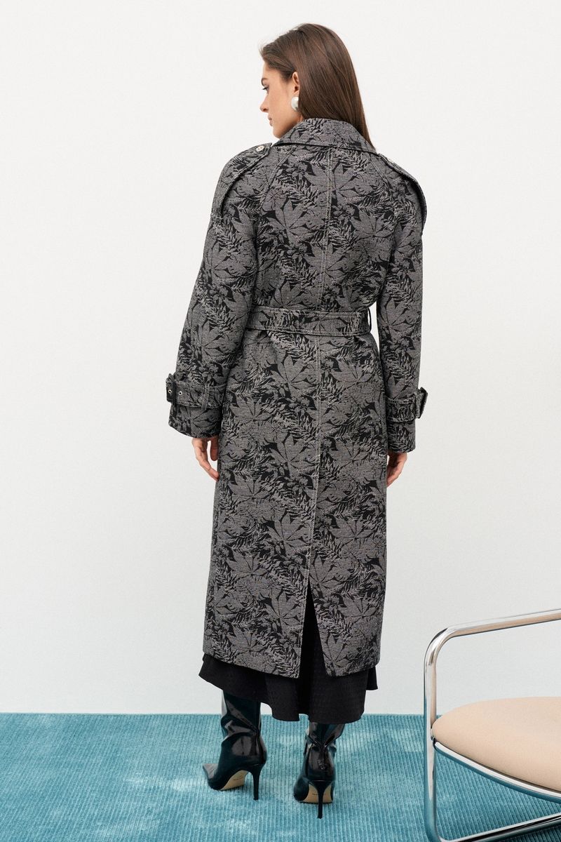 Утепленное пальто-тренчкот длиной 115 см Рукав покроя реглан длиной 75 см Застежка двубортная на металлические кнопки Наклонные карманы с листочками Спинка со средним швом и шлицей Воротник стояче-отложной Погоны по плечевым швам, пояс с пряжкой по талии, паты с пряжками на рукавах Пряжки из натуральной кожи Пальто на стеганой подкладке с утеплителем