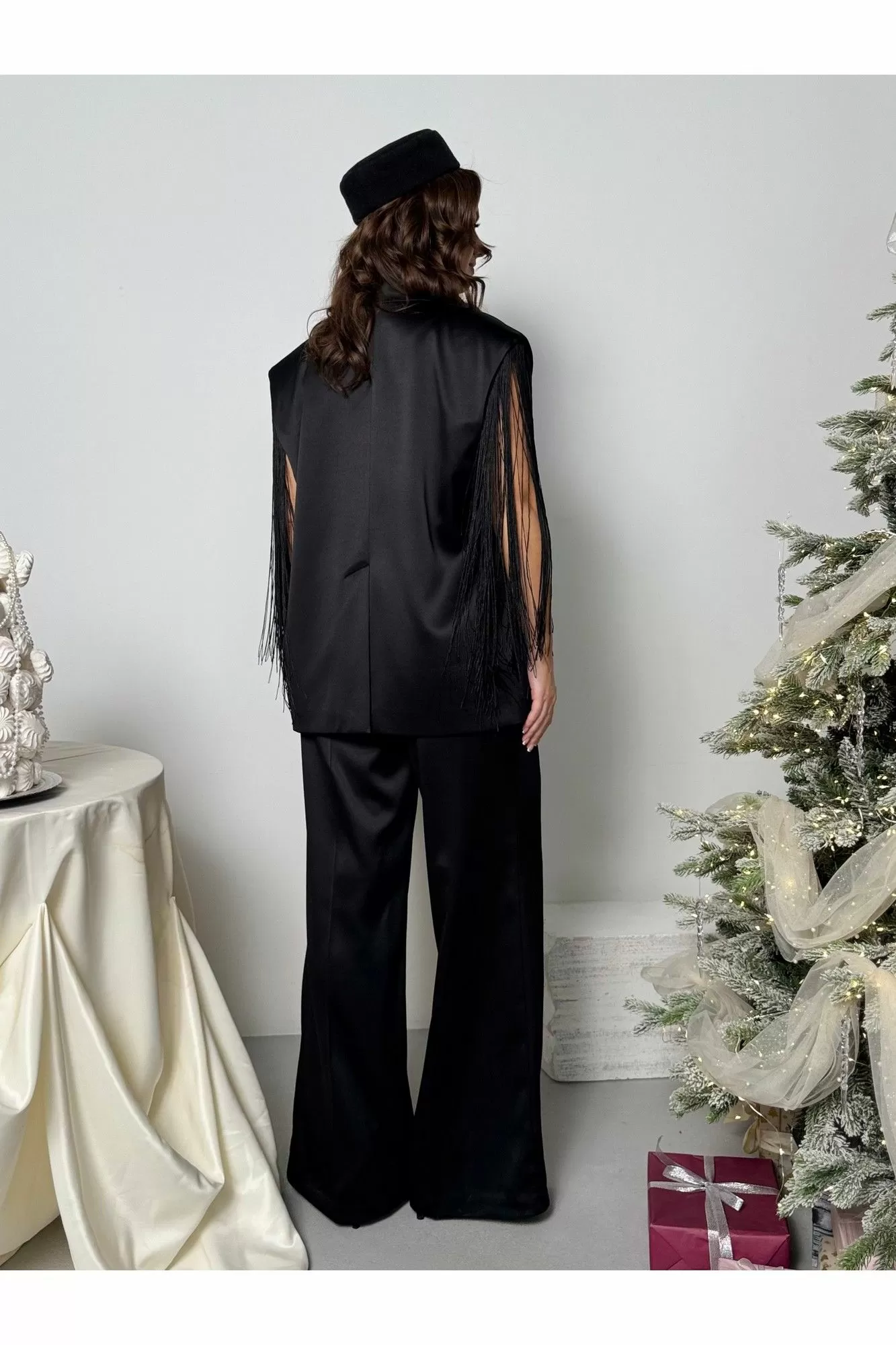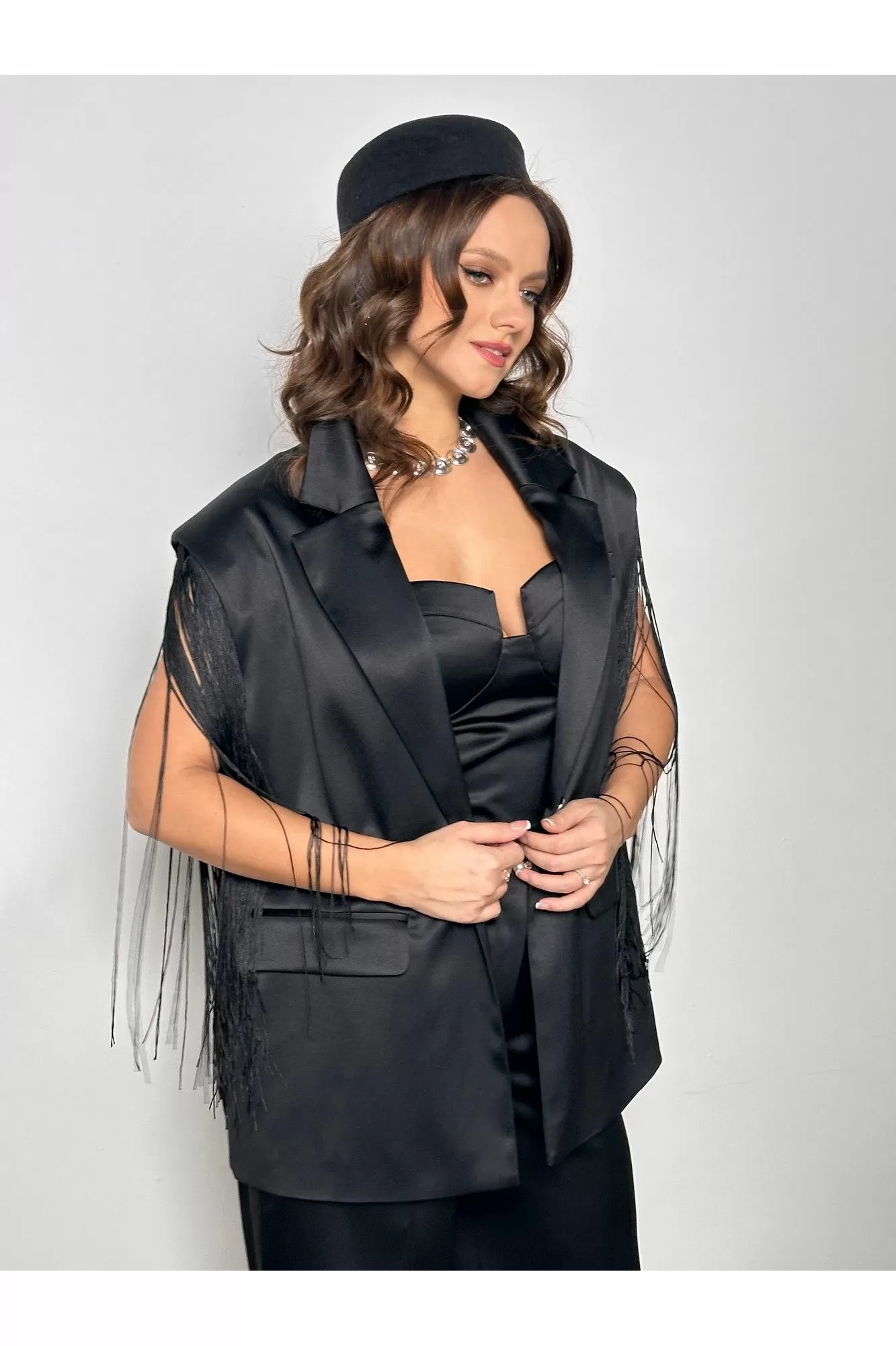 Классический прямой жилет удлиненного кроя, создающий утонченный силуэт. Модель выполнена на подкладке для идеальной посадки и комфорта. Детали подчеркивают его статусность: отложной воротник с лацканами, прорезные карманы с клапанами и центральная застежка на пуговицу. Уникальность жилету придают съемные декоративные элементы с бахромой на проймах и элегантная шлица на спинке. Идеальная вещь для создания стильного многослойного образа.