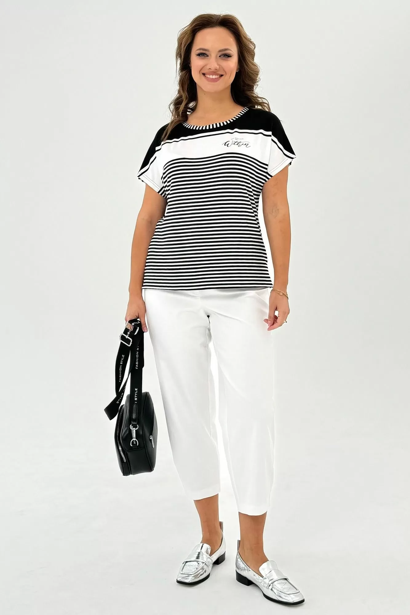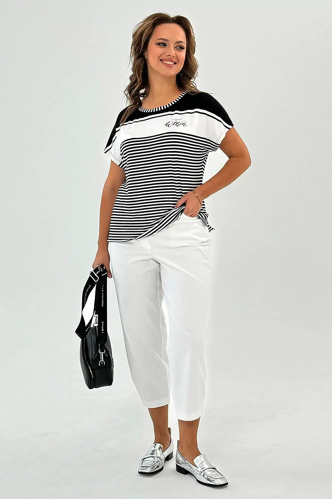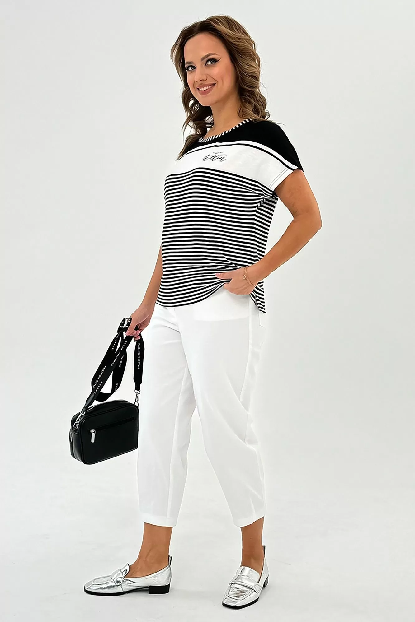 Данная футболка представляет собой свободную посадку и изготовлена из комфортного трикотажного хлопкового полотна. Горловина имеет лодочку, что придает ей шик и элегантность. Короткий рукав цельновыкроенный, что обеспечивает свободу движений. Для большего комфорта и оригинальности в боковых швах предусмотрены разрезы. Эта футболка идеально сочетается с любым низом: юбкой, брюками, джинсами, шортами, что позволяет создавать различные стильные образы. Длина изделия по спинке составляет 61 см. Благодаря своей универсальности, эта модель футболки станет незаменимой вещью в вашем гардеробе, подходящей как для спортивного образа, так и для повседневного, а также для нарядных случаев.