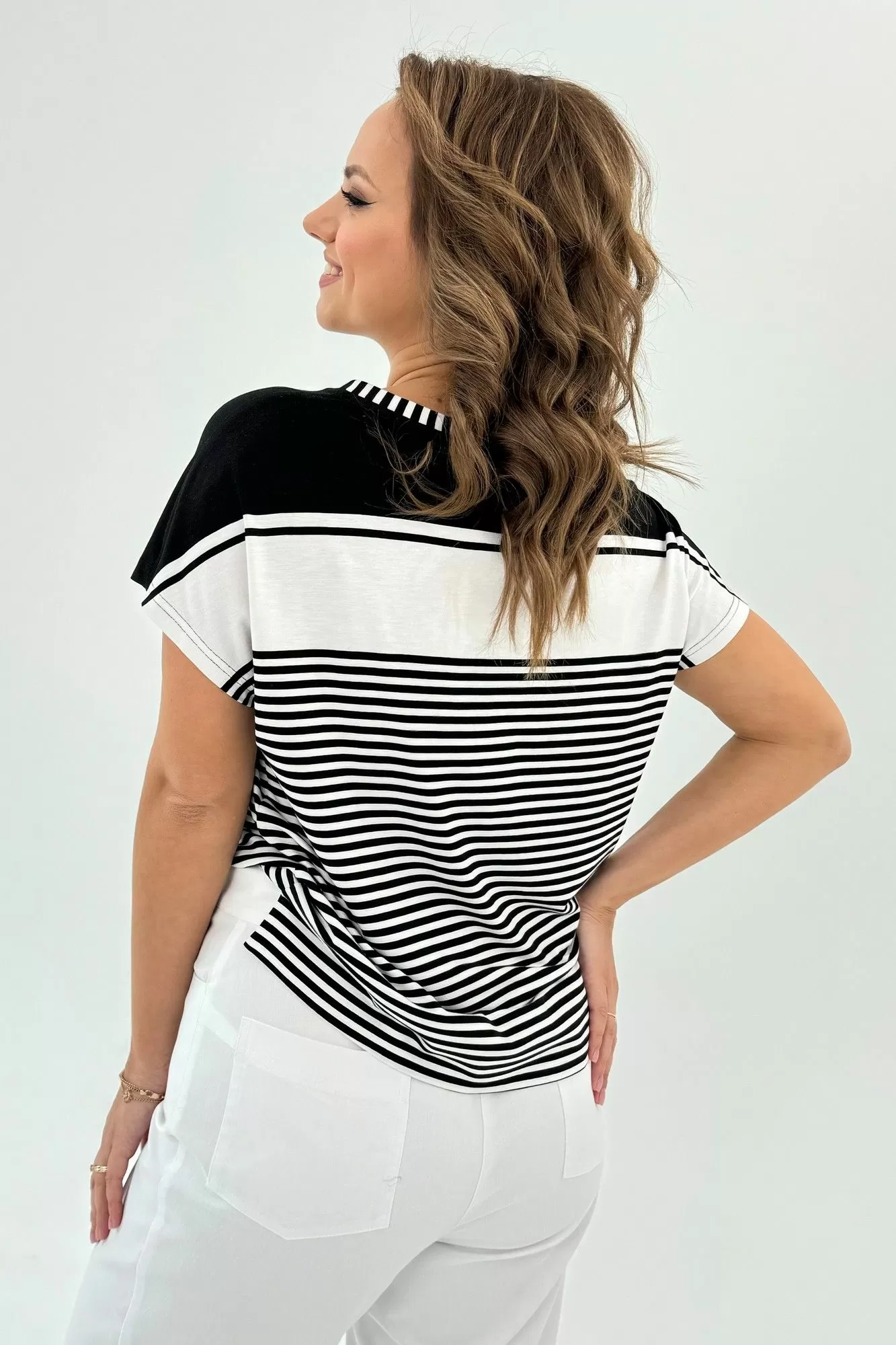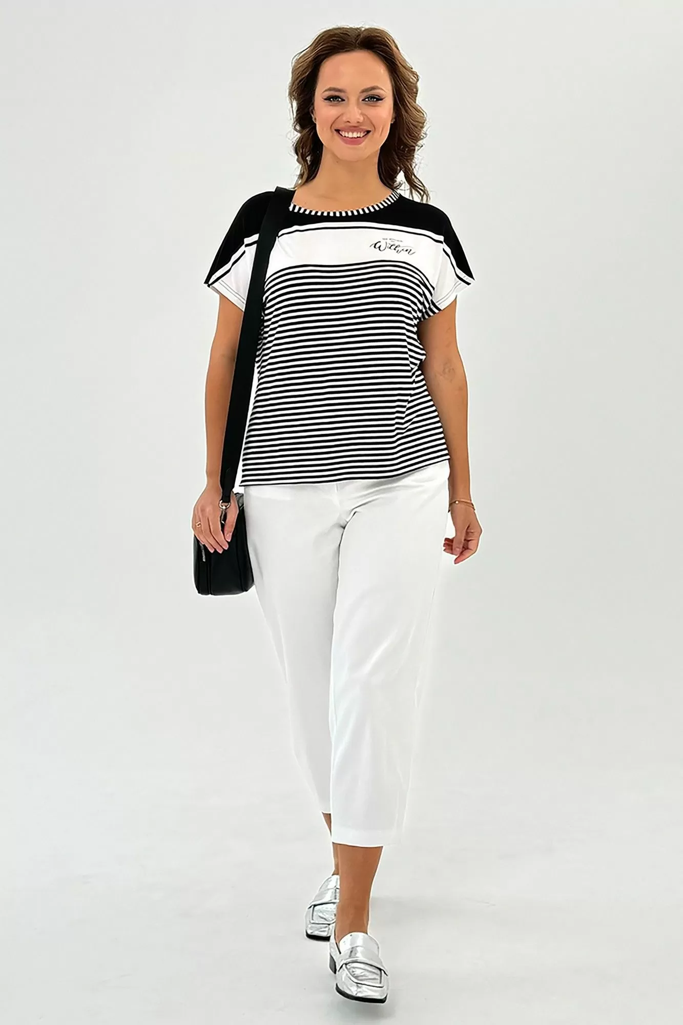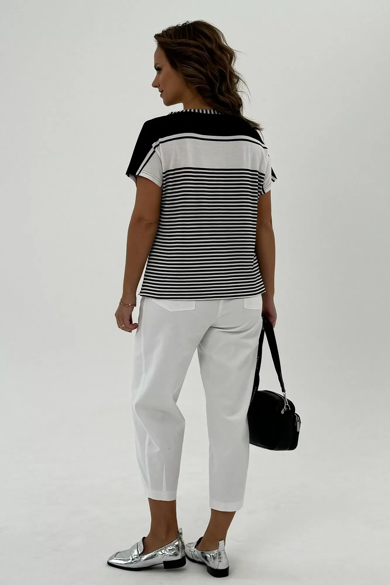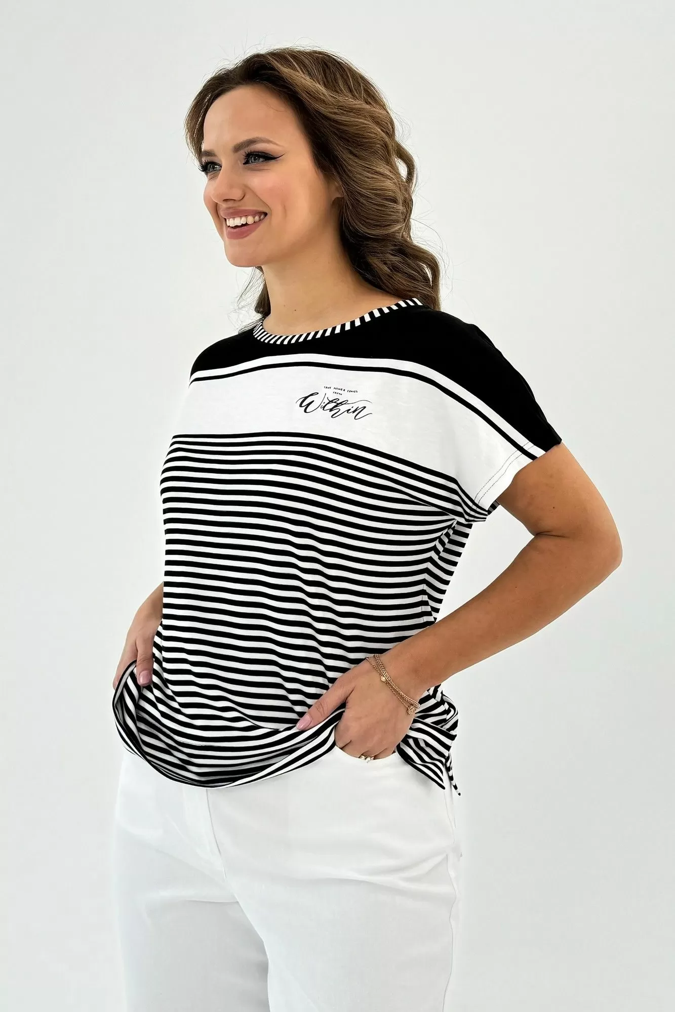 Данная футболка представляет собой свободную посадку и изготовлена из комфортного трикотажного хлопкового полотна. Горловина имеет лодочку, что придает ей шик и элегантность. Короткий рукав цельновыкроенный, что обеспечивает свободу движений. Для большего комфорта и оригинальности в боковых швах предусмотрены разрезы. Эта футболка идеально сочетается с любым низом: юбкой, брюками, джинсами, шортами, что позволяет создавать различные стильные образы. Длина изделия по спинке составляет 61 см. Благодаря своей универсальности, эта модель футболки станет незаменимой вещью в вашем гардеробе, подходящей как для спортивного образа, так и для повседневного, а также для нарядных случаев.