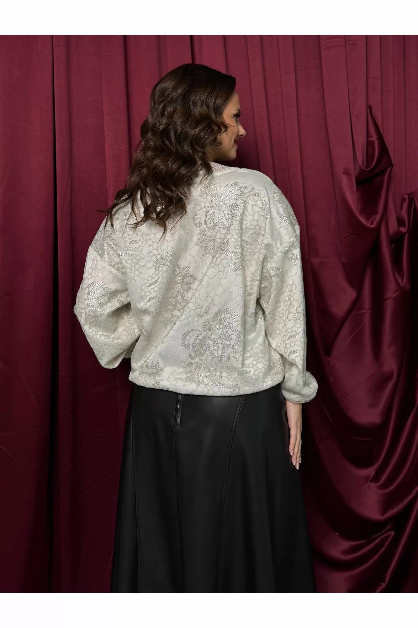 Низ изделия, рукава и горловина обработаны трикотажным довязом, что подчеркивает качество и внимание к деталям. Особенность этого джемпера — двойной слой: верхний из сетки с мерцающими пайетками, придающей образу праздничное настроение, и нижний — из роскошного сатина Армани, создающего эффект богатства и изысканности.