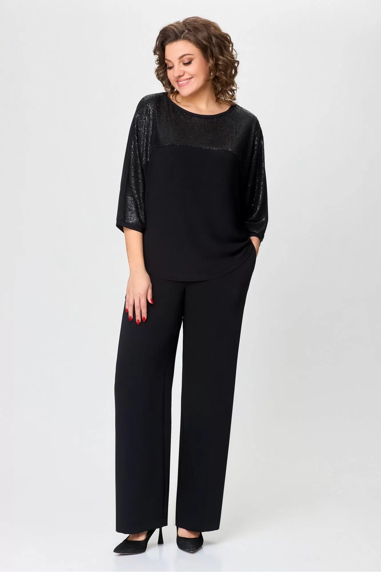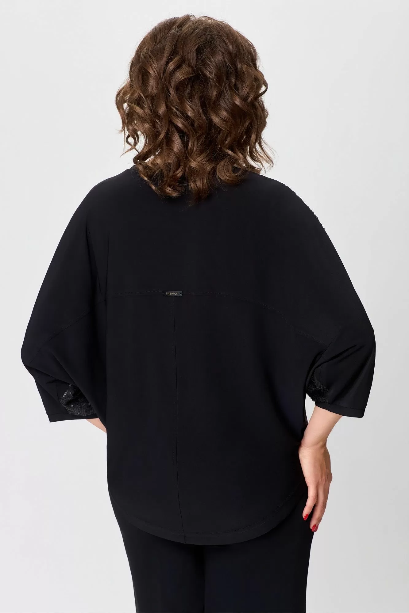 Блузка выполнена из тонкого трикотажного полотна в комбинации с отделочной тканью в пайетки.