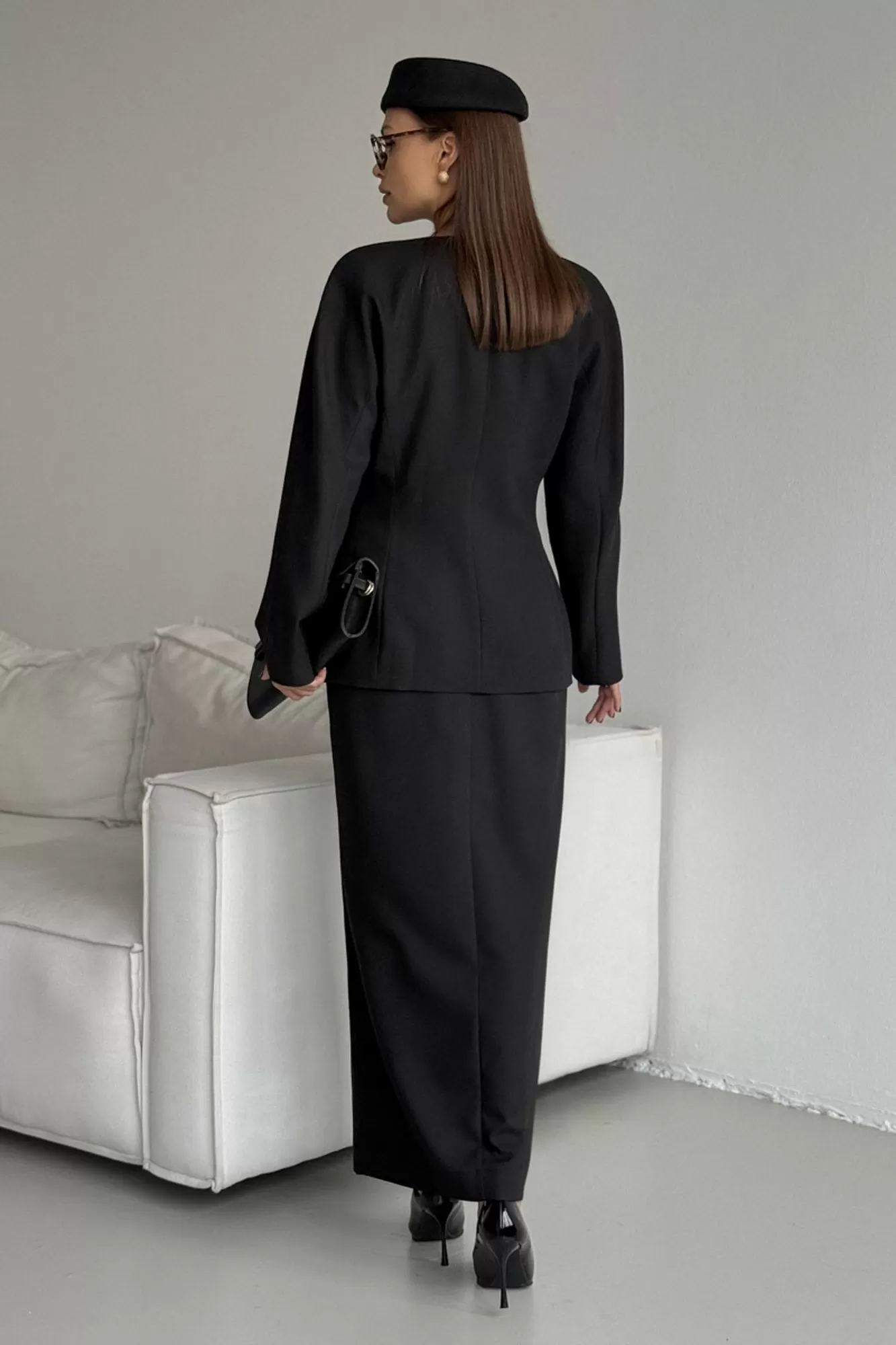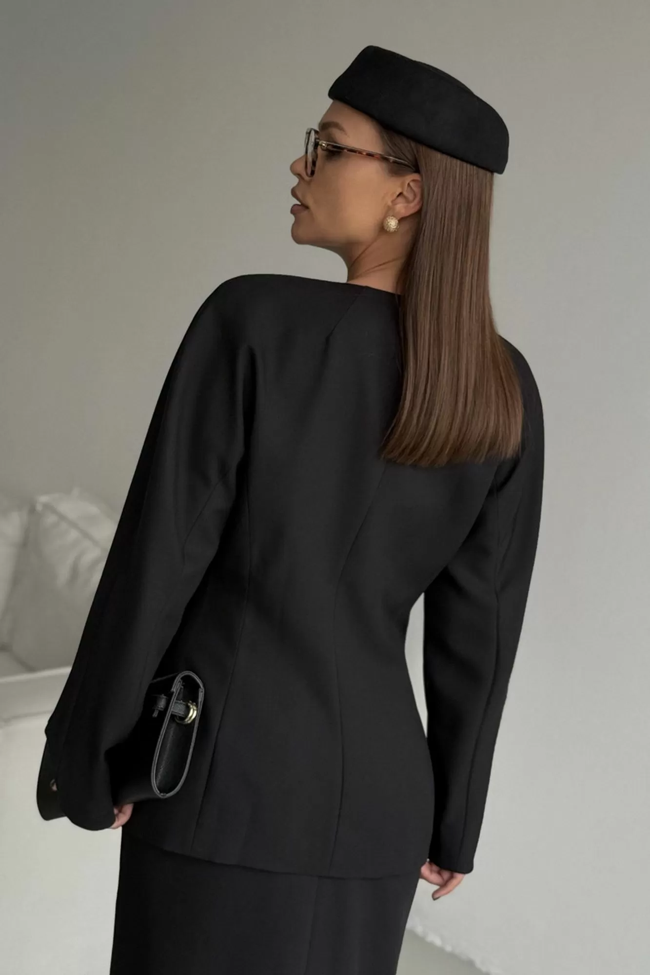 Жакет женский приталеннго Ф-силуэта , выполнен из костюмной ткани . Застежка потайная на петли и пуговицы . Рукав цельновыкроеннный двухшовный.
