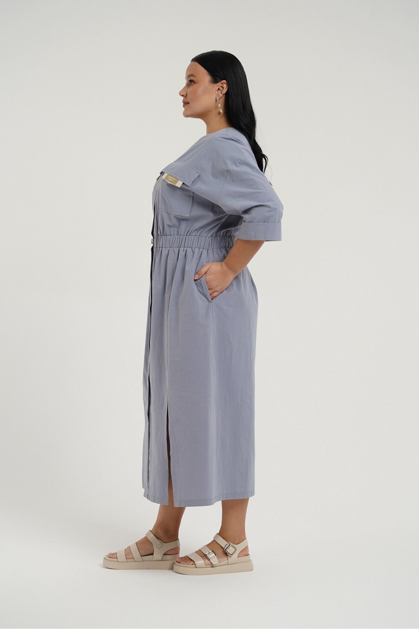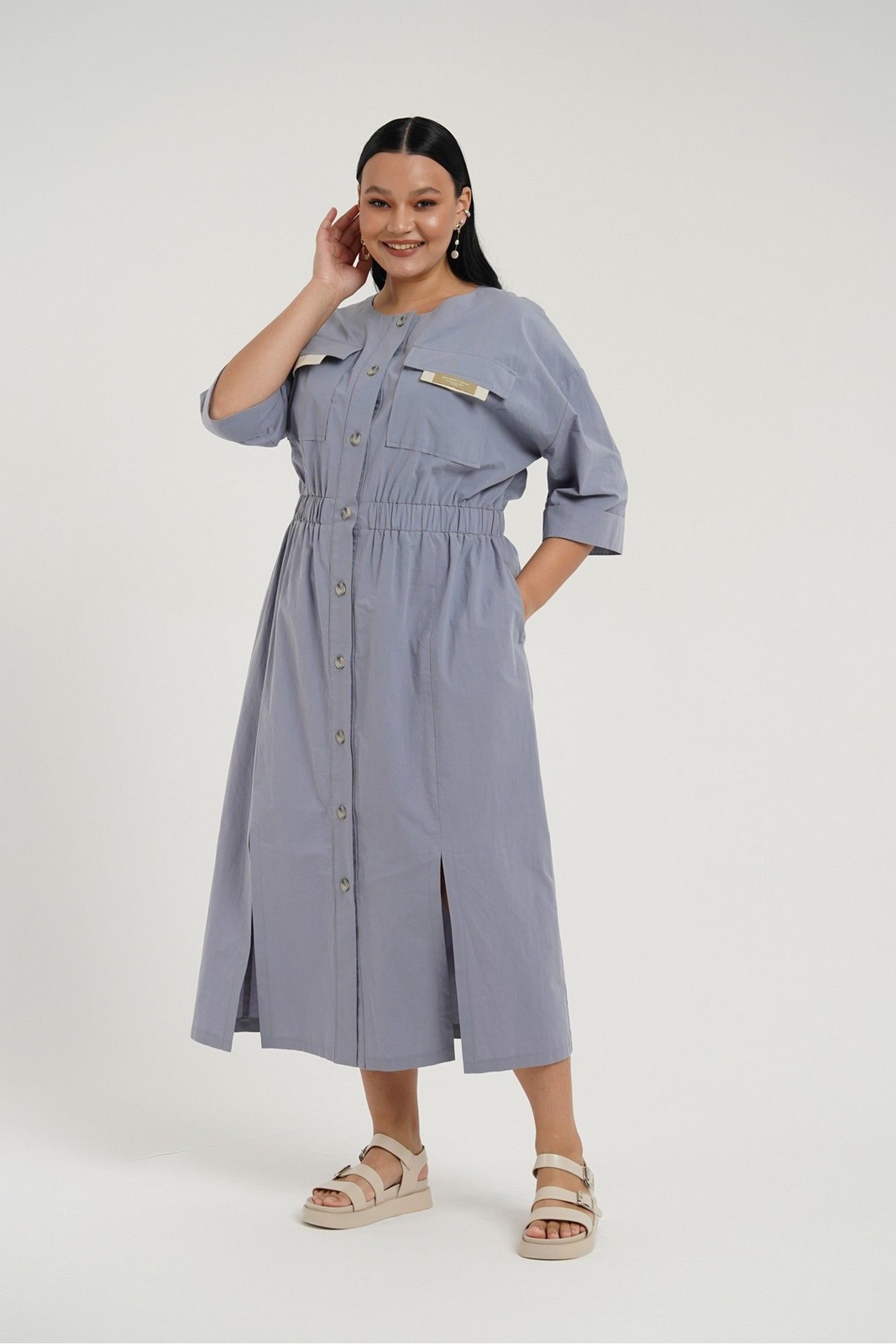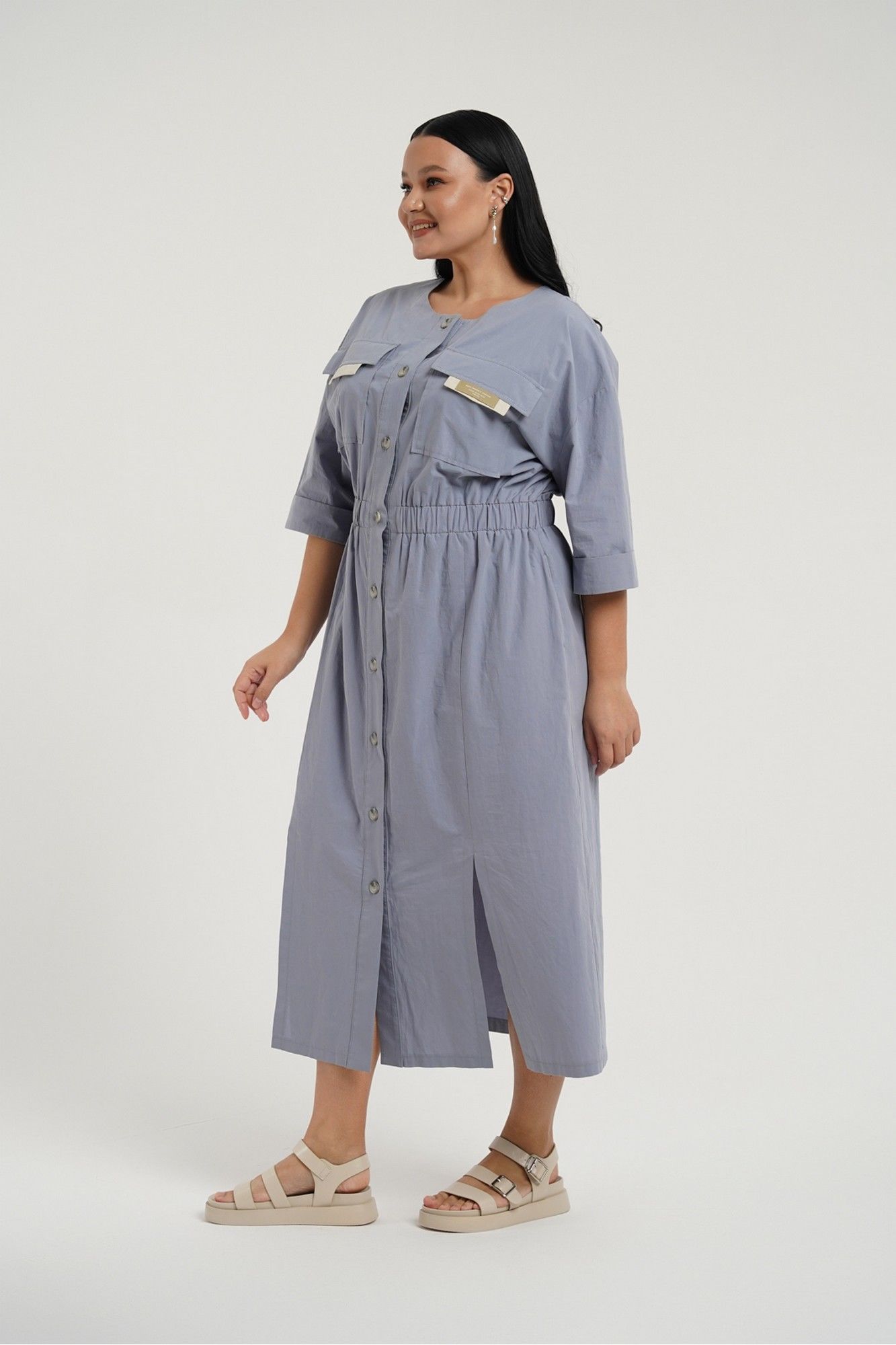 платье X-образного силуэта из хлопковой ткани с эффектом легкой жатки. Вырез горловины неглубокий округлой формы. Застежка на петли и пуговицы. По переду накладные карманы с клапанами. Рукав отрезной на базе спущенного, по низу манжет. По линии талии отрезное, с кулисой с эластичной тесьмой.
