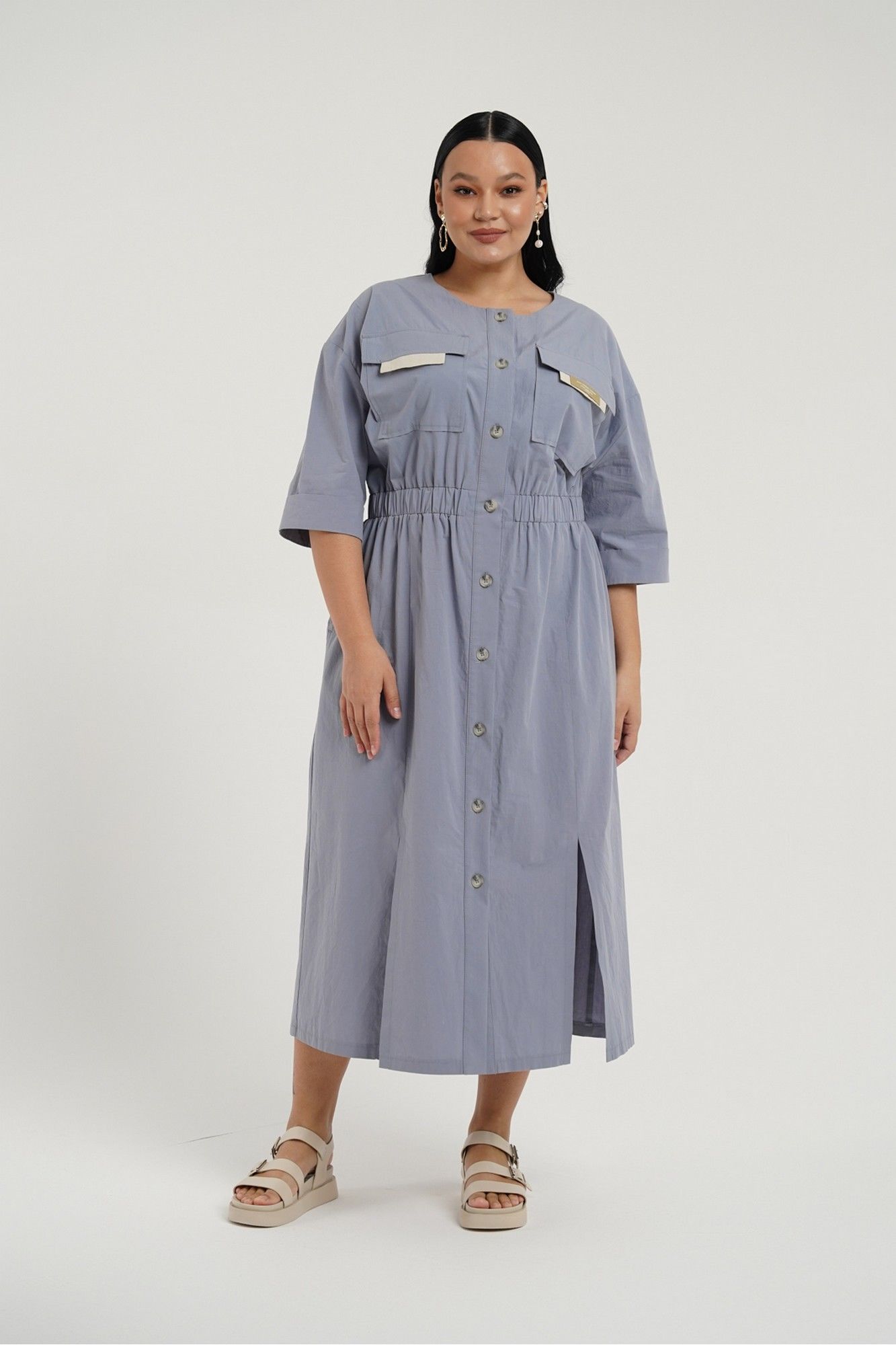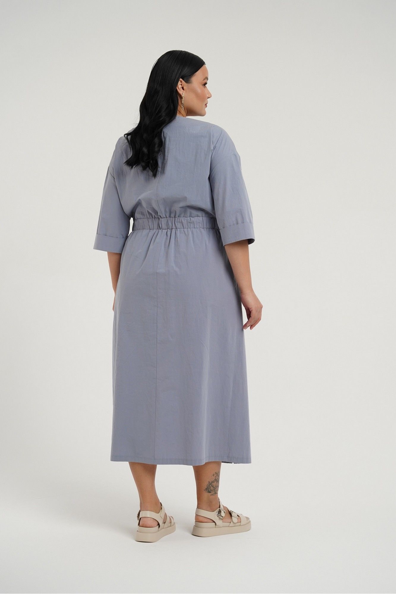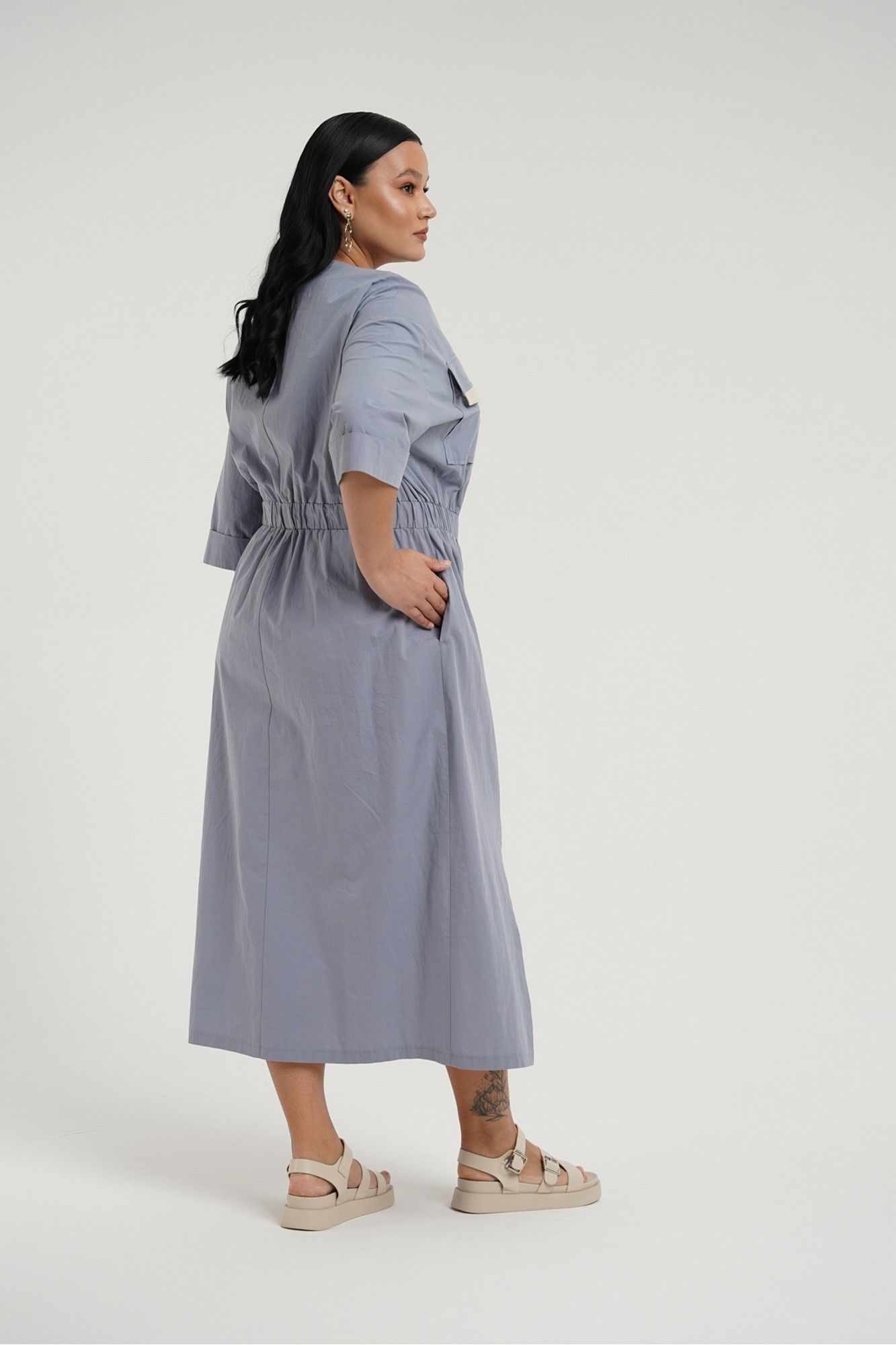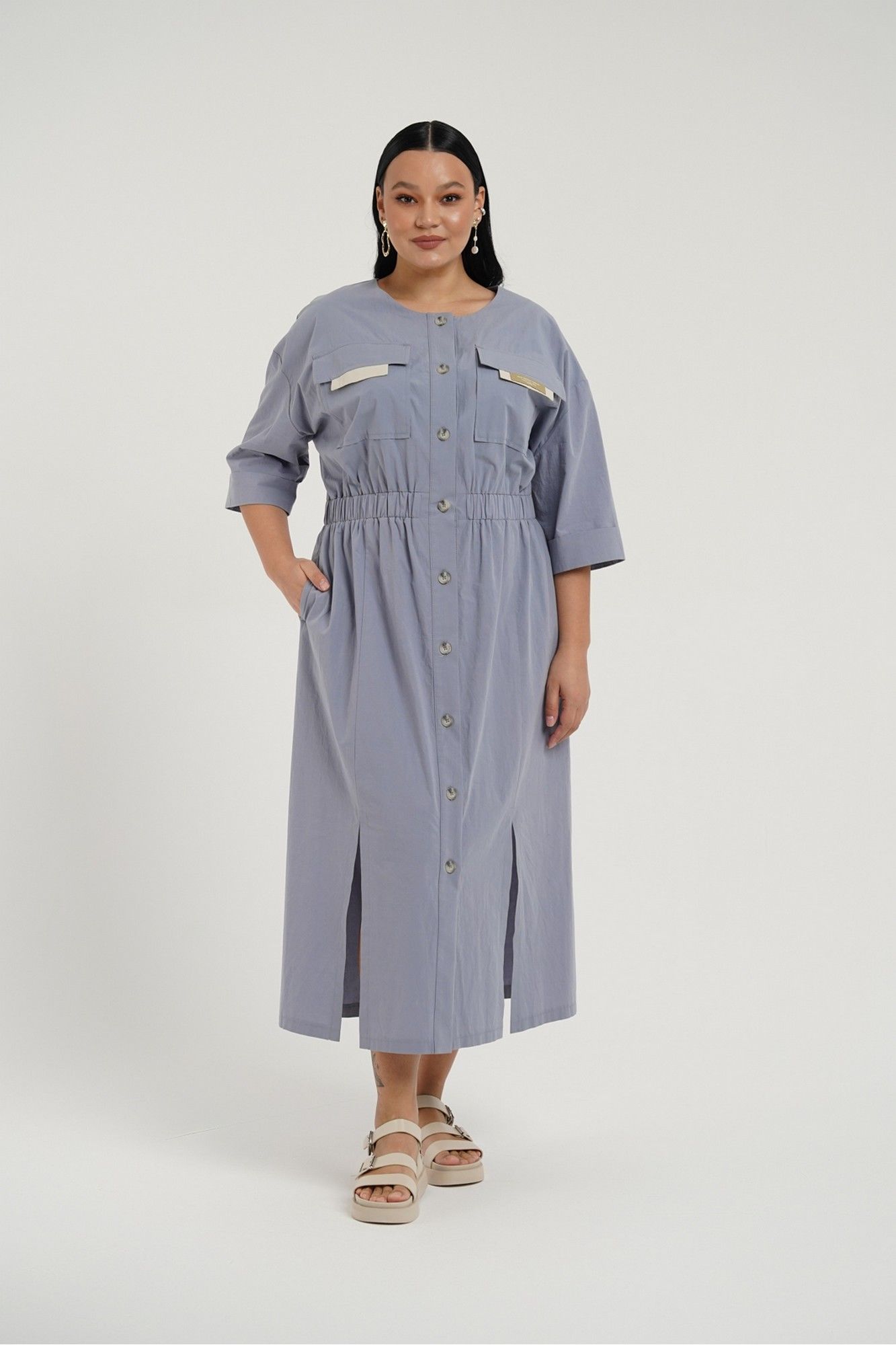 платье X-образного силуэта из хлопковой ткани с эффектом легкой жатки. Вырез горловины неглубокий округлой формы. Застежка на петли и пуговицы. По переду накладные карманы с клапанами. Рукав отрезной на базе спущенного, по низу манжет. По линии талии отрезное, с кулисой с эластичной тесьмой.