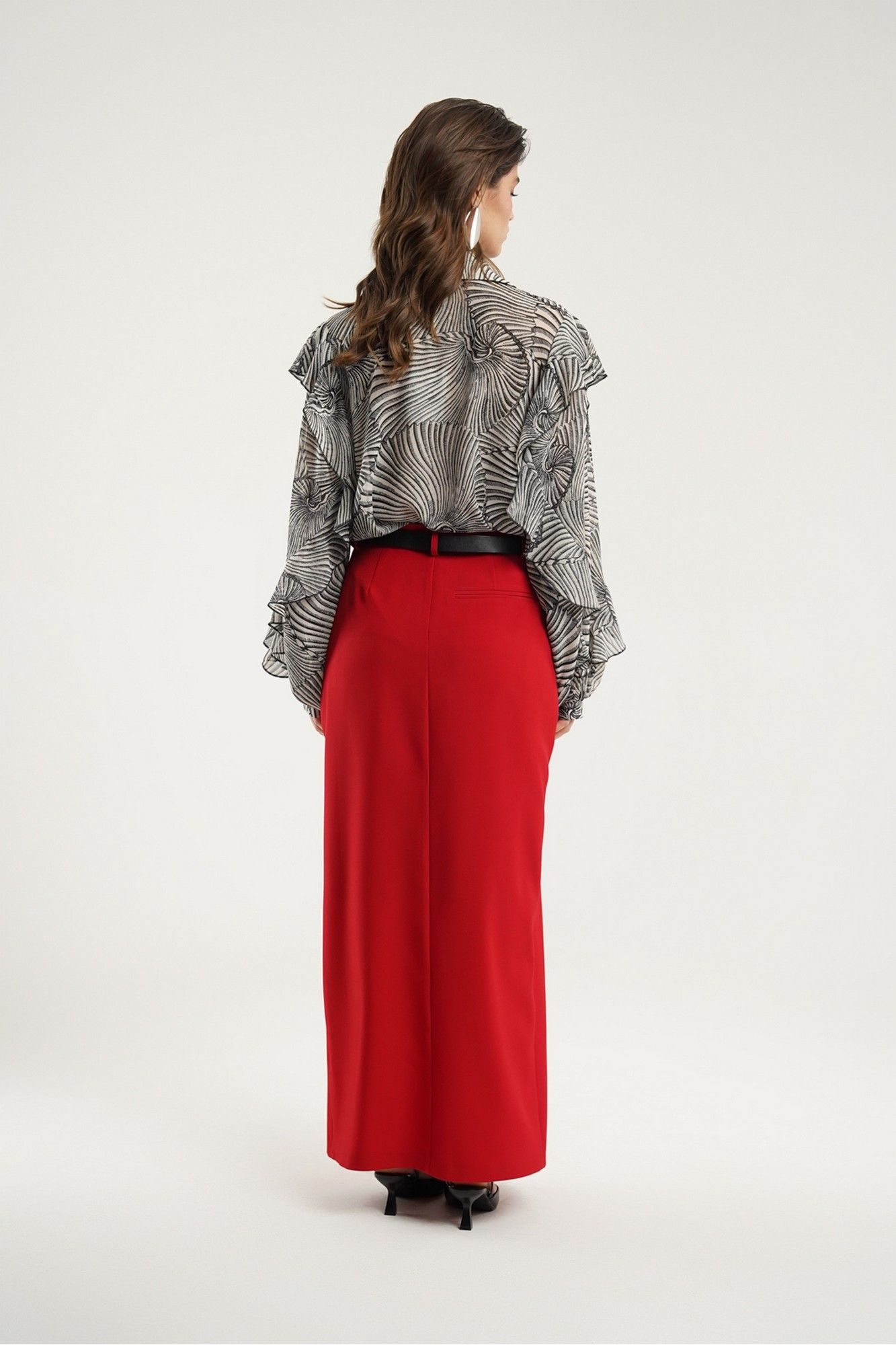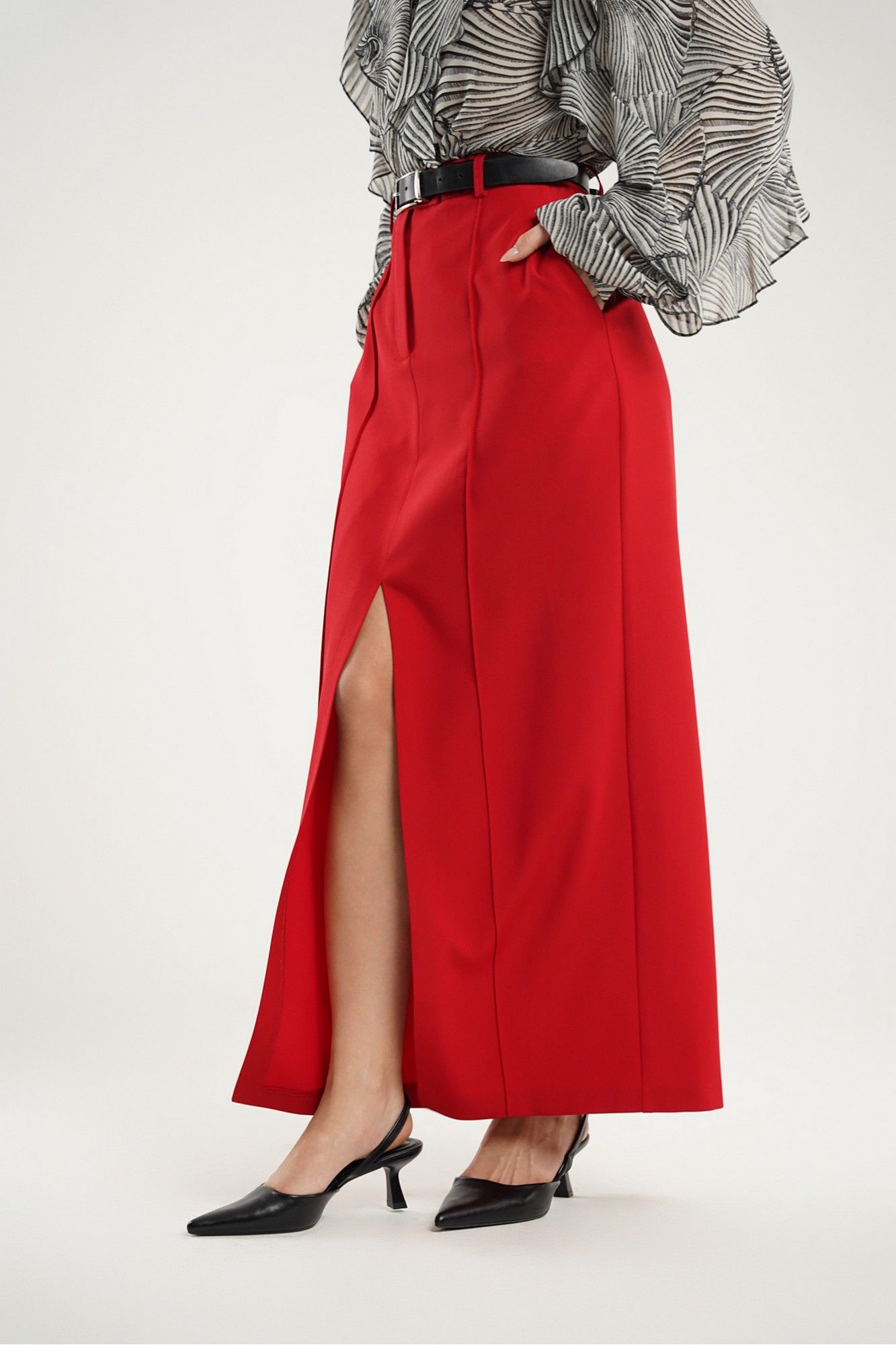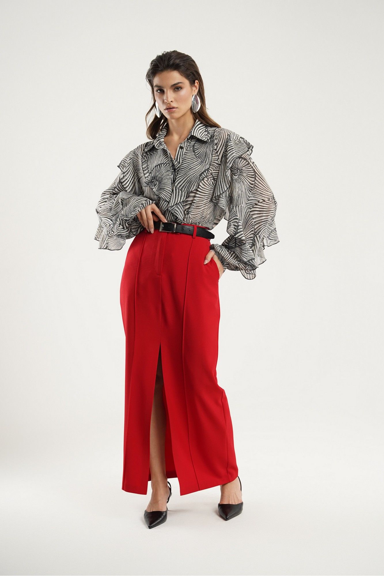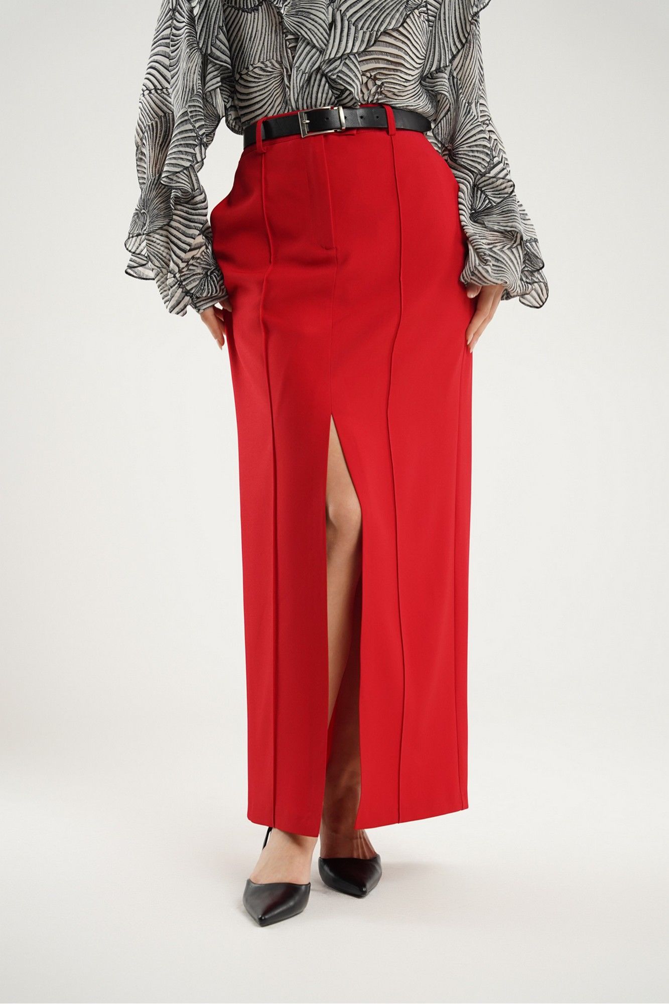 Юбка, прямая, в длине миди с разрезом по переду. В боковых швах карманы с отрезным бочком, сзади имитация кармана в рамку. Застежка на молнию и петлю с пуговицей. Пояс отрезной. Длина по боковому шву - 99 см.