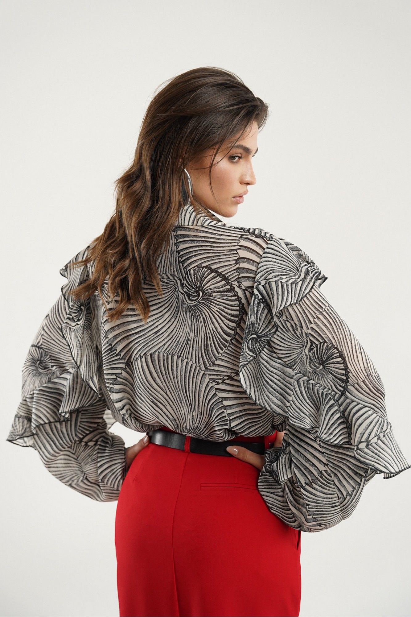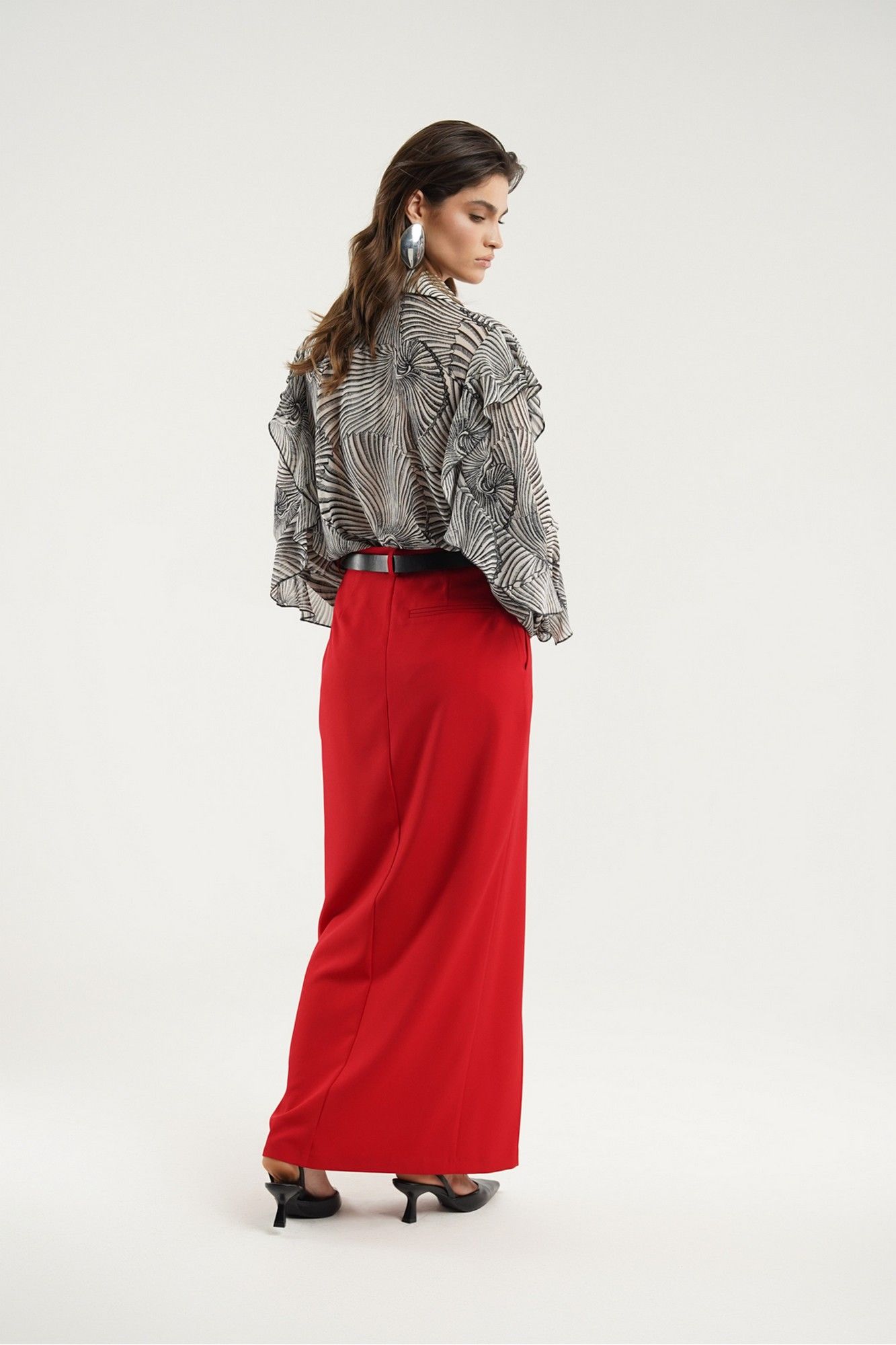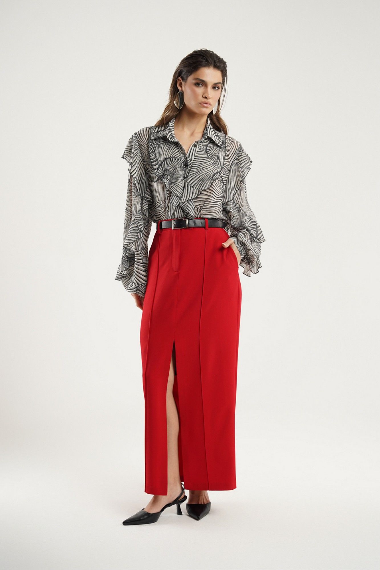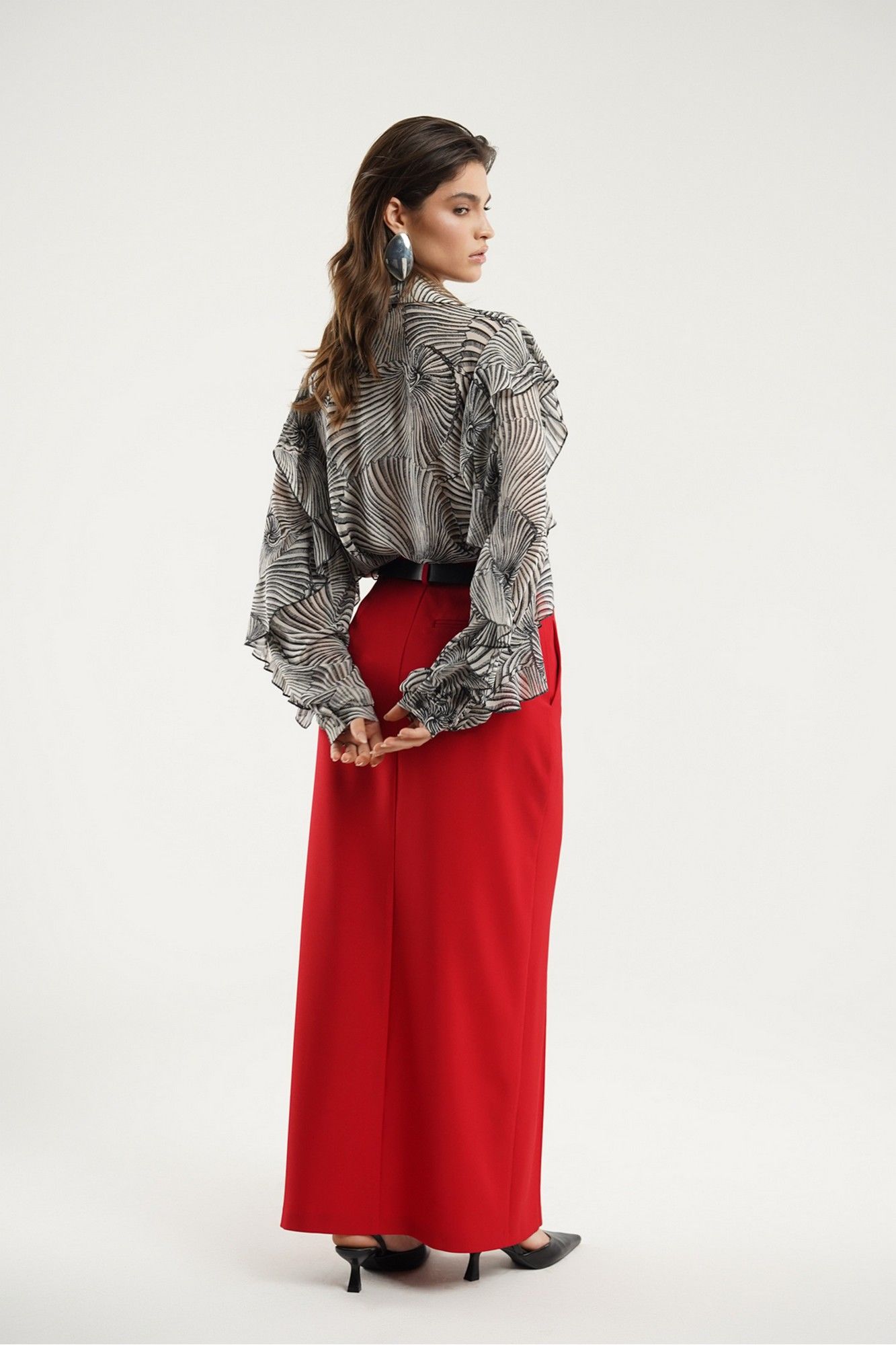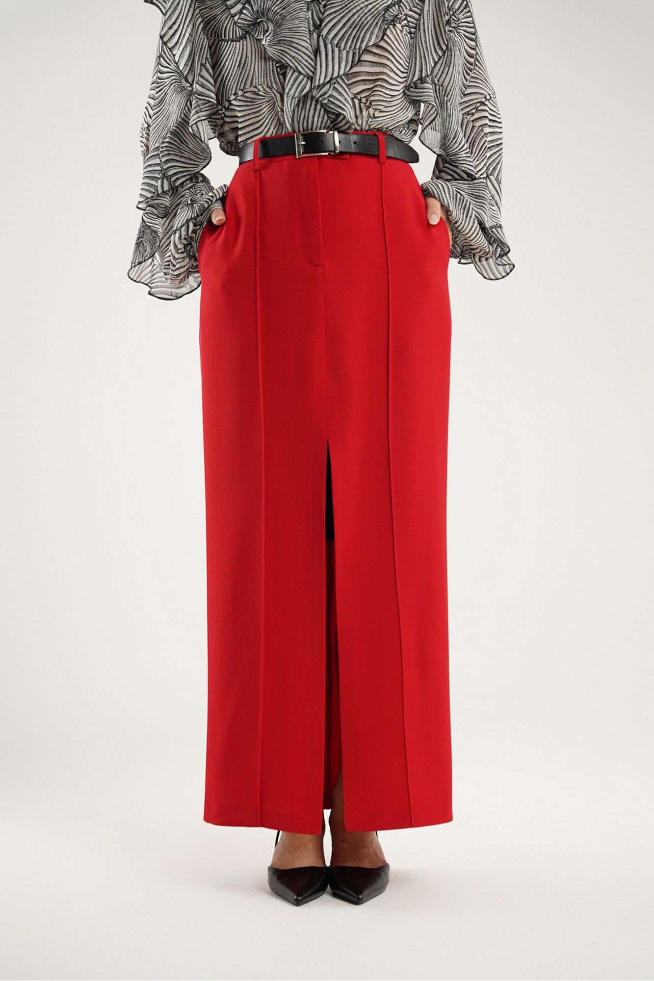 Юбка, прямая, в длине миди с разрезом по переду. В боковых швах карманы с отрезным бочком, сзади имитация кармана в рамку. Застежка на молнию и петлю с пуговицей. Пояс отрезной. Длина по боковому шву - 99 см.