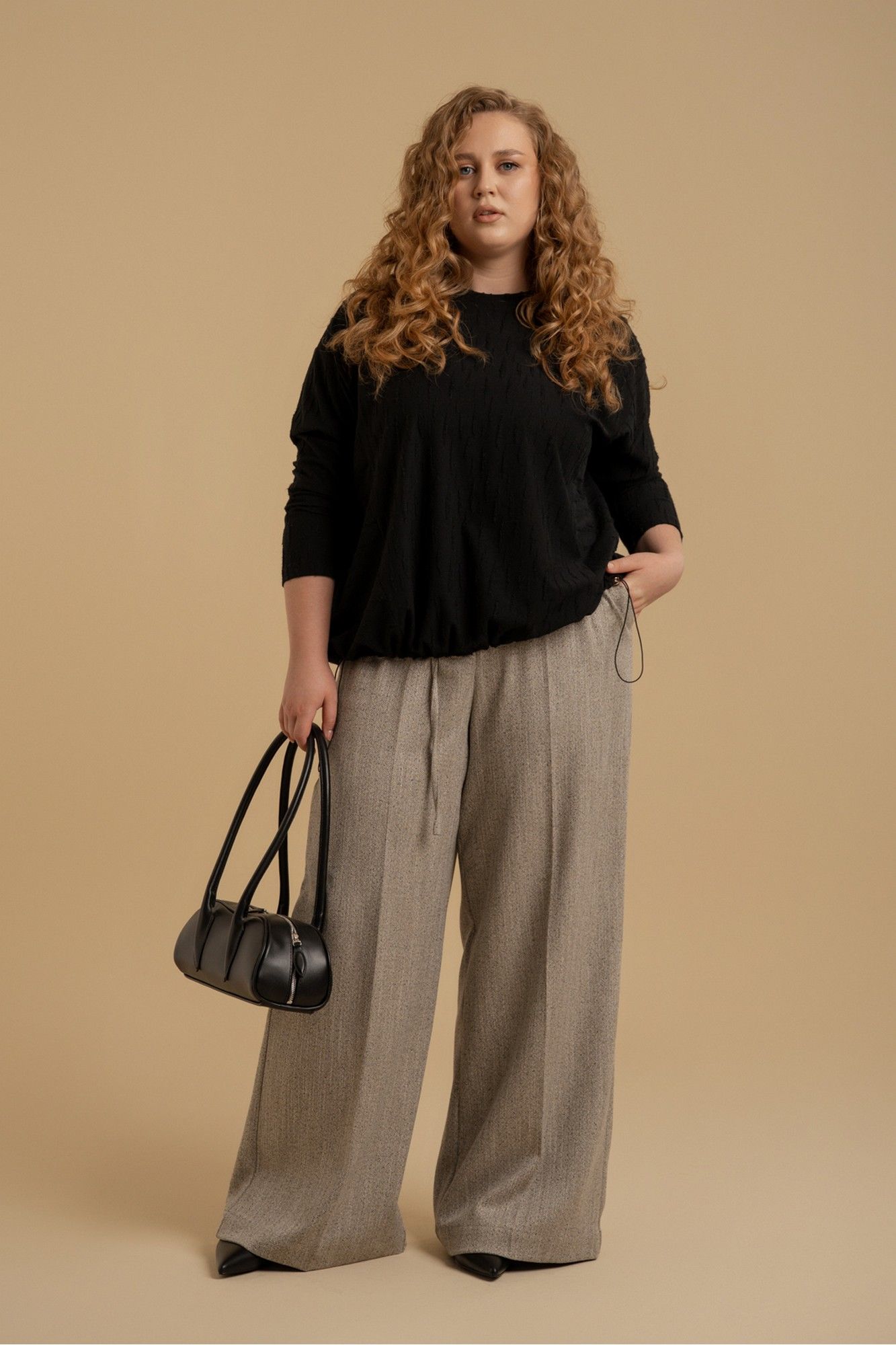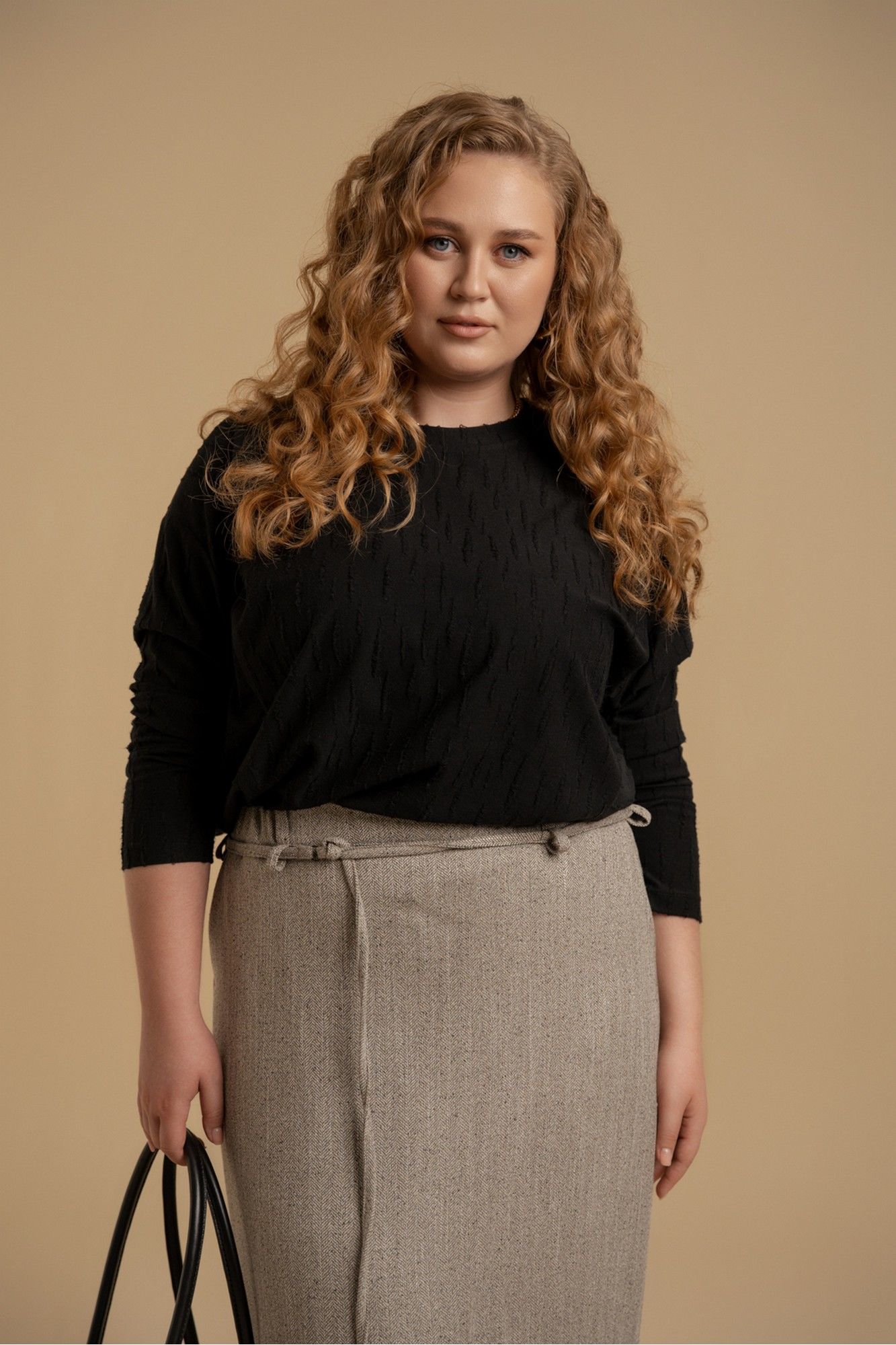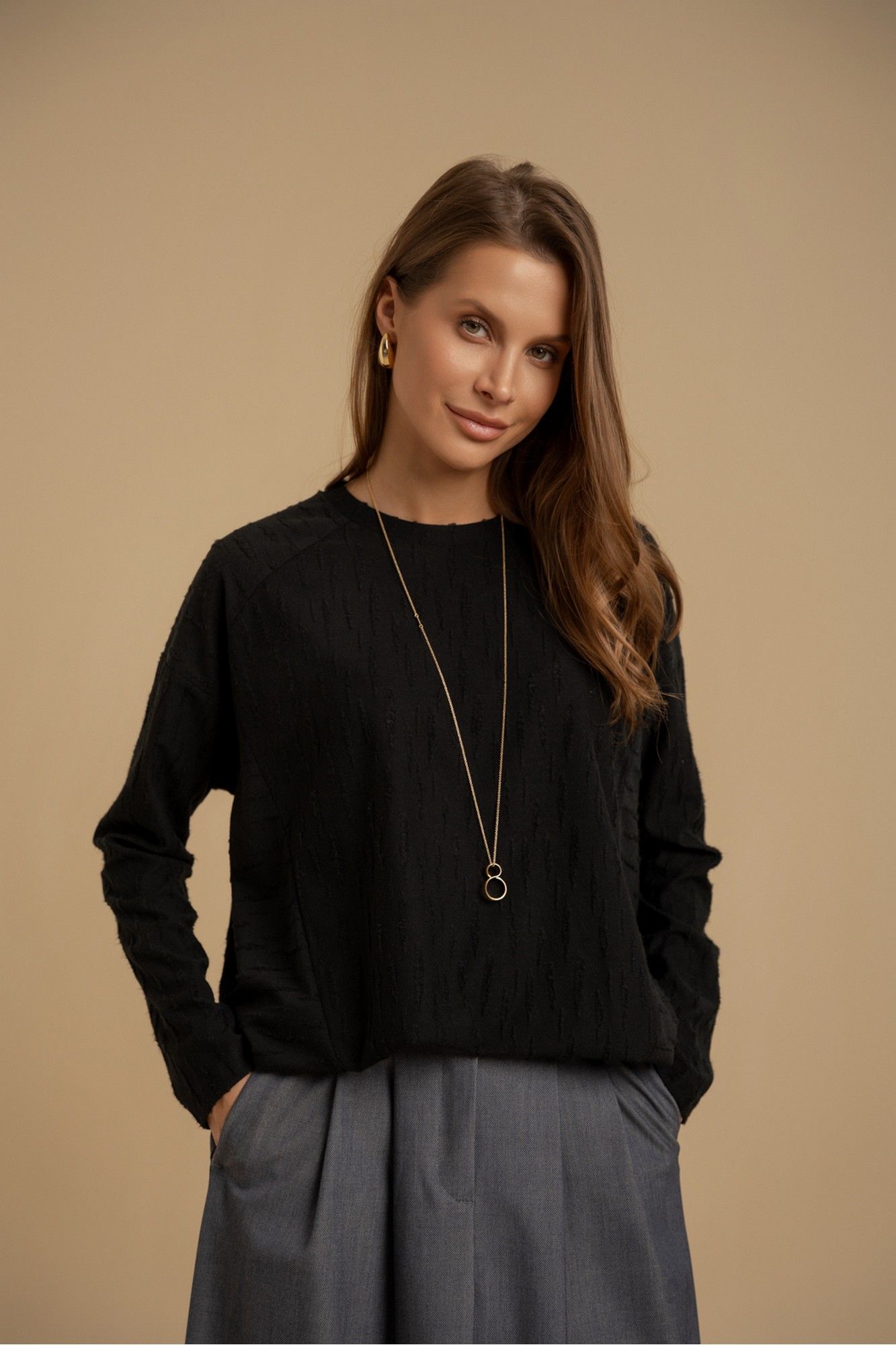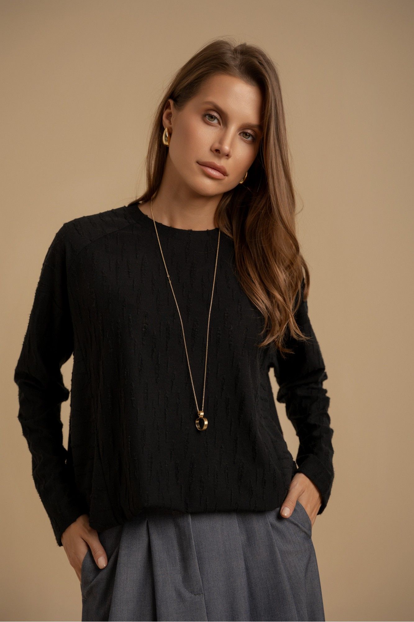 Джемпер женский свободного покроя из трикотажного полотна с эффектом спущенных петель. Вырез горловины неглубокий округлой формы. Рукава отрезные на базе цельнокроеных. Перед изделия оформлен декоративными подрезами в виде кокеток и рельефов. В подгибку низа вставлена эластичная тесьма с фиксаторами в боковых швах.