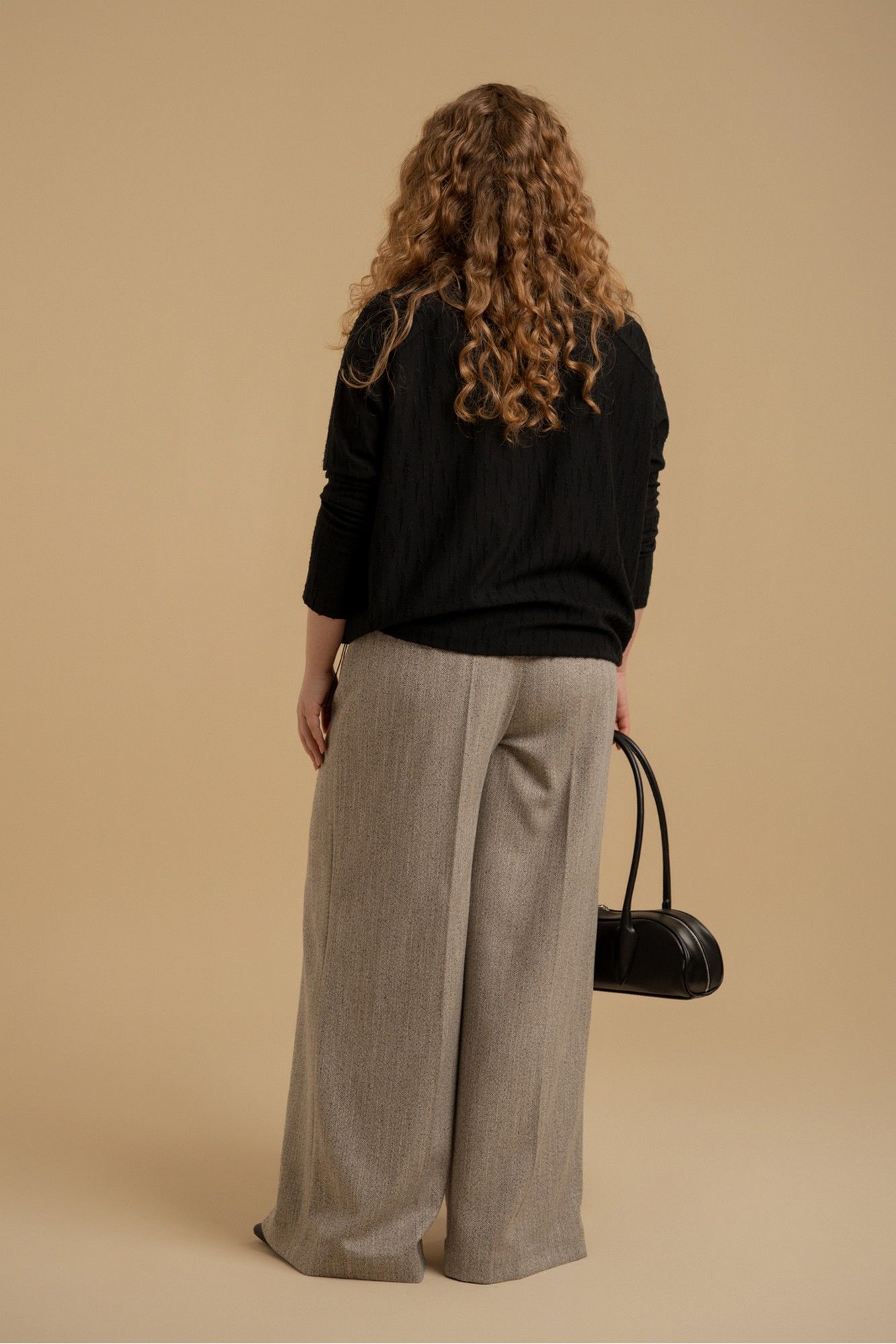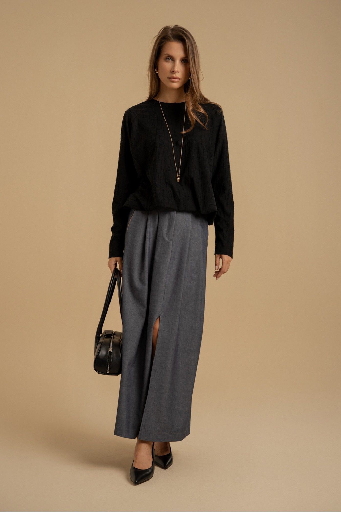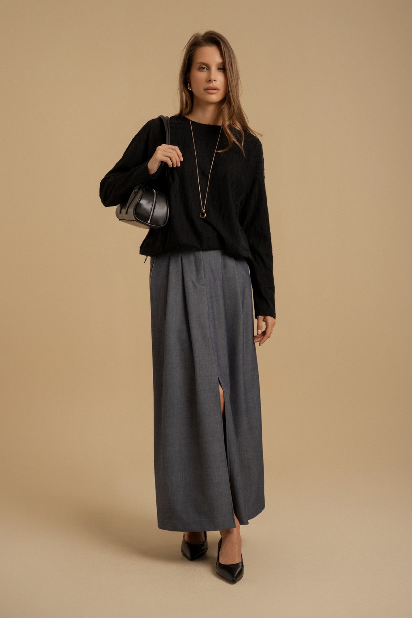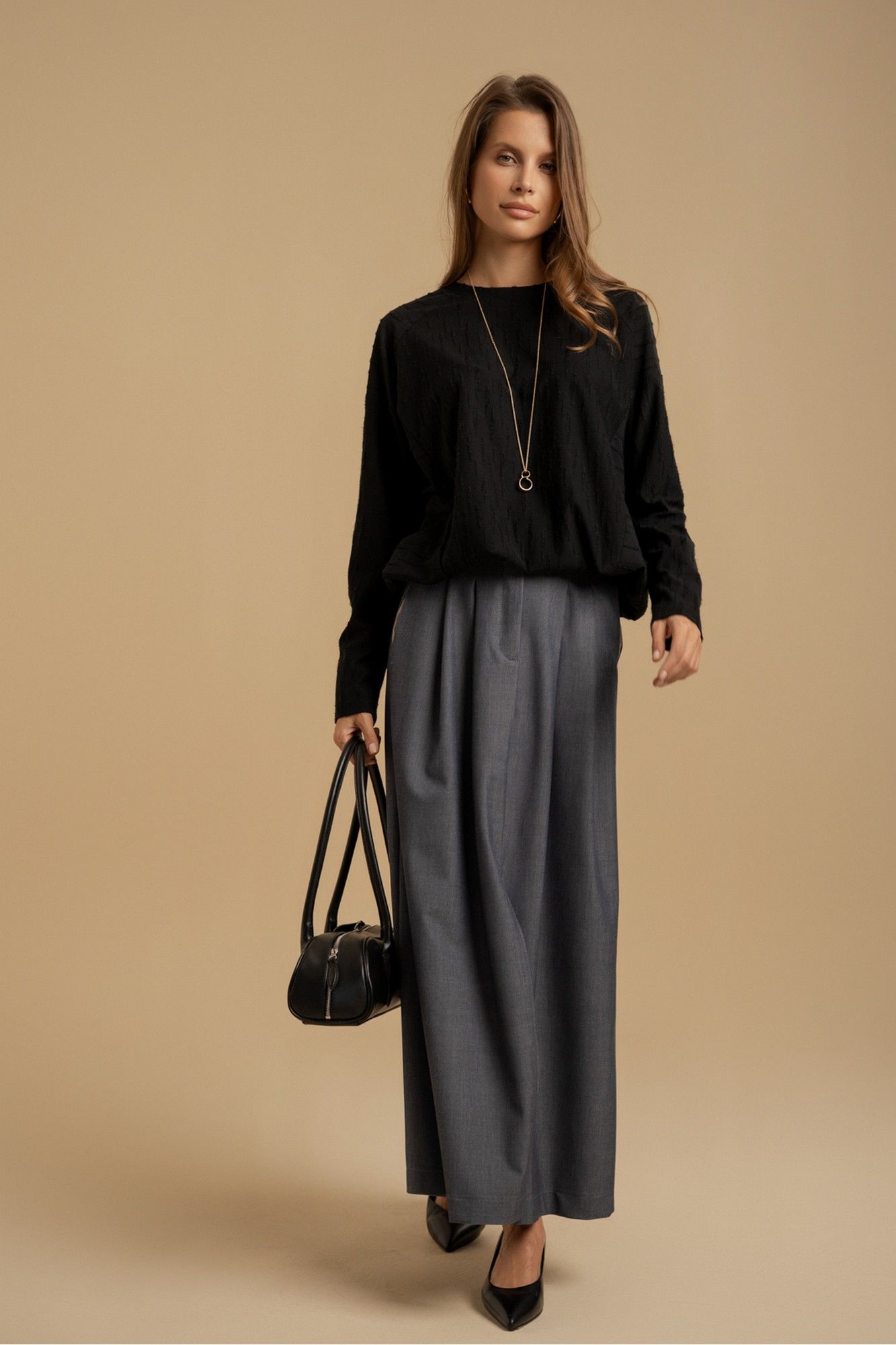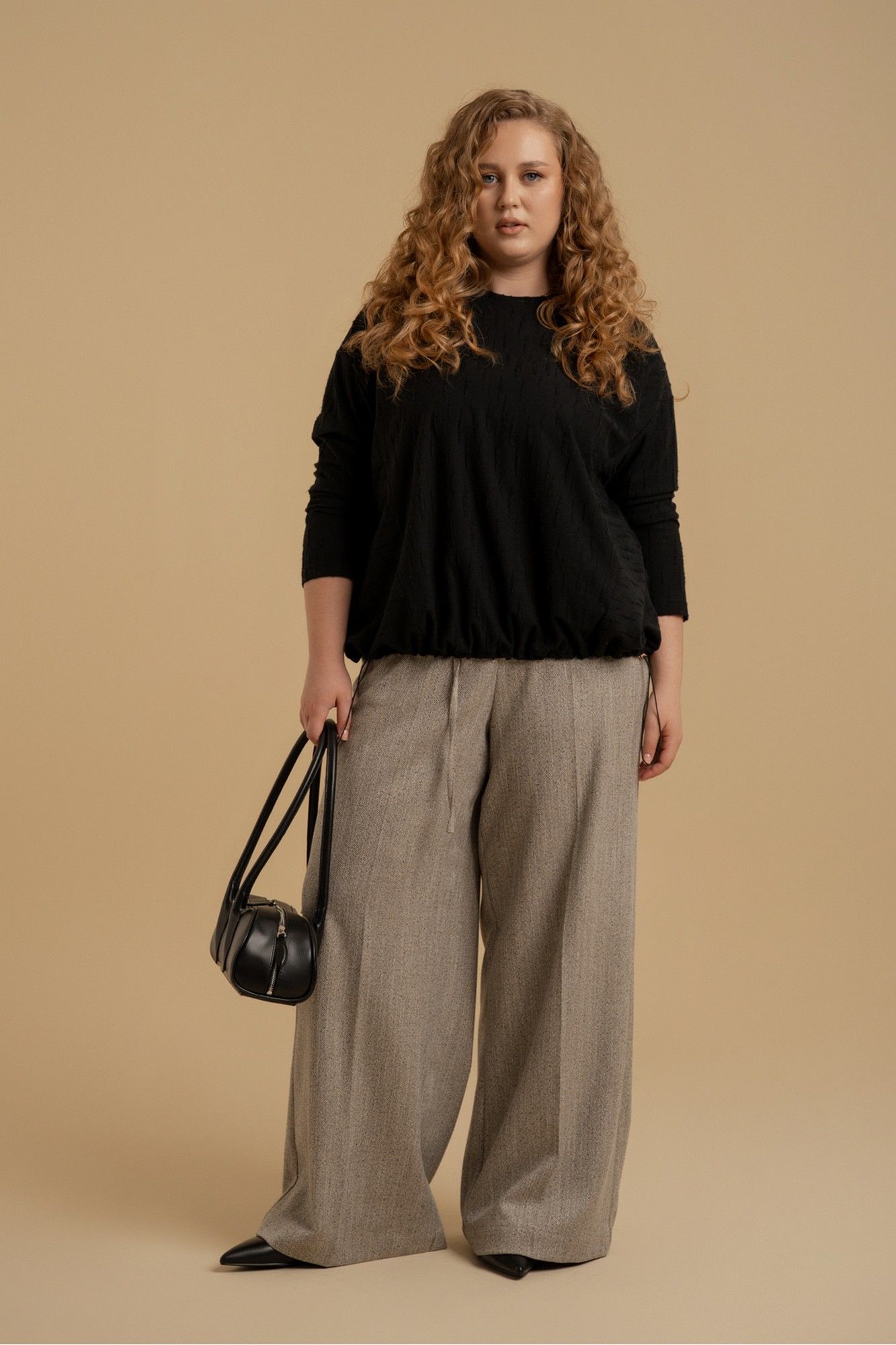 Джемпер женский свободного покроя из трикотажного полотна с эффектом спущенных петель. Вырез горловины неглубокий округлой формы. Рукава отрезные на базе цельнокроеных. Перед изделия оформлен декоративными подрезами в виде кокеток и рельефов. В подгибку низа вставлена эластичная тесьма с фиксаторами в боковых швах.