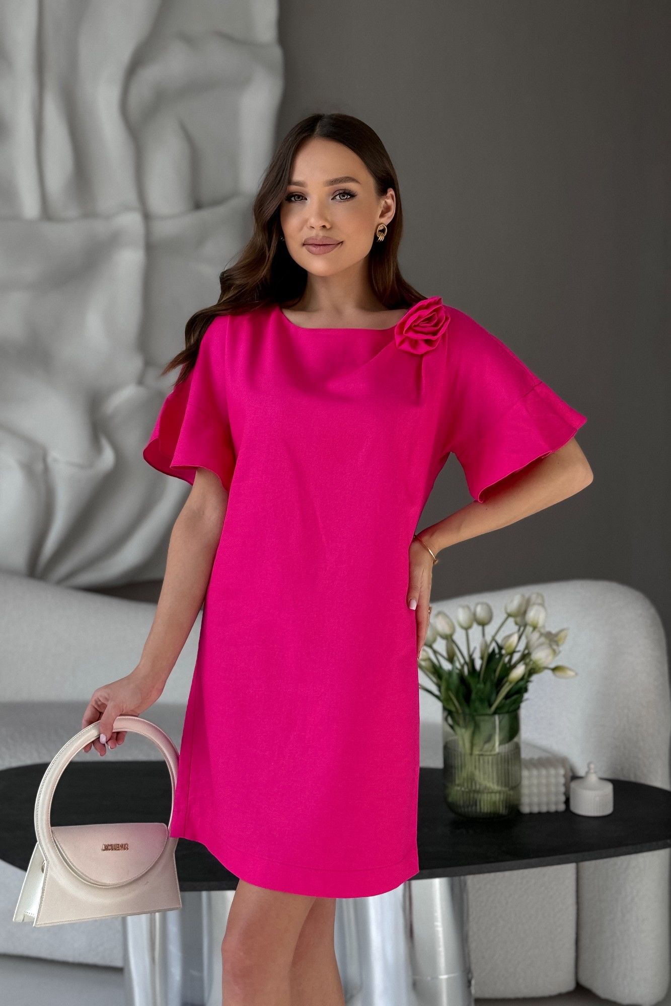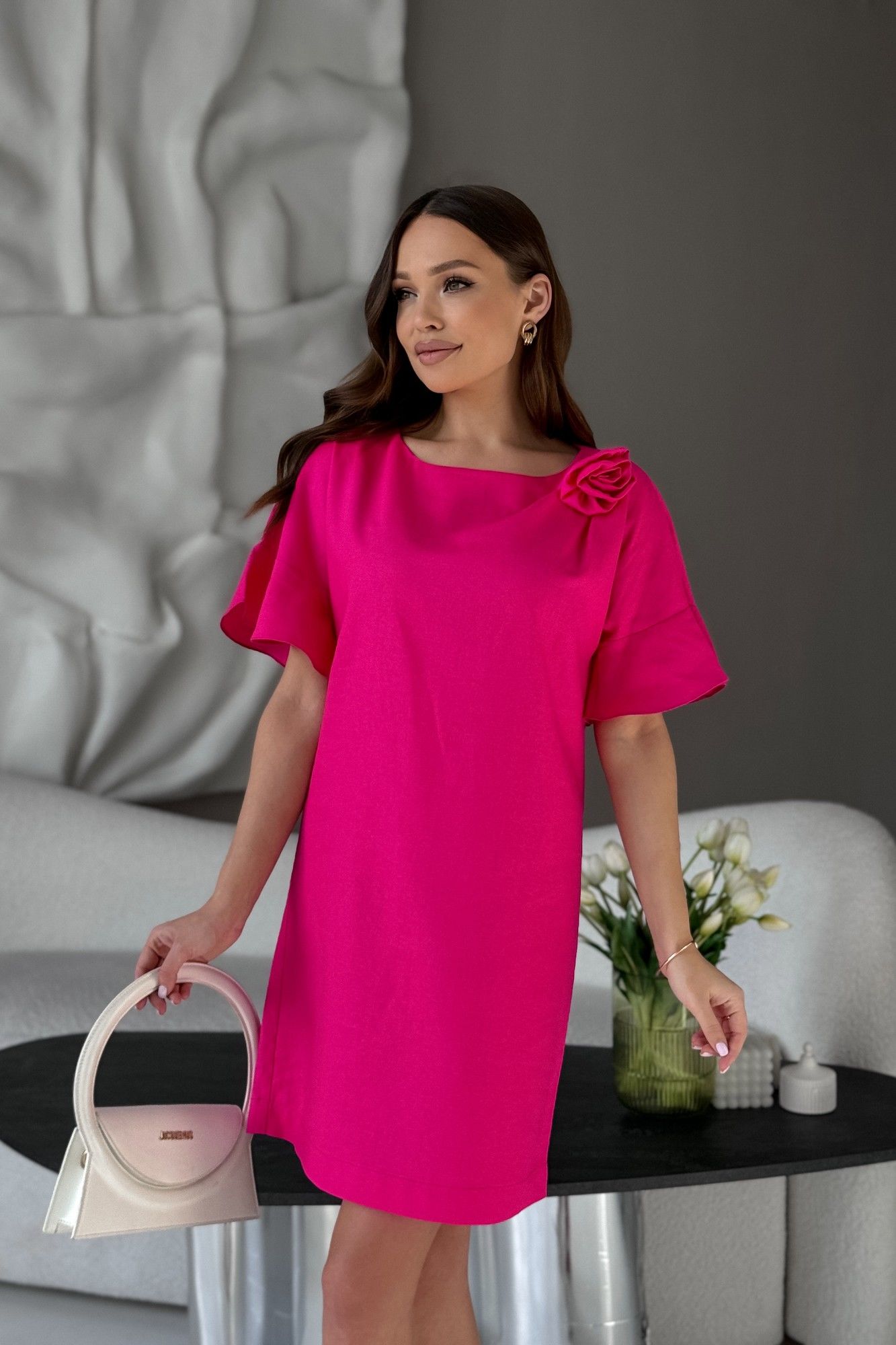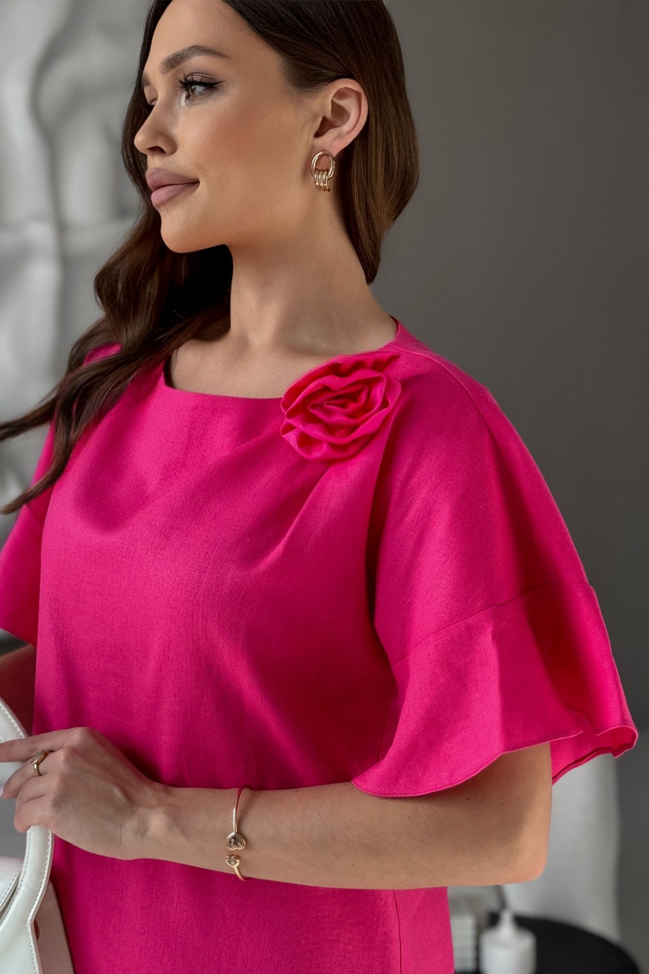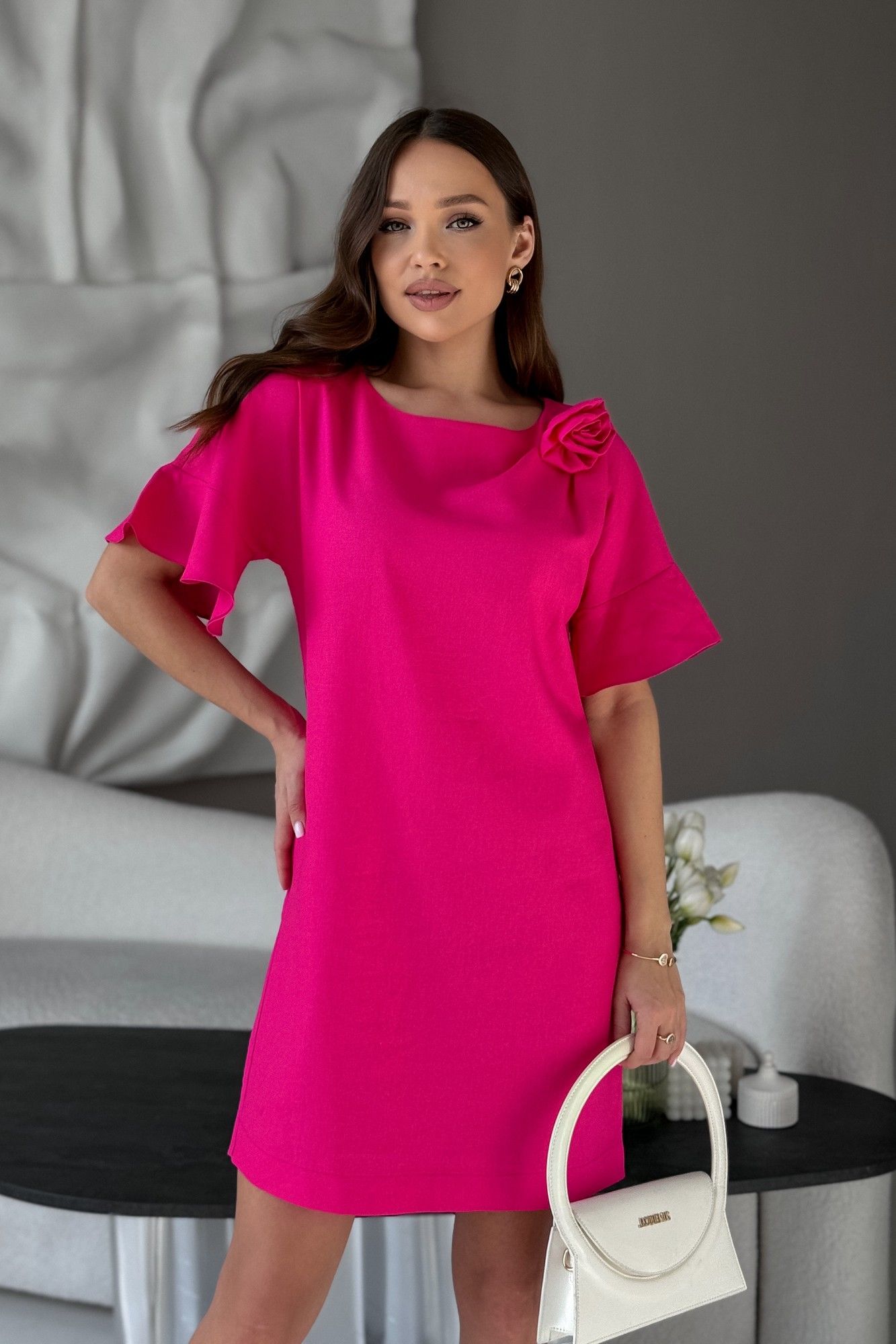 Платье женское А-силуэта с застежкой на тесьму-молнию в верхней части среднего шва спинки. Перед - со складками. Спинка – со средним швом. Рукава - цельнокроеные короткие с притачным по низу воланом. В комплекте – декоративное украшение «цветок» - выполнено из основной ткани. Длина рукава платья — 34 – 36,8 см Длина платья — 88,7- 91,5 см