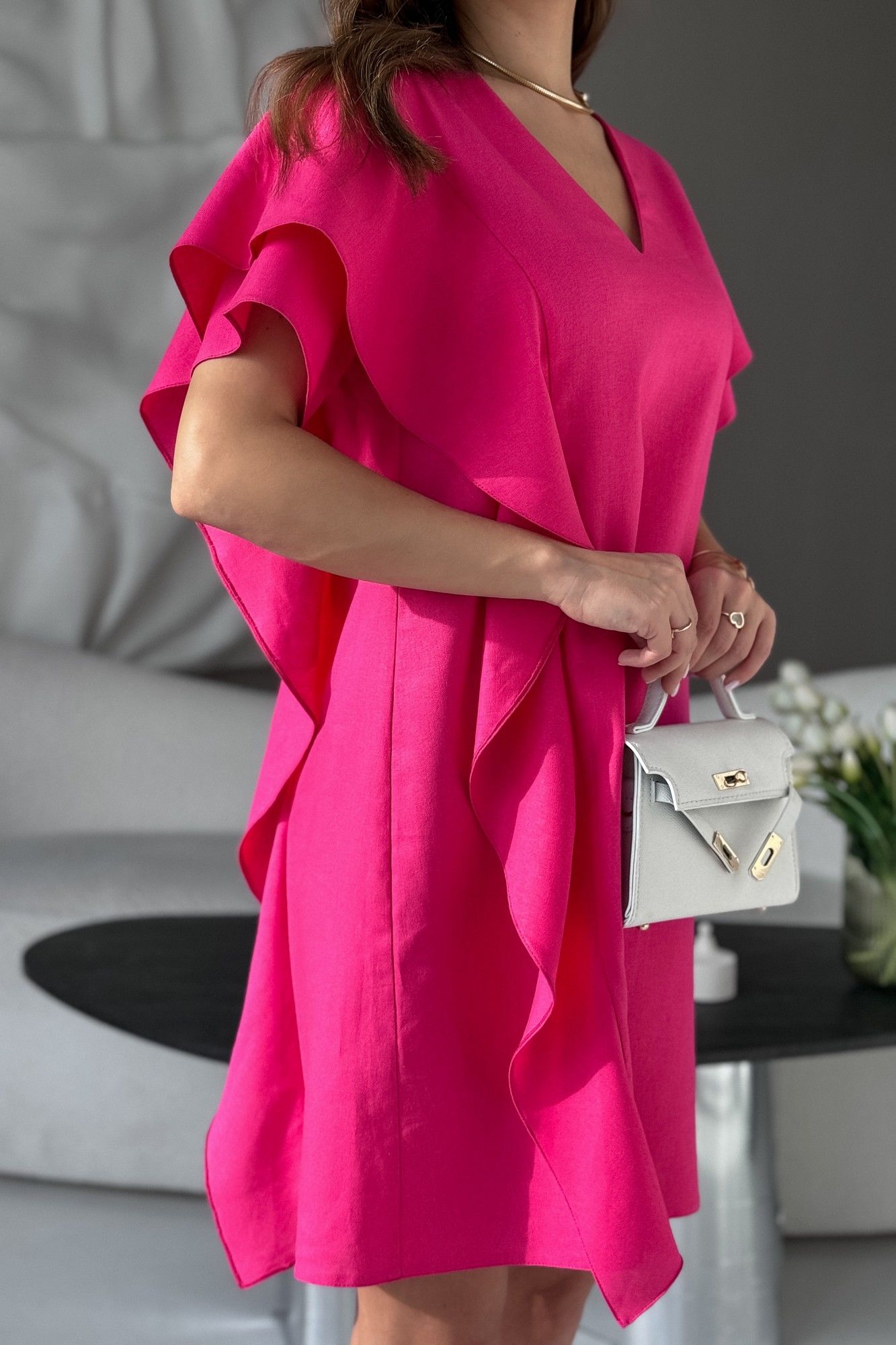 Платье А-силуэта, со слегка спущенным плечевым поясом и рукавом рубашечного типа. Перед с v-образным вырезом горловины, обработанным обтачкой. По правой стороне переда вертикальный рельеф в который вставлен волан. По левой стороне переда нагрудная вытачка из бокового шва. Спинка с вертикальным рельефом по правой стороне в который вставлен волан. Рукава короткие, широкие, рубашечного типа. Длина рукава платья — 19,5 см Длина платья — 89,5- 98,3 см
