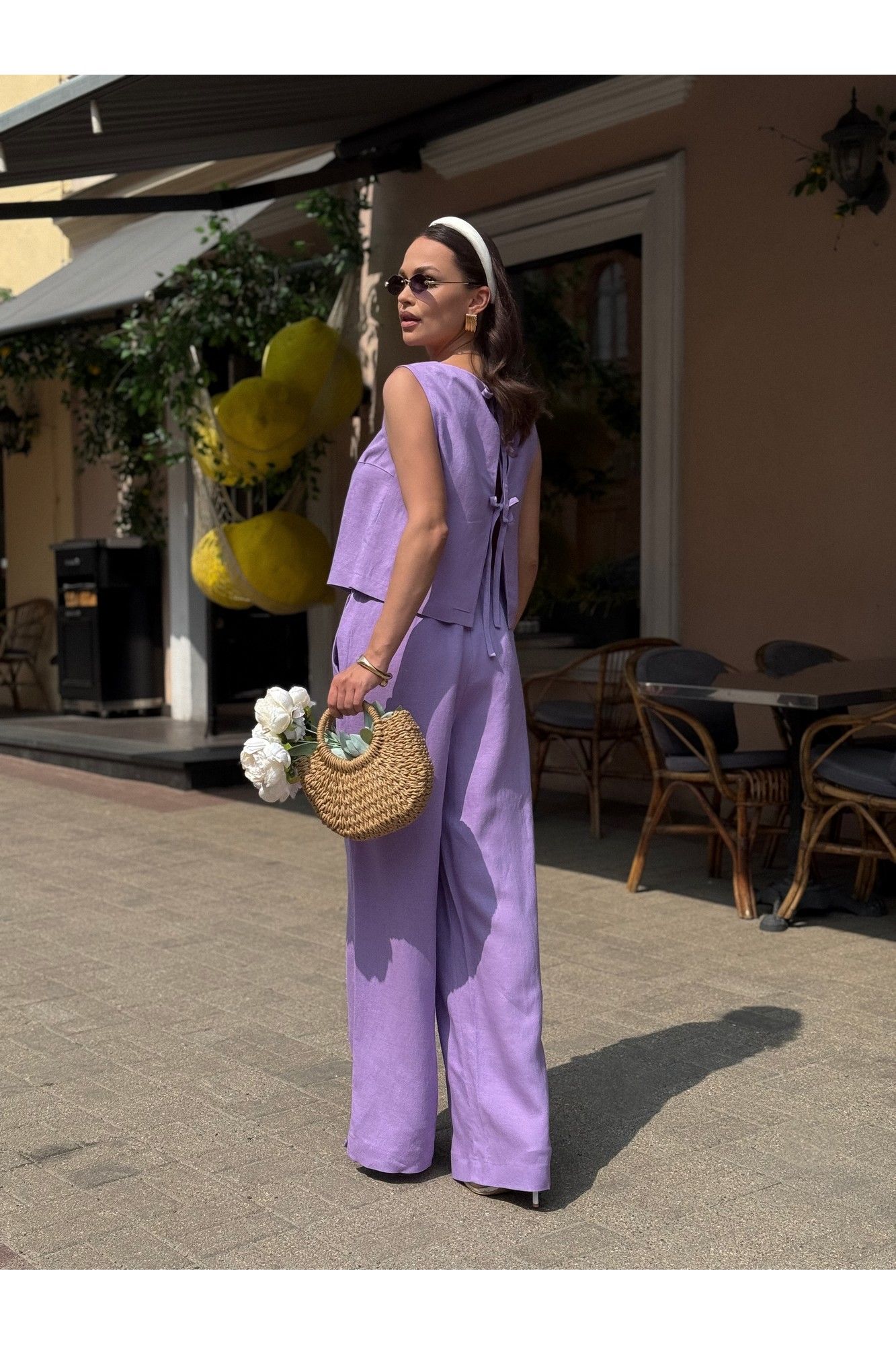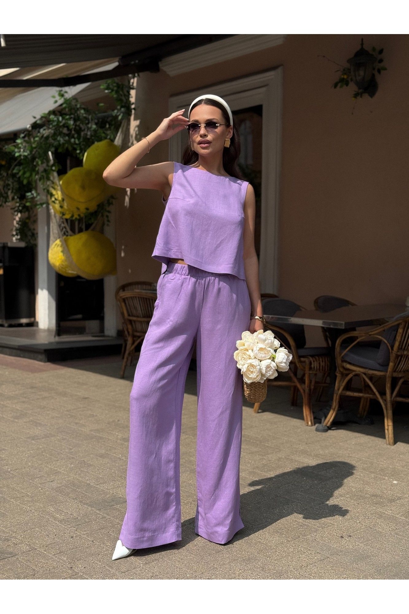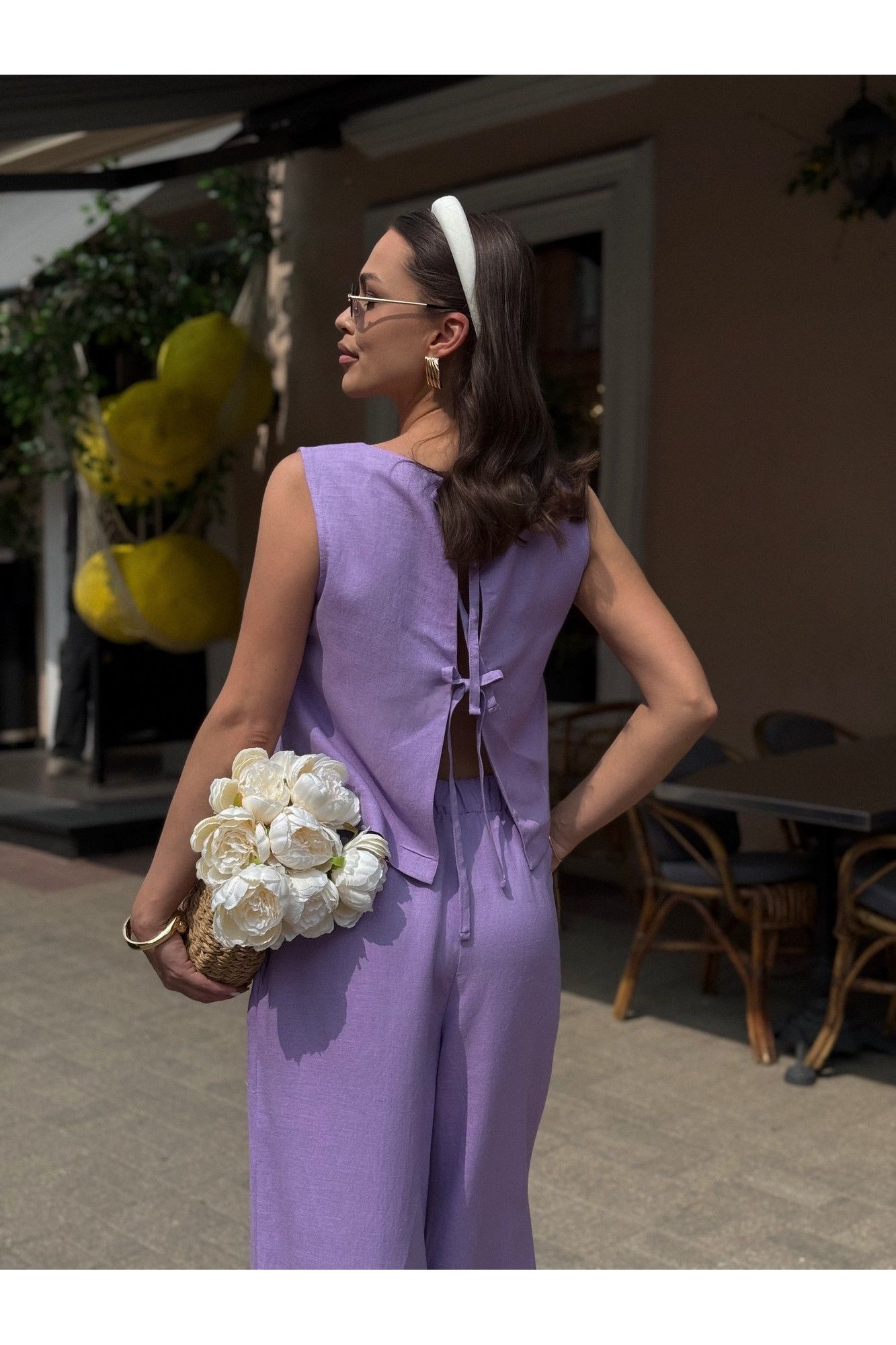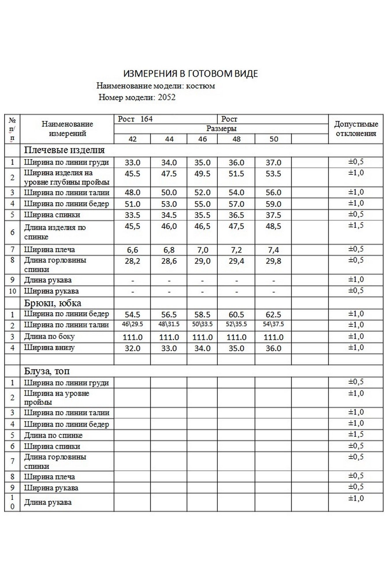 Костюм женский двух-предметный, состоящий из брюк и блузы. Брюки прямого широкого силуэта. По ПП брюк обработаны косые боковые карманы. Брюки обработаны поясом с резинкой. Блуза прямого силуэта, укороченная. Перед с нагрудными вытачками из бокового шва. Спинка состоит из двух частей, которые между собой завязываются на шнурки. Вырез горловины «лодочка» Ширина плеча блузы — 6,6 — 7,4 см Длина блузы — 45,5 — 48,5 см Длина брюк — 111 см
