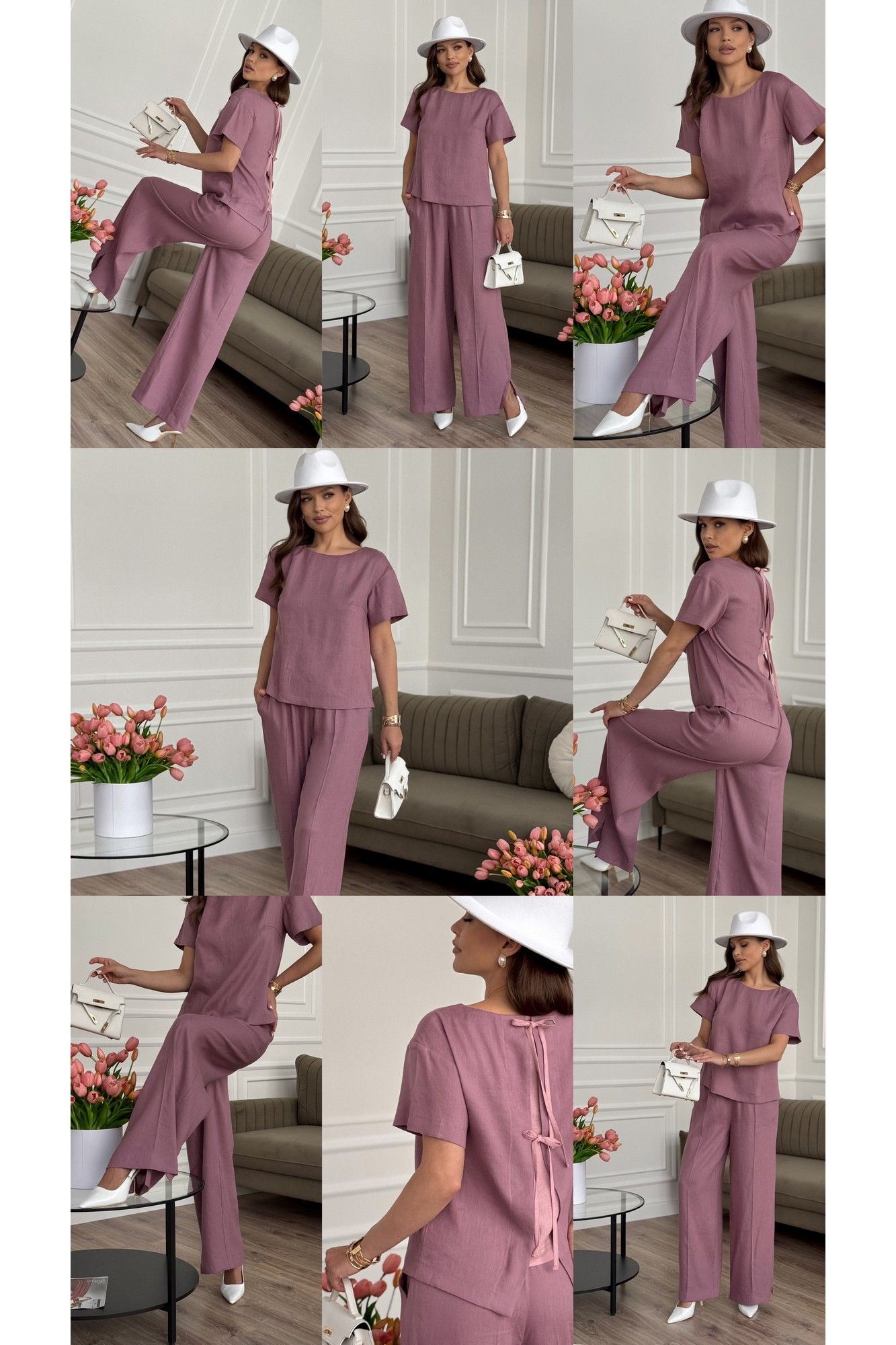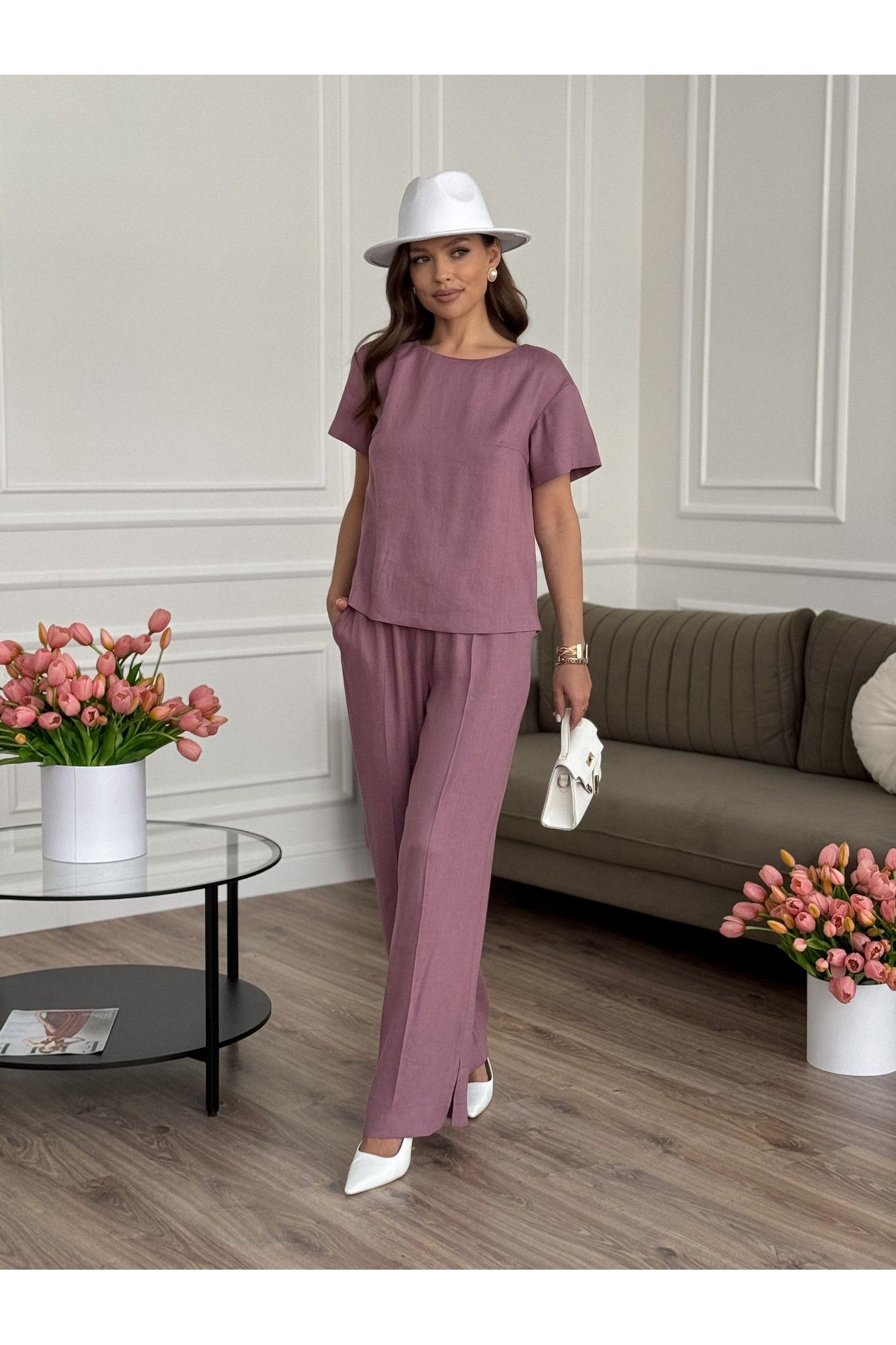 Костюм женский двух-предметный, состоящий из брюк и блузы. Брюки прямого широкого силуэта. По ПП брюк обработаны косые боковые карманы. Брюки обработаны поясом с резинкой. Блуза прямого силуэта, линия плечевого шва немного спущена. Перед с нагрудными вытачками из бокового шва. Спинка состоит из трех частей, две из которых между собой завязываются на шнурки и вставки из отделочной ткани. Вставка спинки короче основной длинны спинки. Низ изделия ассиметричный. Вырез горловины «лодочка». Рукава втачные одно шовные, короткие. Длина блузы - 61 см - 62 см Длина рукава блузы - 18 см Длина брюк - 107 см