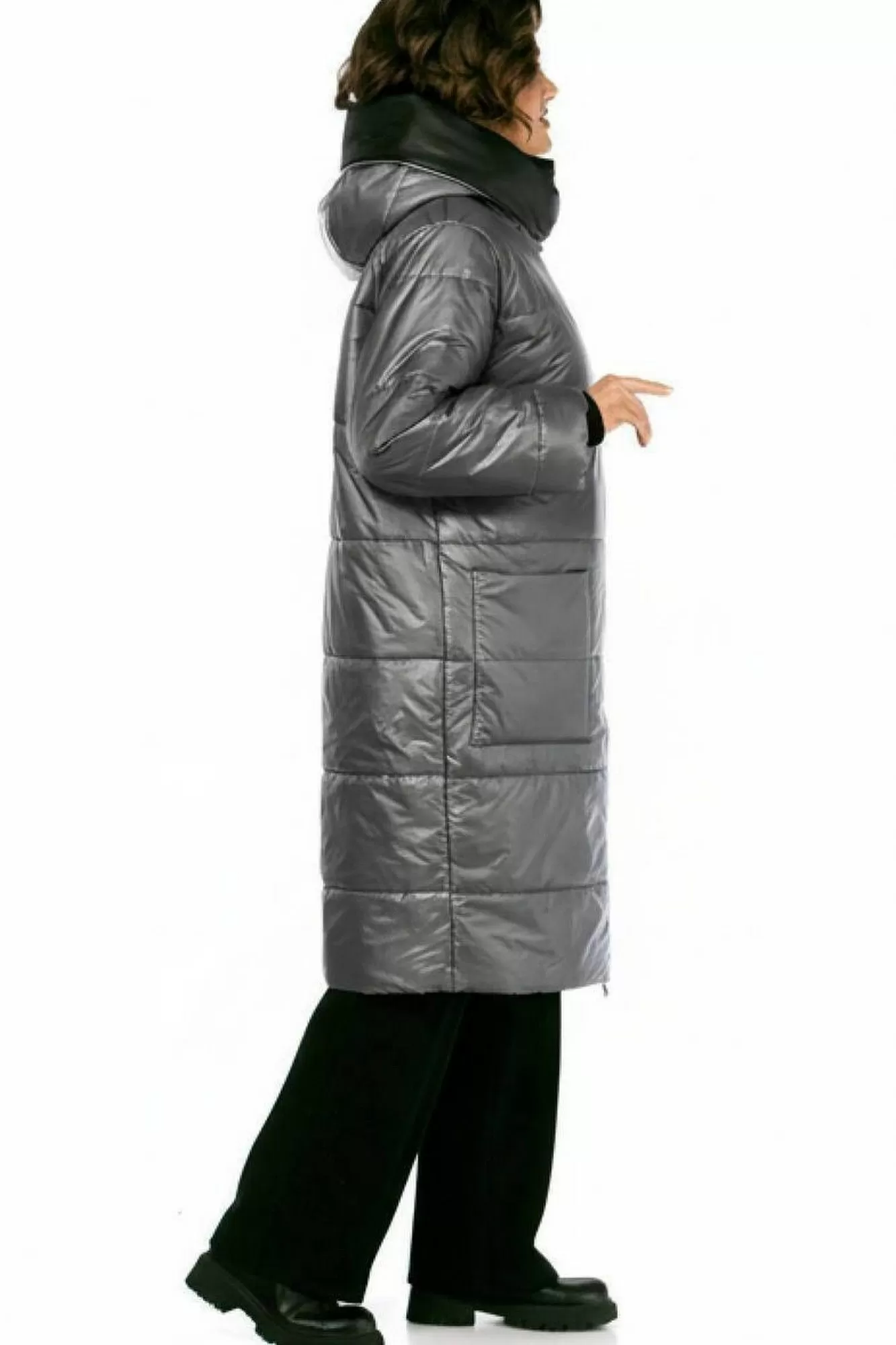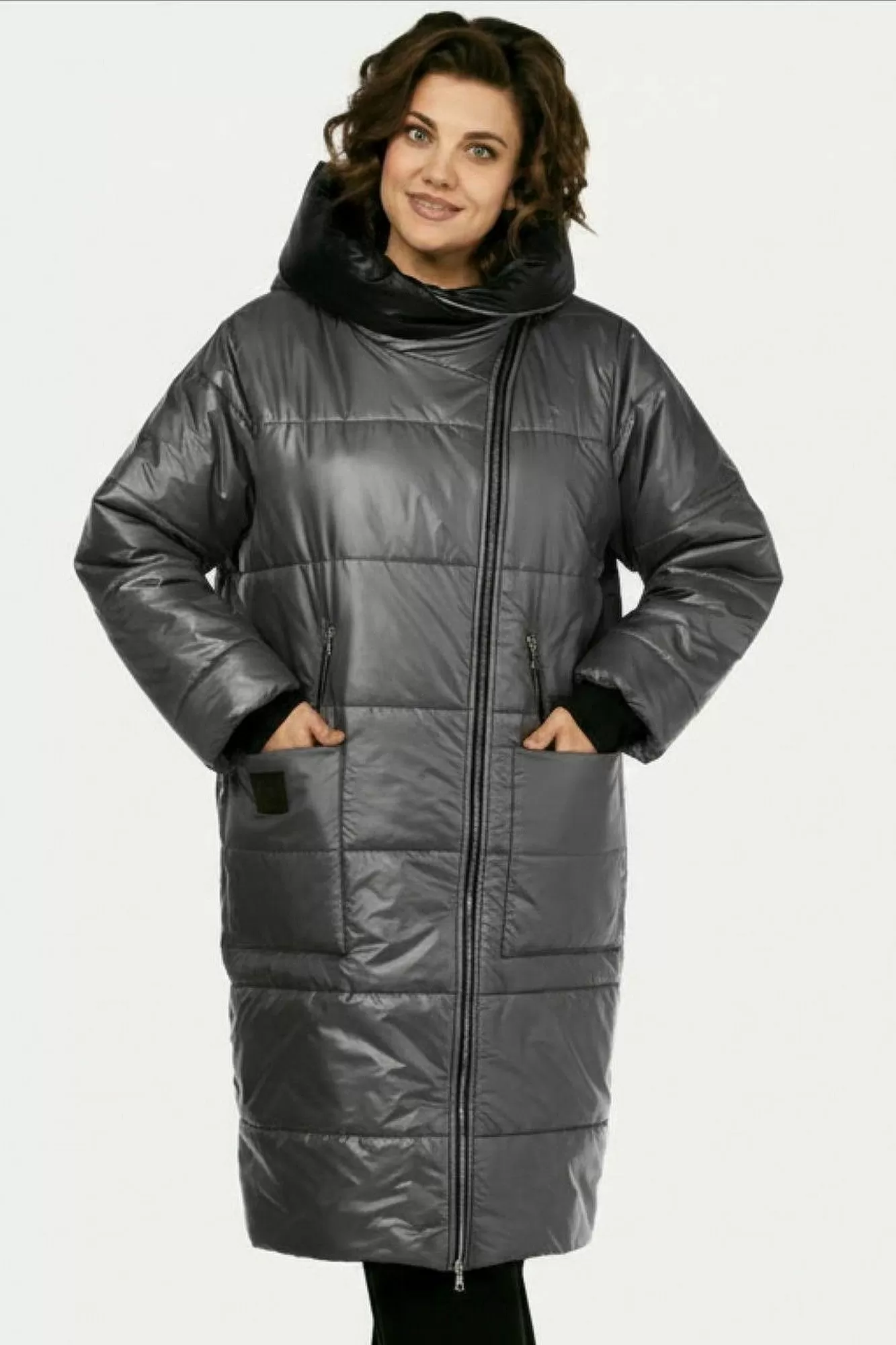 Пальто женское утепленное свободного кроя с ассиметричной застежкой на "молнию". Перед с прорезными карманами с "молнией" и накладными карманами. Правый накладной карман с отделочной нашивкой. Рукав втачной одношовный с трикотажным манжетом выходящим из-под подгибки. Объмный капюшон выполнен из 2-ух видов ткани. Утеплитель Hoopon 200, температурный режим до -10 градусов.