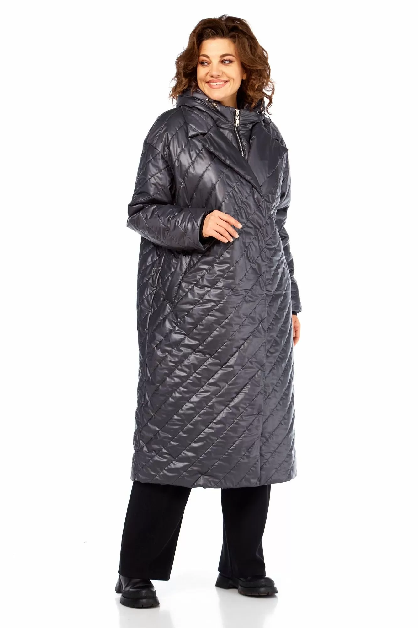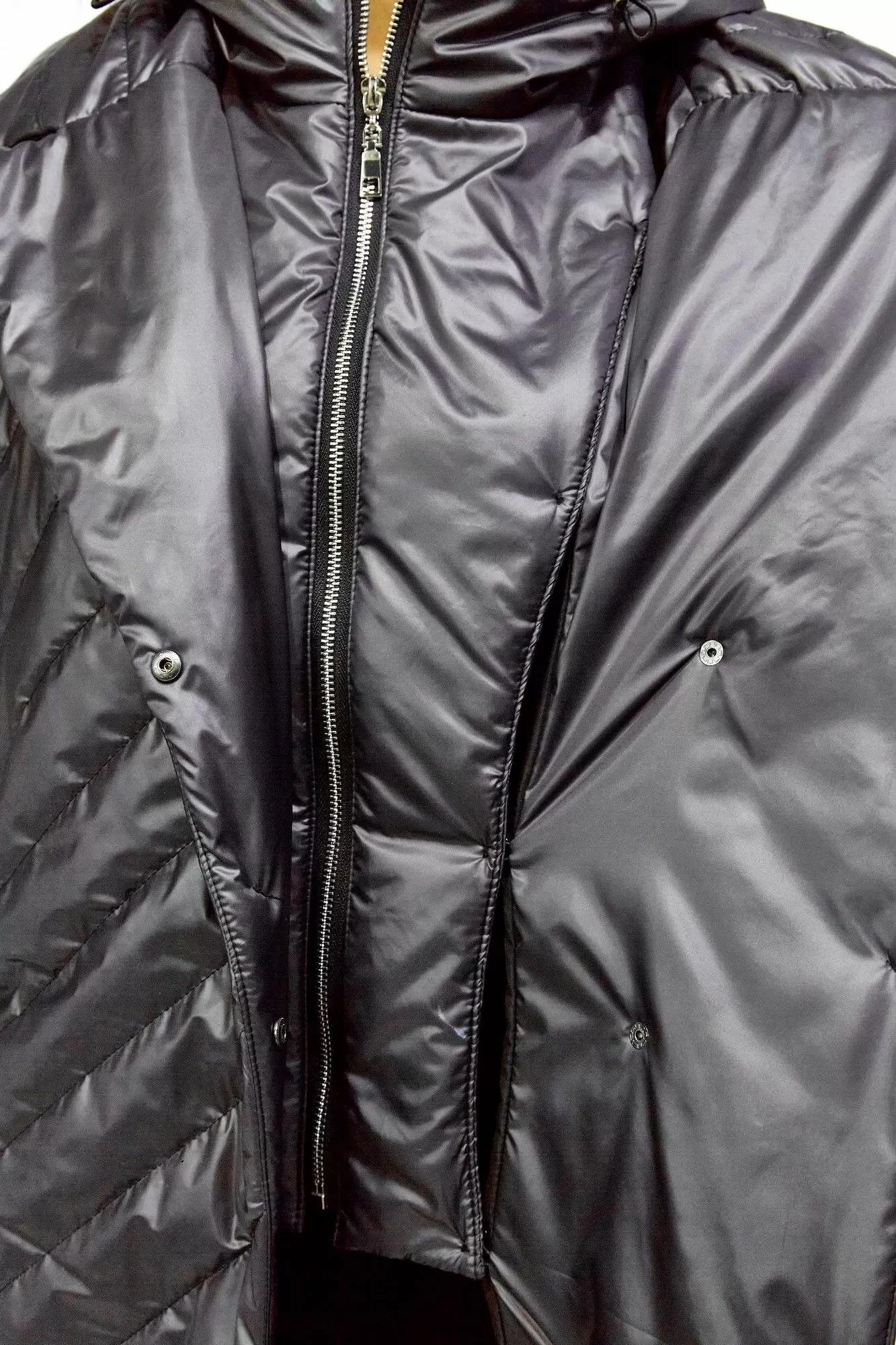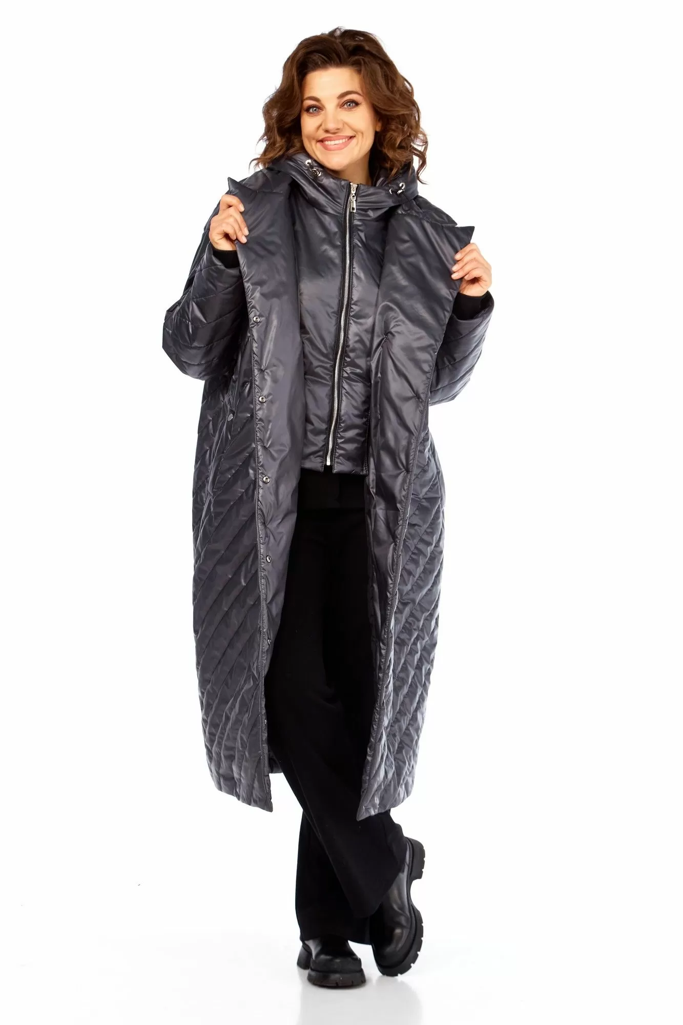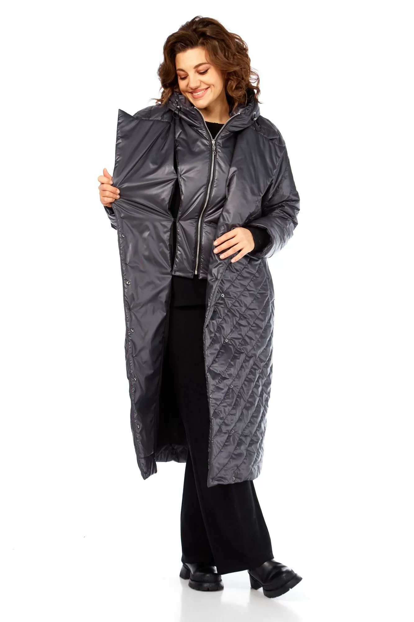 Пальто женское со смещенной застежкой на кнопки. Перед с боковыми карманами "с листочкой". Рукав втачной, одношовный с трикотажными манжетами выходящими из-под подгибки низа. Воротник отложной с лацканами. В пальто пристегивается на петли и пуговицы манишка с капюшоном. Капюшон с внутренней кулисой регулируется по ширине. Манишка застегивается на "молнию". Пояс обтачной. Температурный режим до -5 градусов.