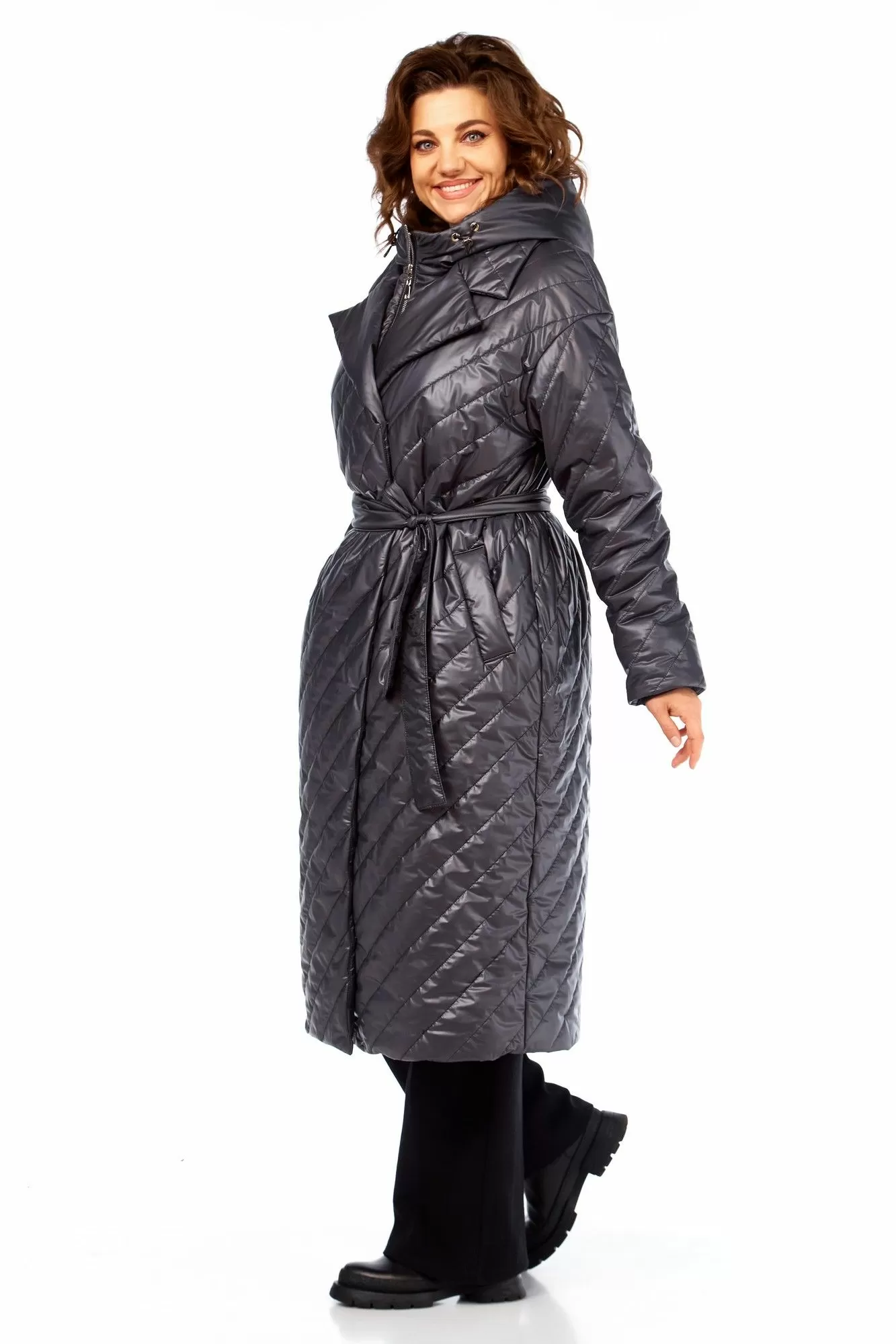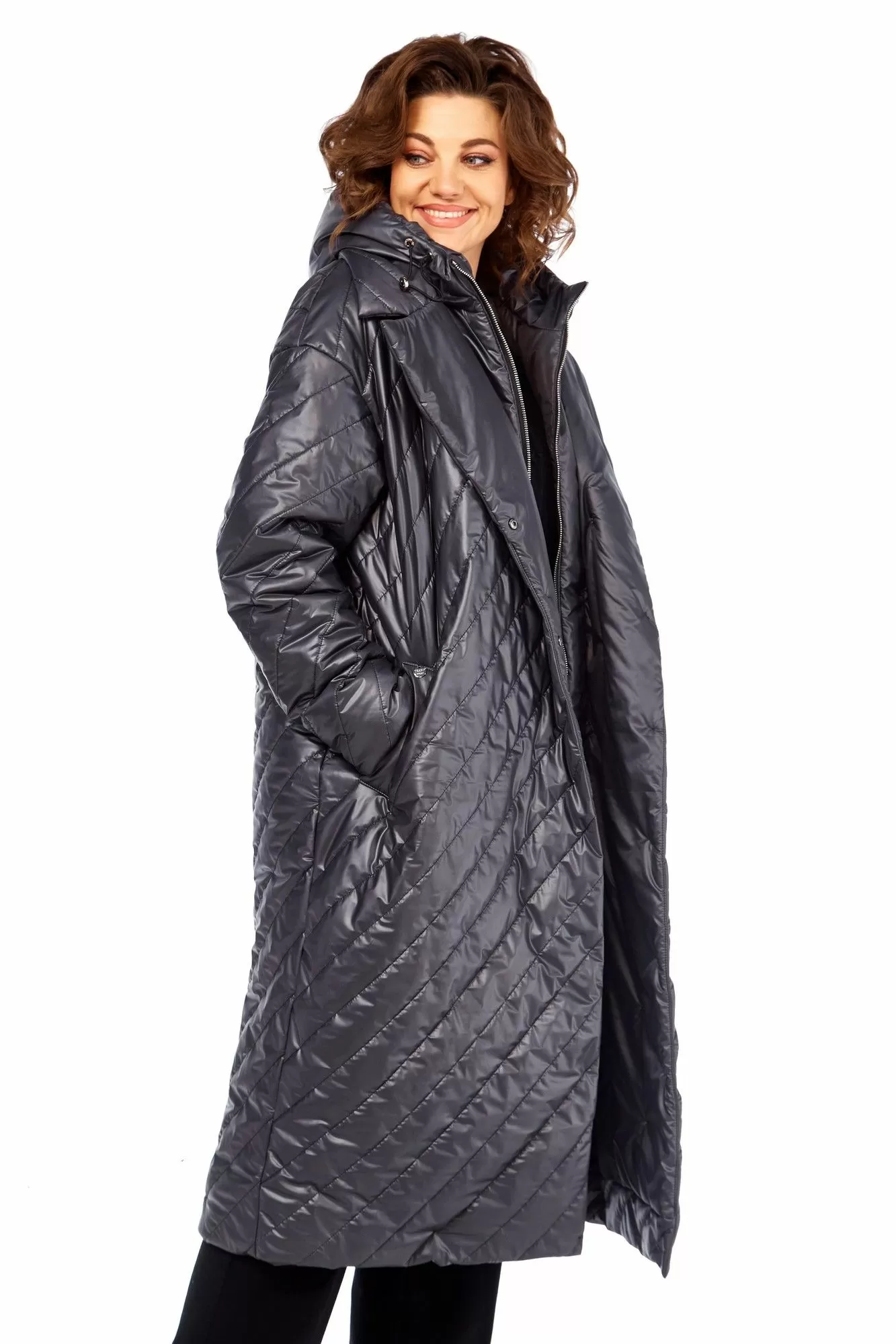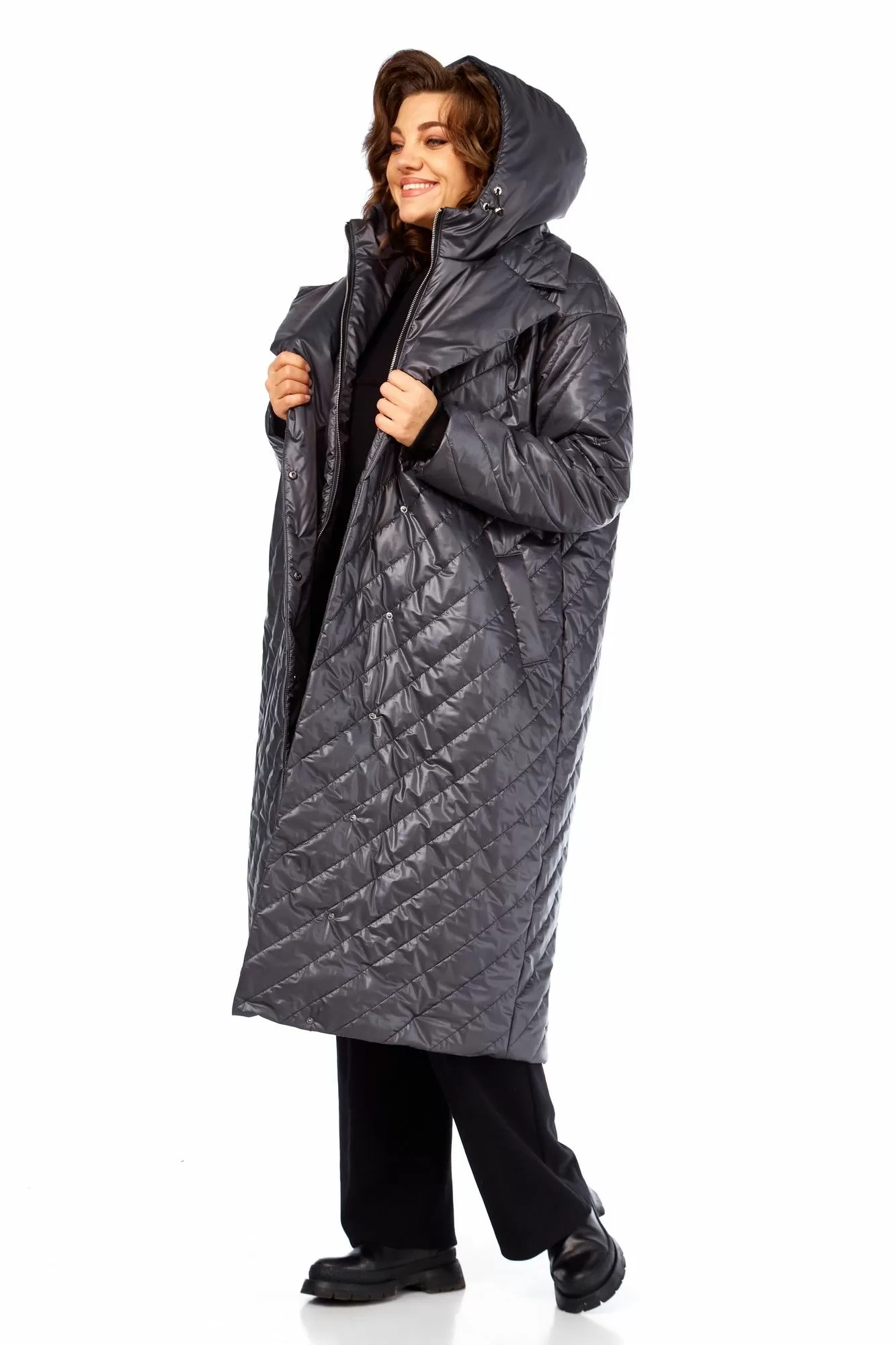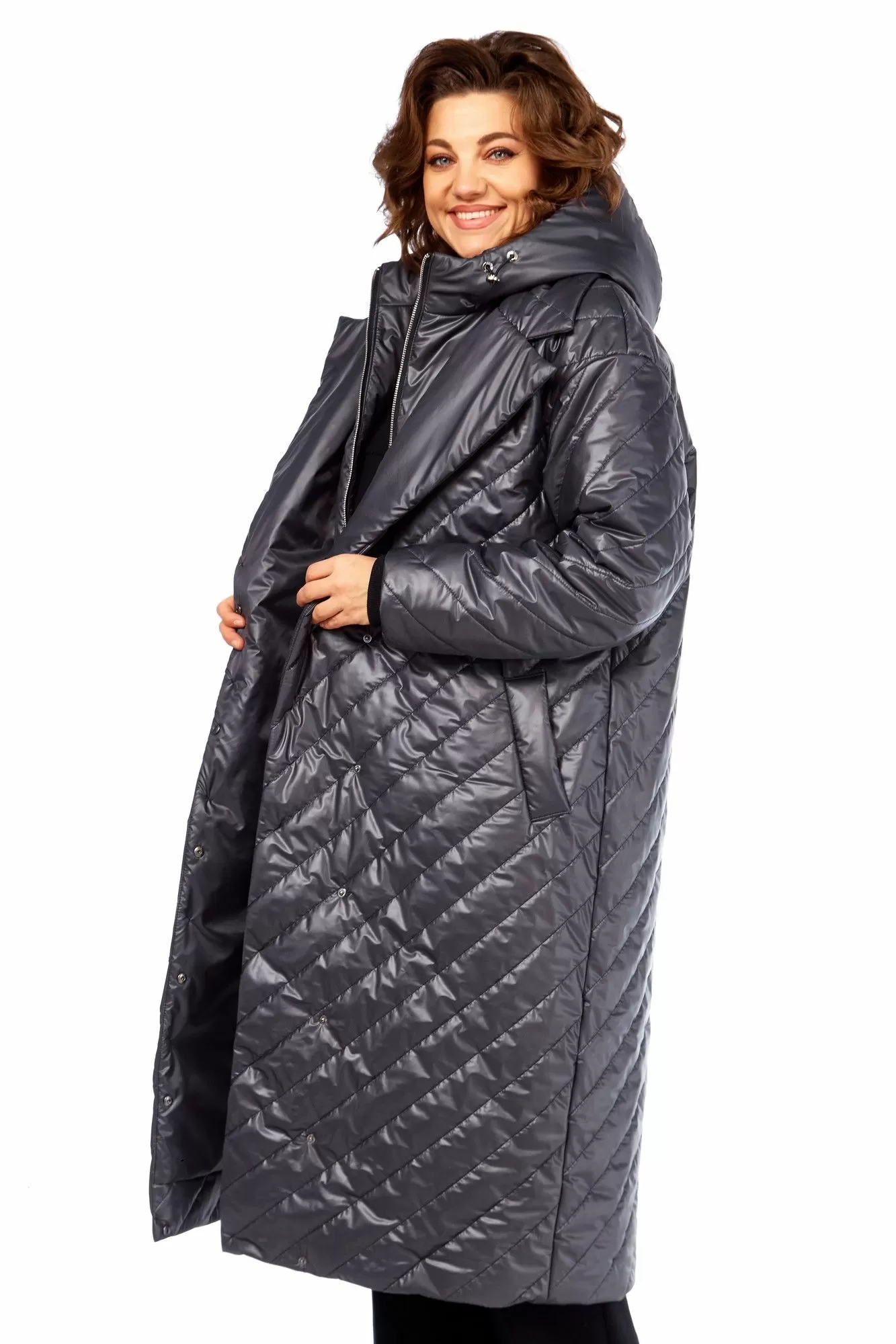 Пальто женское со смещенной застежкой на кнопки. Перед с боковыми карманами "с листочкой". Рукав втачной, одношовный с трикотажными манжетами выходящими из-под подгибки низа. Воротник отложной с лацканами. В пальто пристегивается на петли и пуговицы манишка с капюшоном. Капюшон с внутренней кулисой регулируется по ширине. Манишка застегивается на "молнию". Пояс обтачной. Температурный режим до -5 градусов.