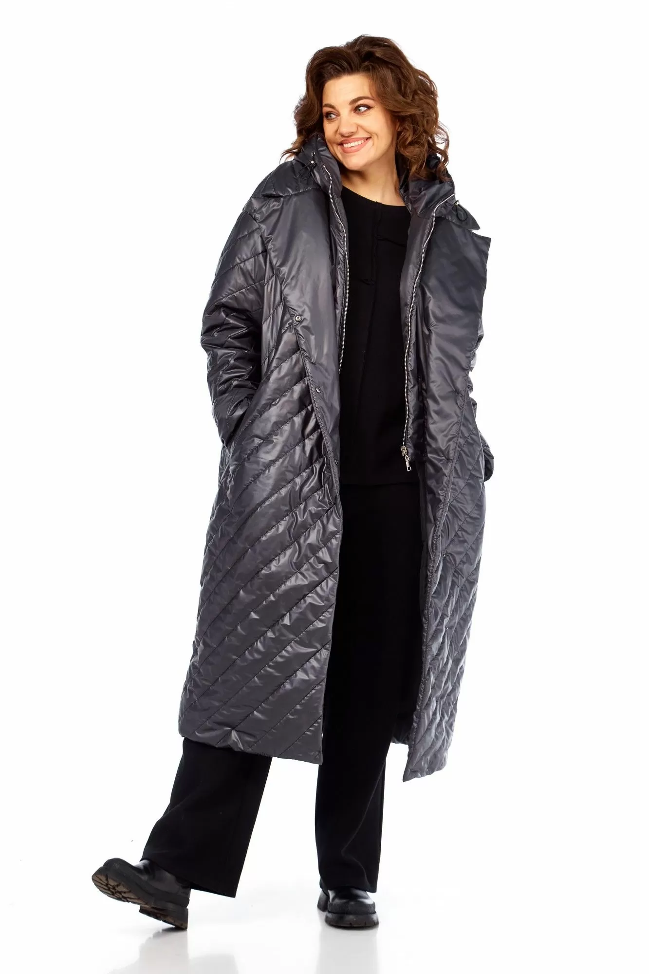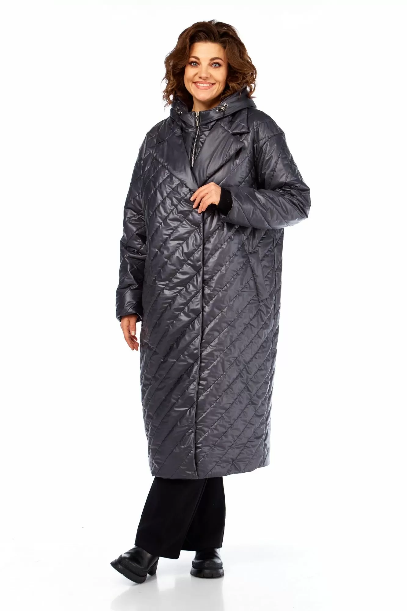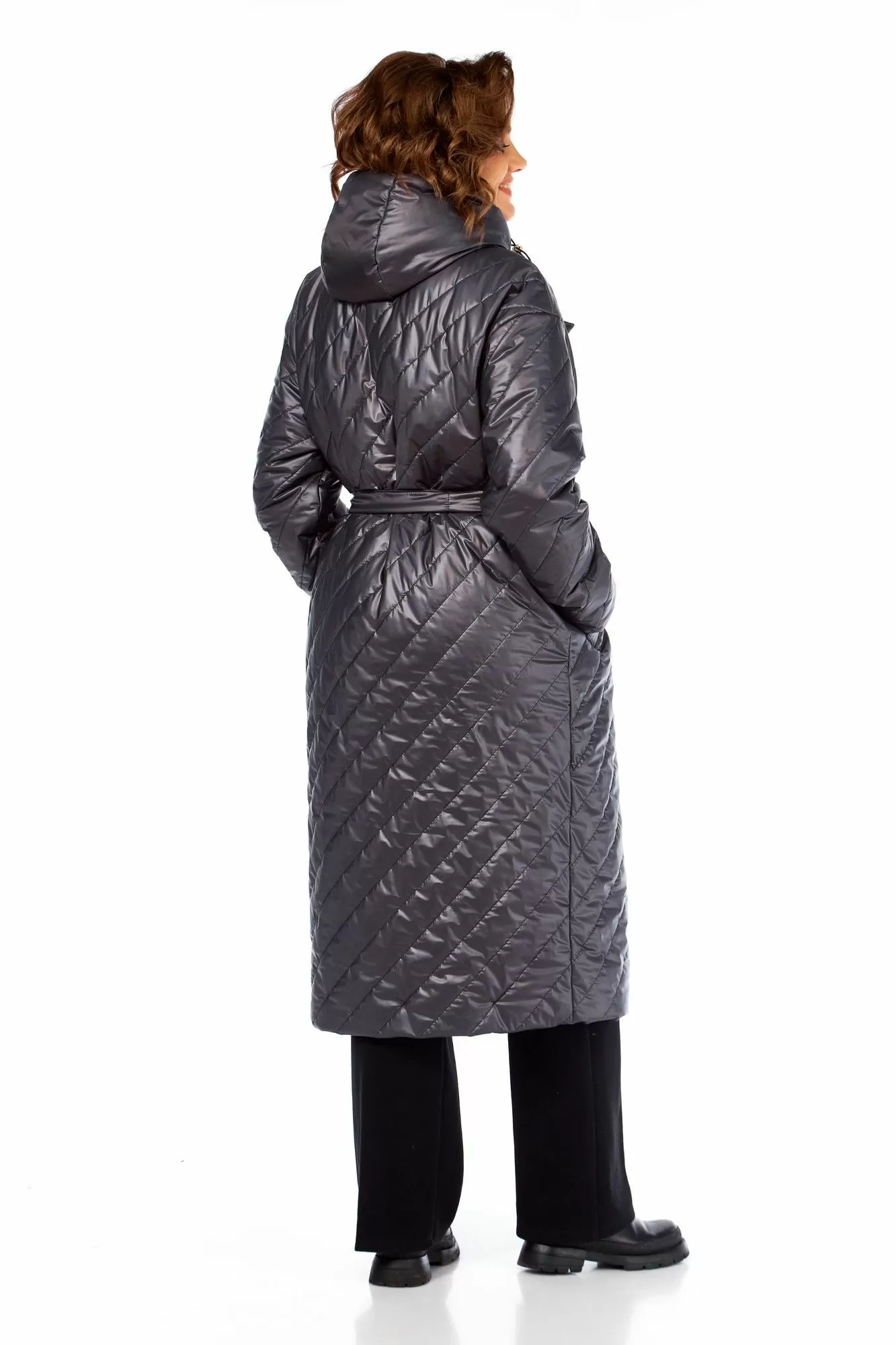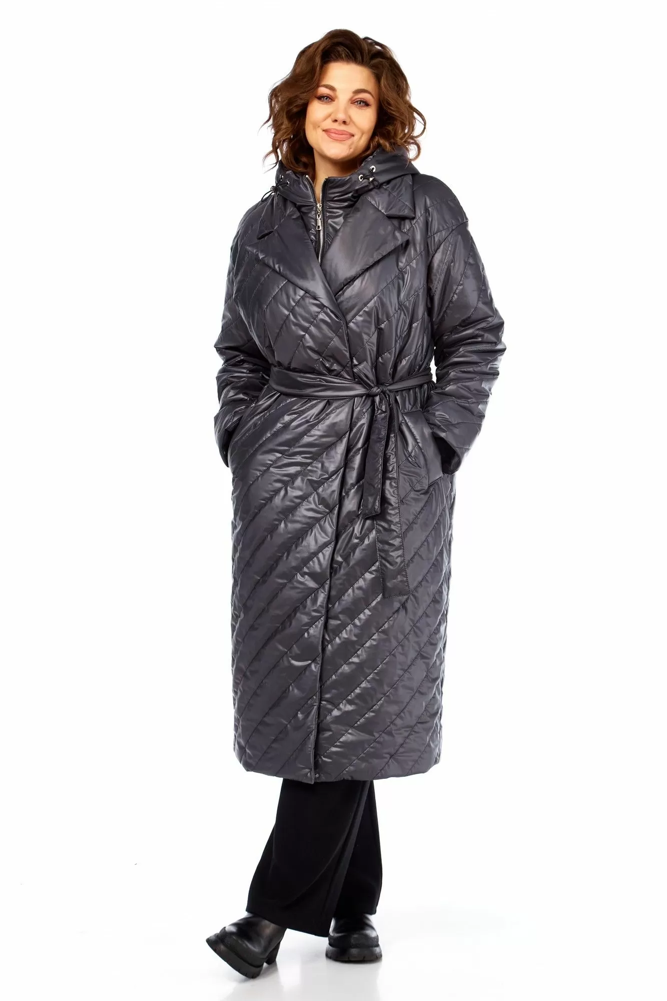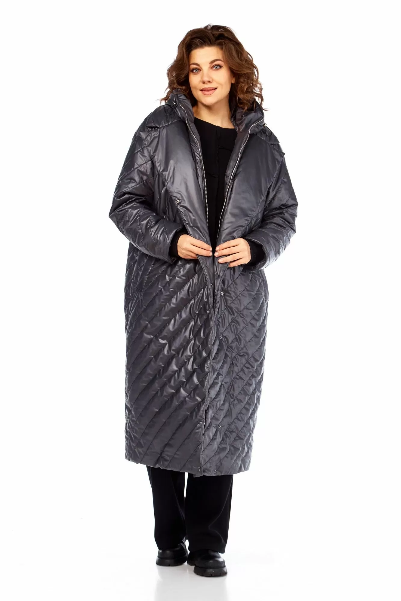 Пальто женское со смещенной застежкой на кнопки. Перед с боковыми карманами "с листочкой". Рукав втачной, одношовный с трикотажными манжетами выходящими из-под подгибки низа. Воротник отложной с лацканами. В пальто пристегивается на петли и пуговицы манишка с капюшоном. Капюшон с внутренней кулисой регулируется по ширине. Манишка застегивается на "молнию". Пояс обтачной. Температурный режим до -5 градусов.