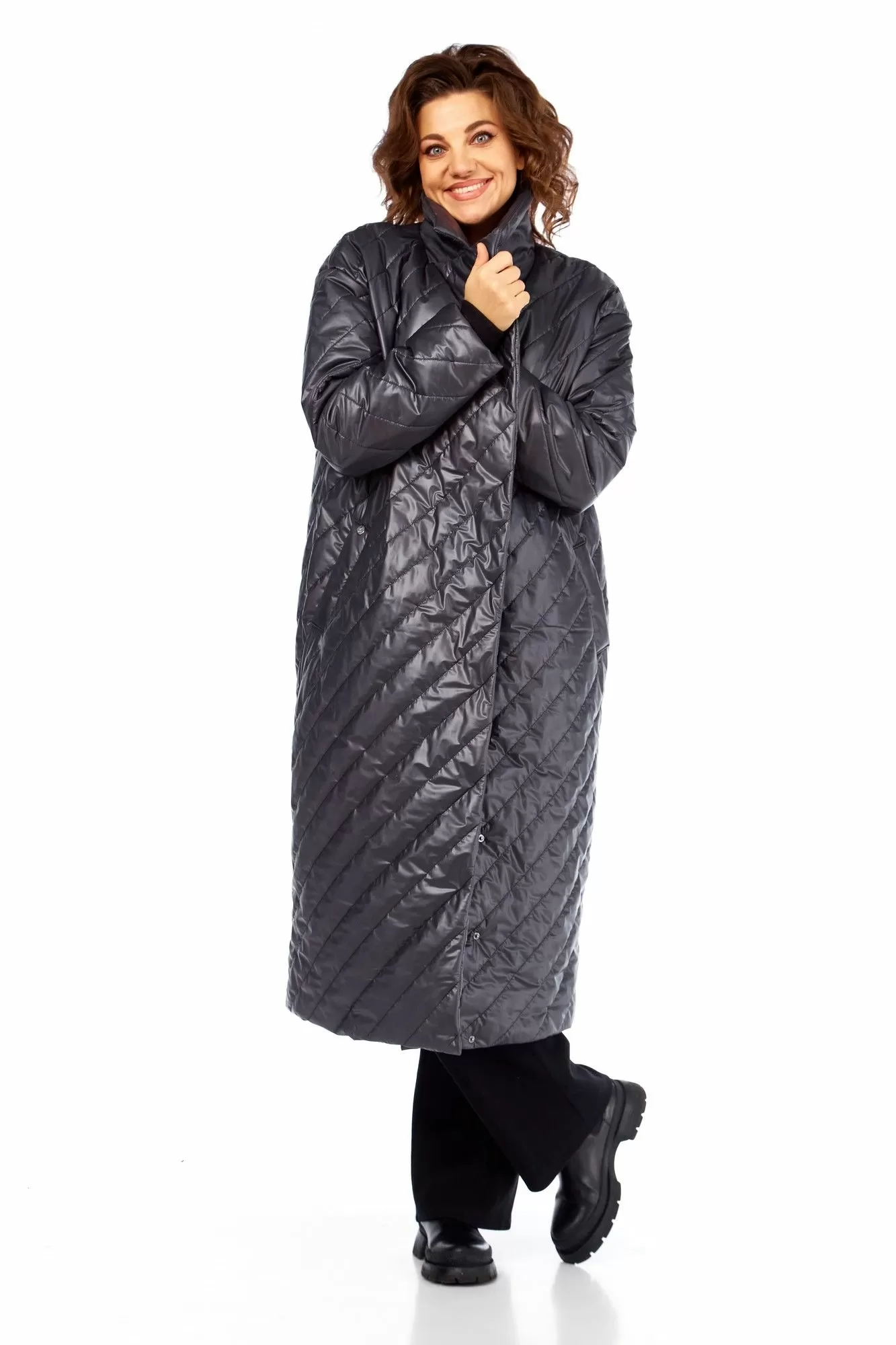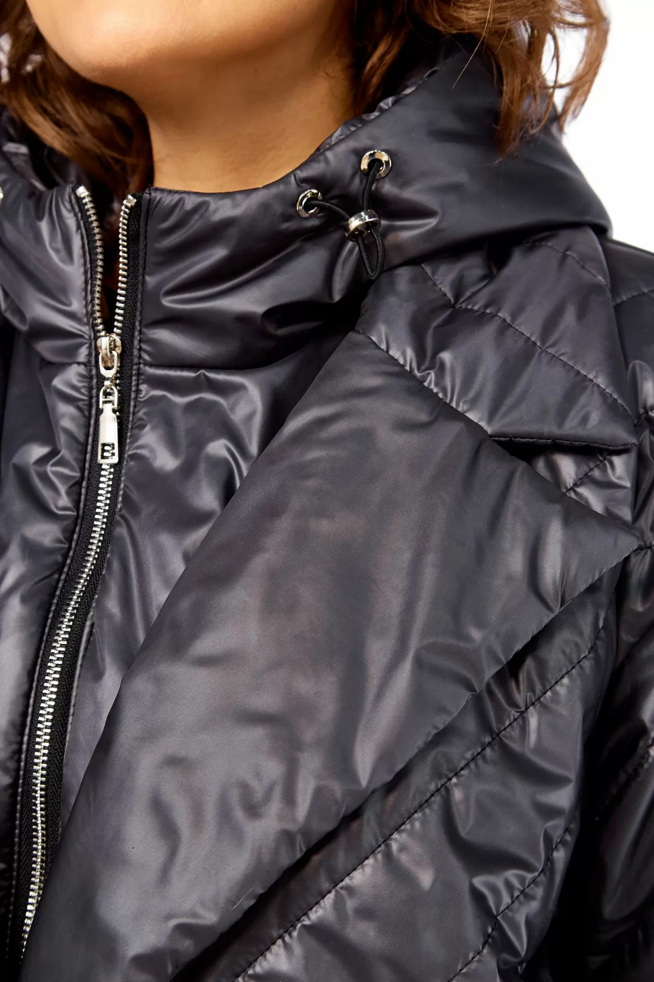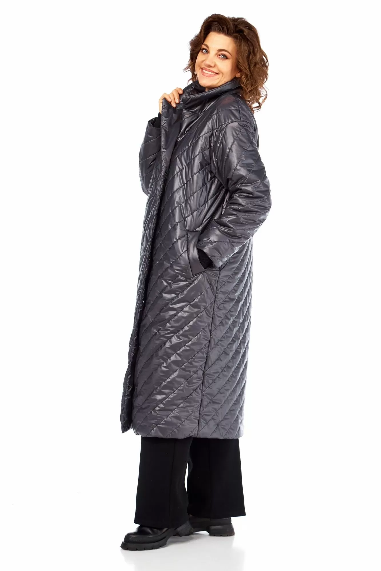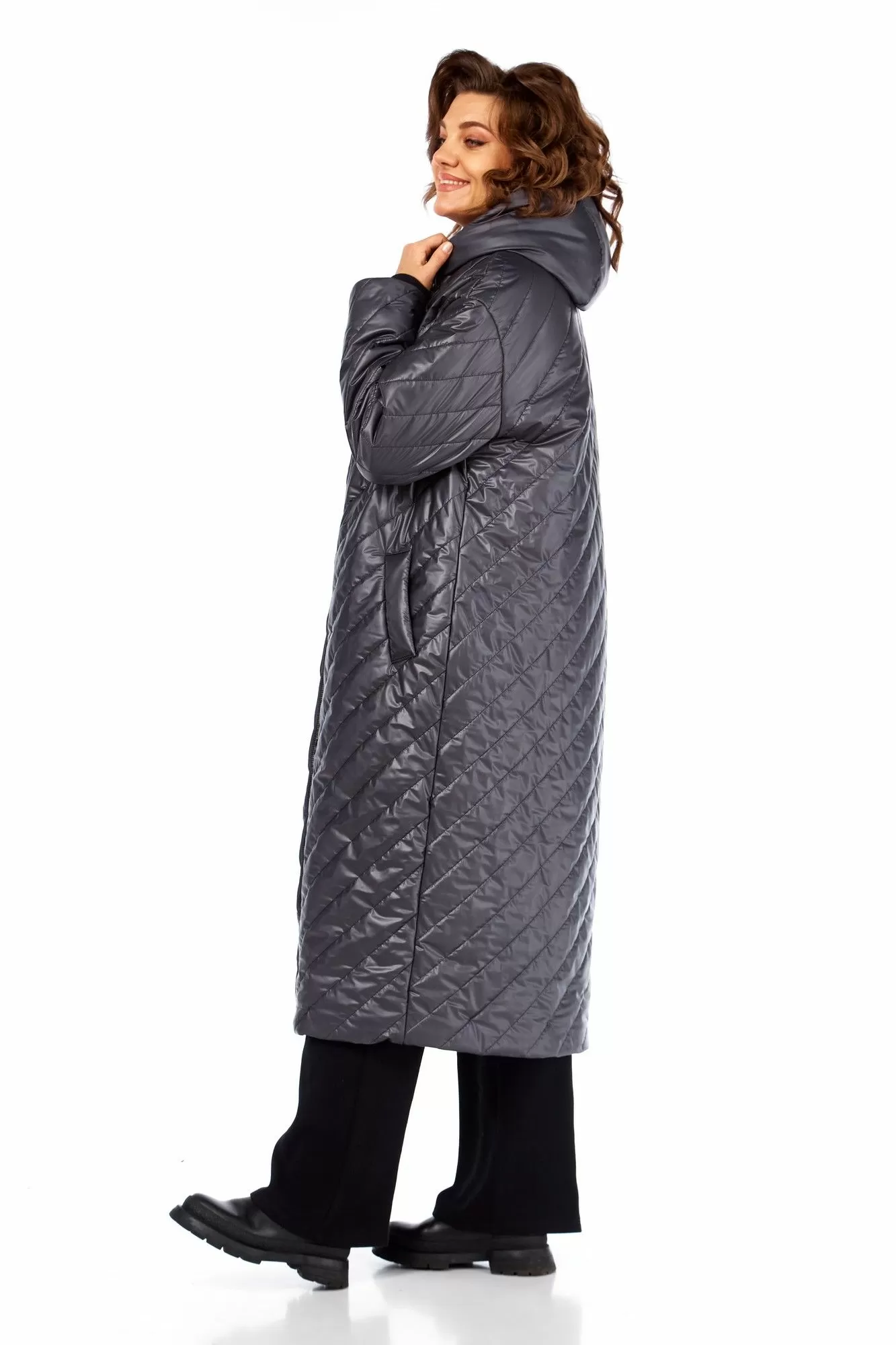 Пальто женское со смещенной застежкой на кнопки. Перед с боковыми карманами "с листочкой". Рукав втачной, одношовный с трикотажными манжетами выходящими из-под подгибки низа. Воротник отложной с лацканами. В пальто пристегивается на петли и пуговицы манишка с капюшоном. Капюшон с внутренней кулисой регулируется по ширине. Манишка застегивается на "молнию". Пояс обтачной. Температурный режим до -5 градусов.