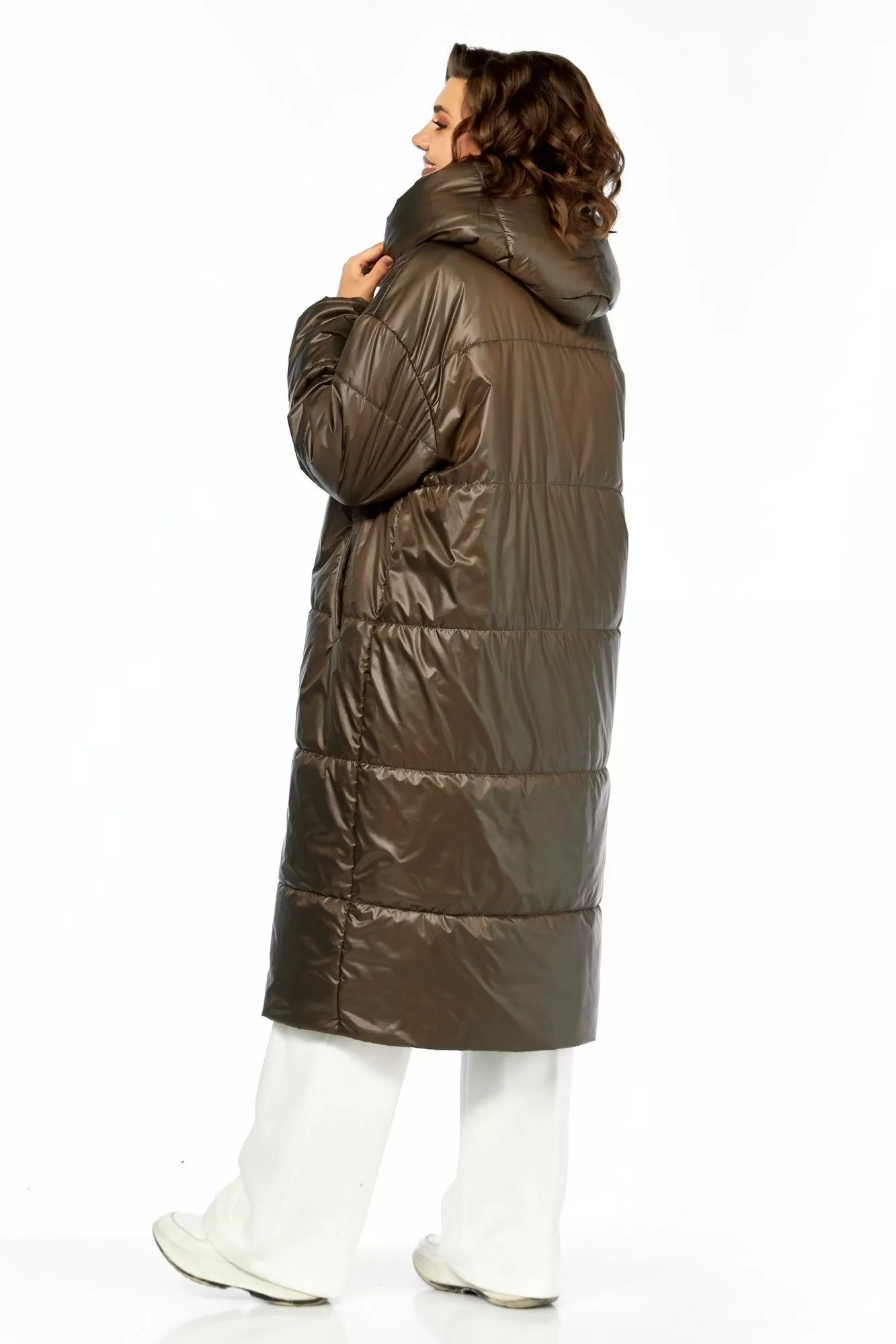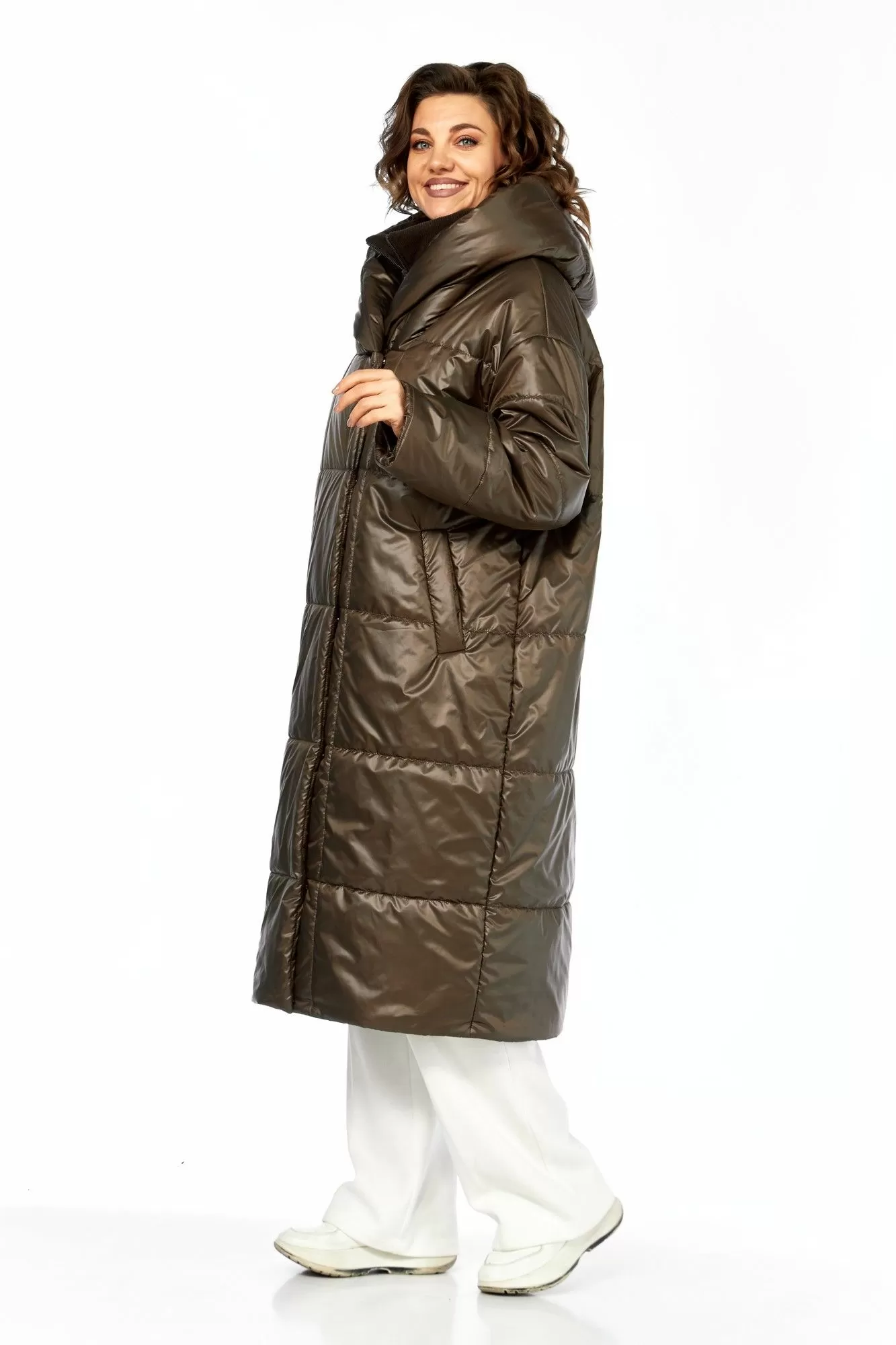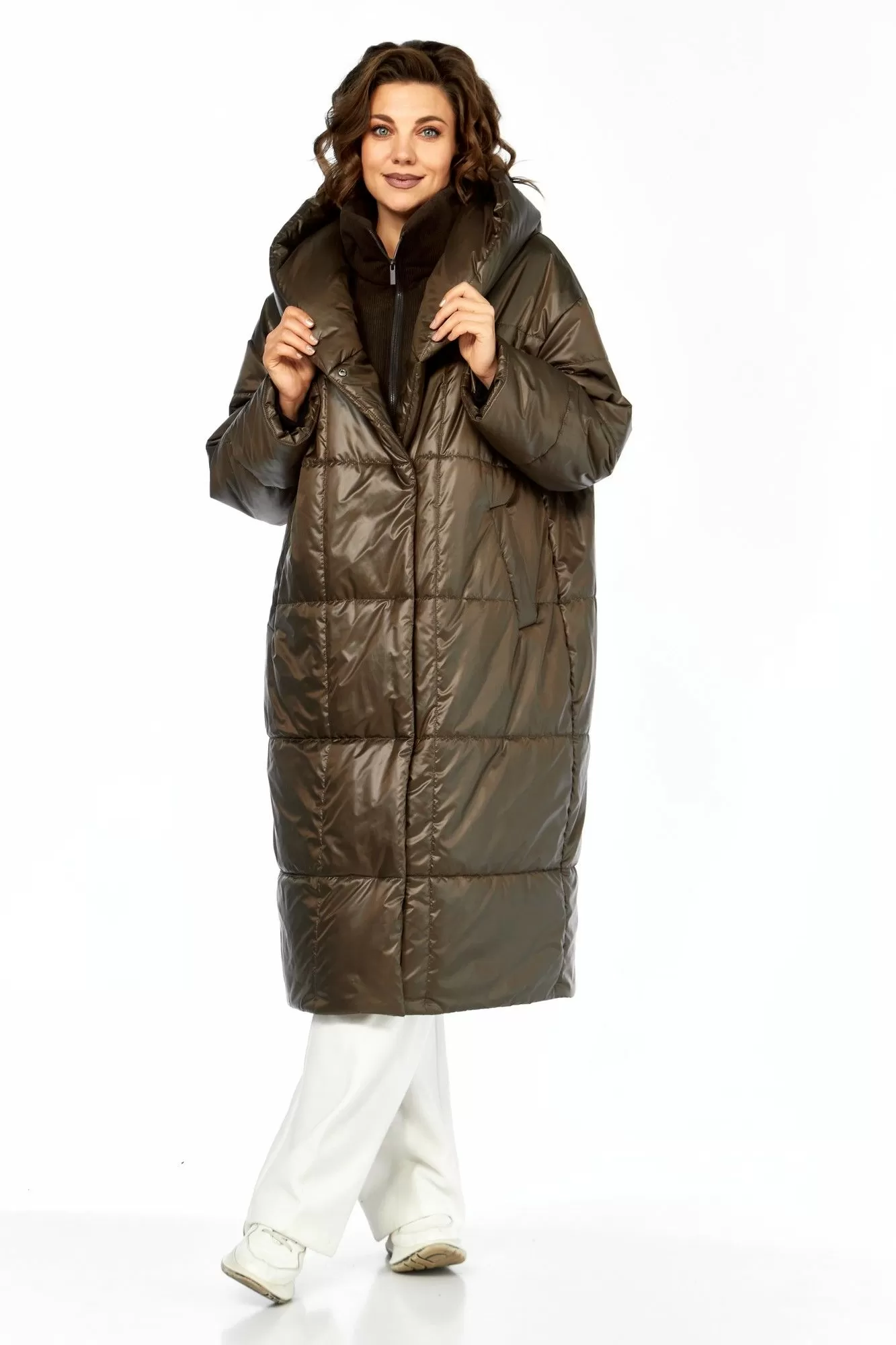 Пальто женскоеполуприлегающего силуэта со смещенной застежкой на кнопки. По переду прорезные карманы с листочкой. Рукав втачной одношовный с притачным манжетом по низу из отделочной ткани (довяз). Капюшон с объемный отделочной деталью по отлету, по горловине переда заложены складки. В качестве отделки используется манишка съемная с застежкой на тесьму-молнию (из отделочной ткани) фиксируется с помощью пуговиц и навесных петель-резинок на изделии. Используется утеплитель синтепон 200. Подходит под температурный режим до -10 градусов.