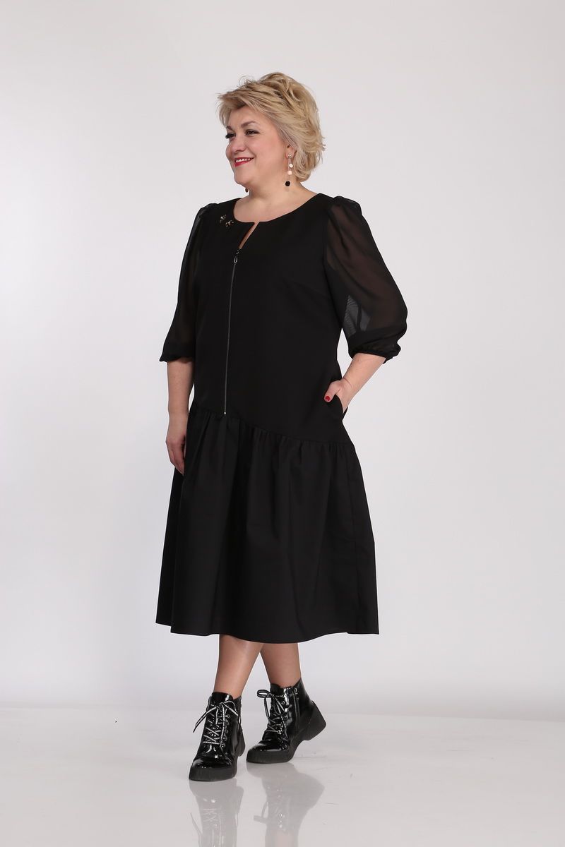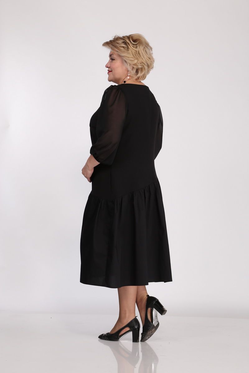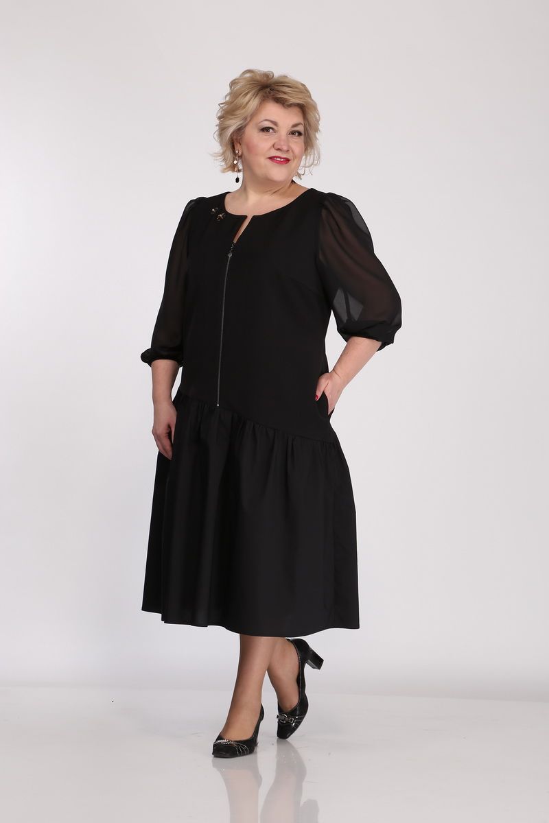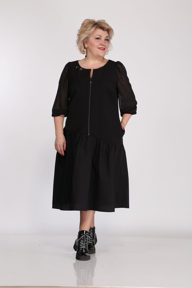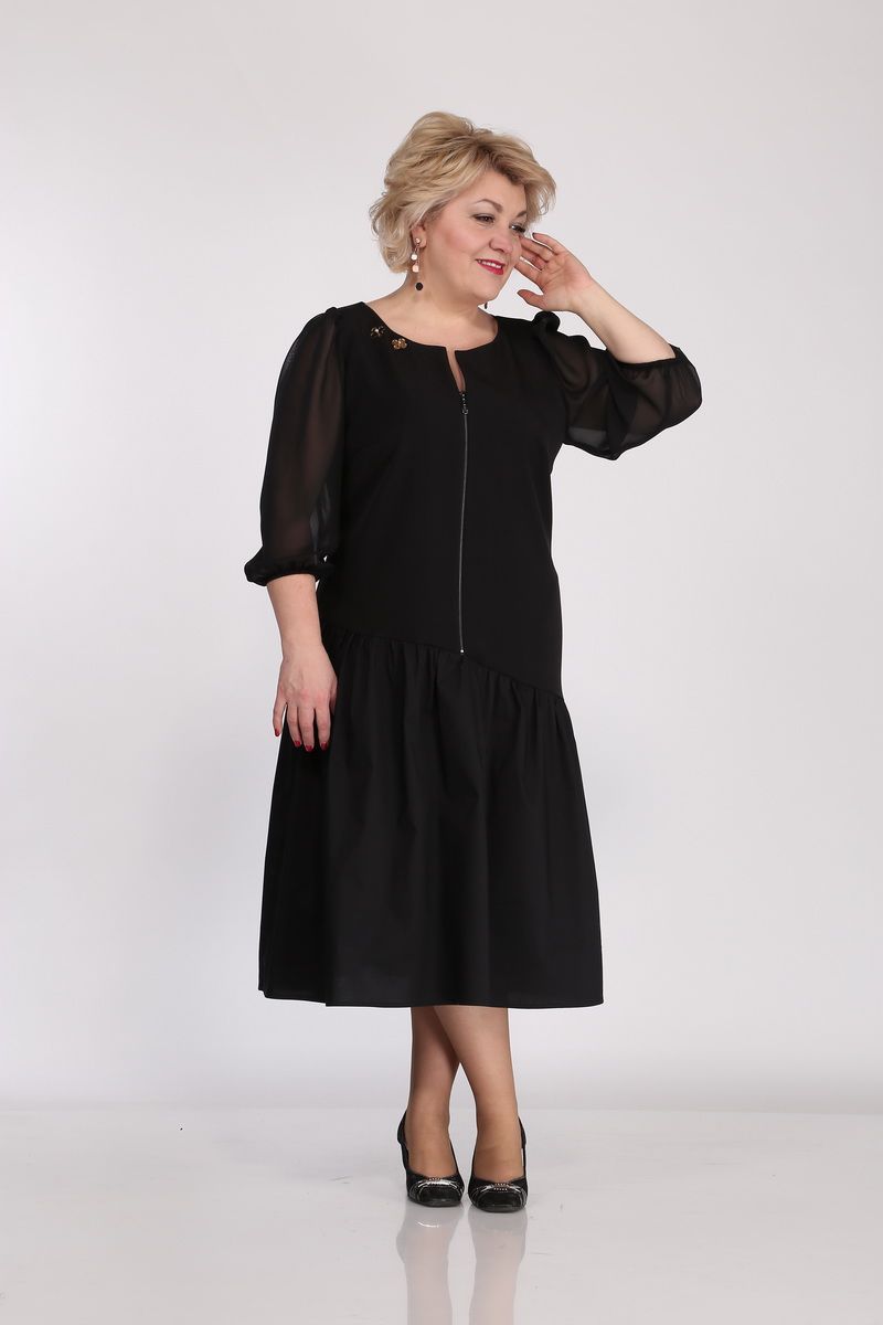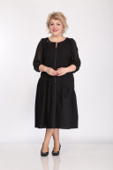 Платье женское полуприлегающего силуэта. Горловина круглая с V-образным вырезом. По переду действующая молния, нагрудные выточки. Рукав свободный из шифоновой ткани, низ рукава собран на резинку. По бедрам платье ассиметрично отрезное с приточным на сборке воланом. С одной стороны платья в боковом шве вставлен карман. У горловины пришивной декор.