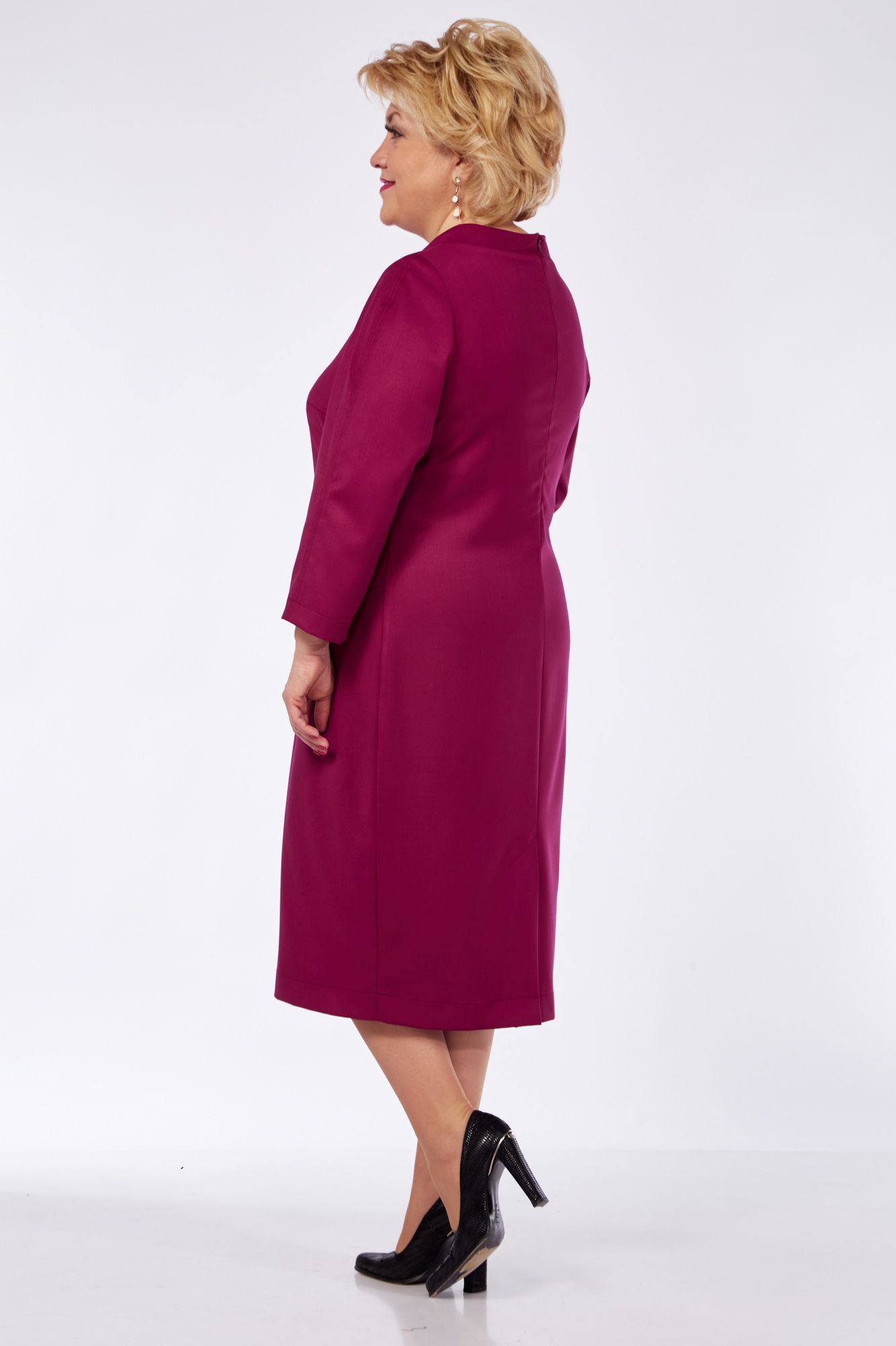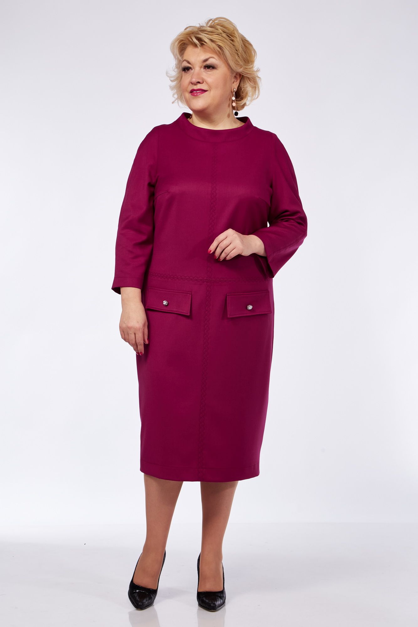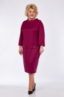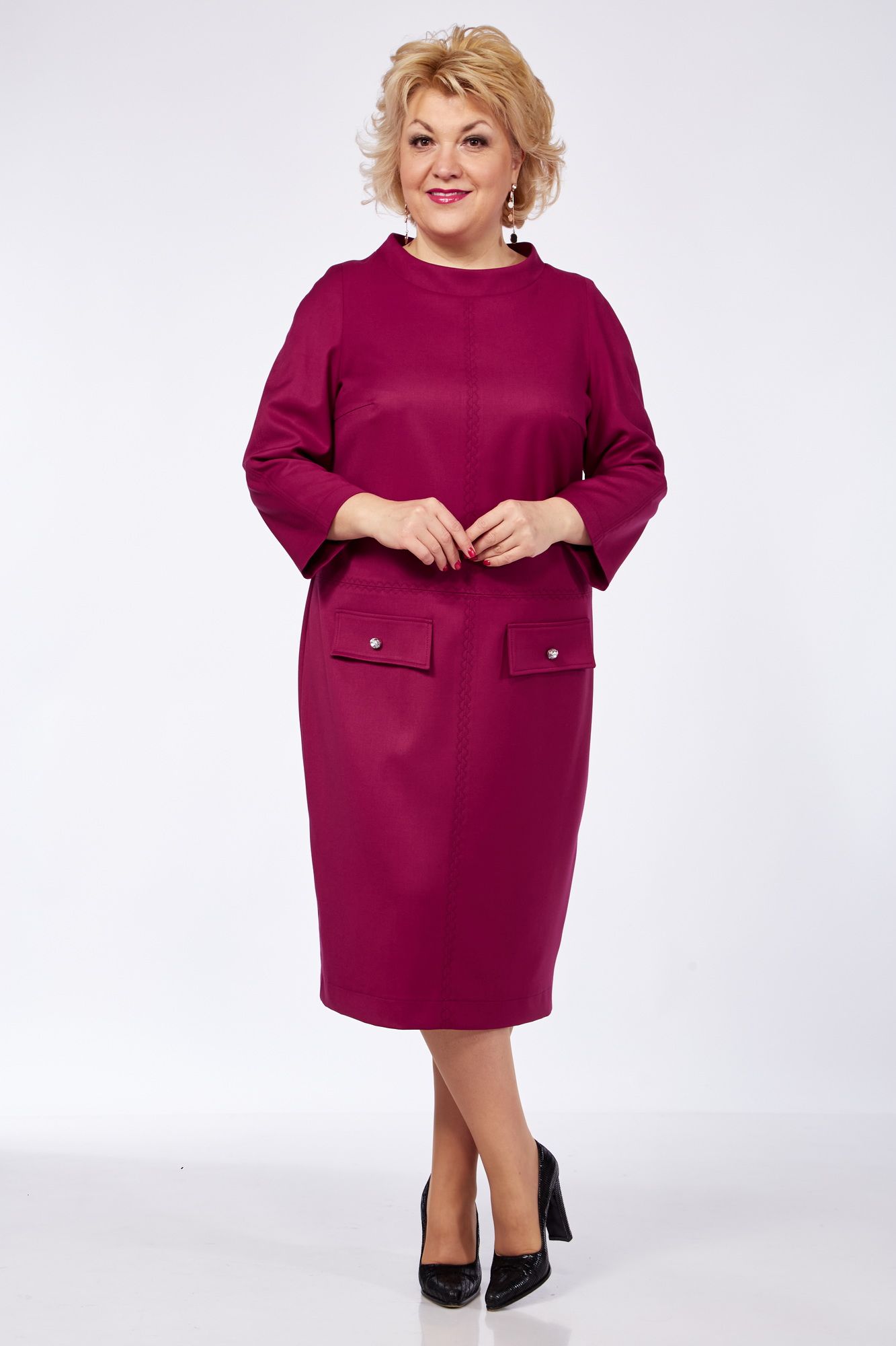 Платье женское полуприлегающего силуэта. Вырез горловины круглый со стойкой. Рукав втачной ¾ одношовный. По переду декоративные швы и отстрочки. Накладные клапаны с декоративными камнями. Спинка со средним швом, молнией и шлицей.