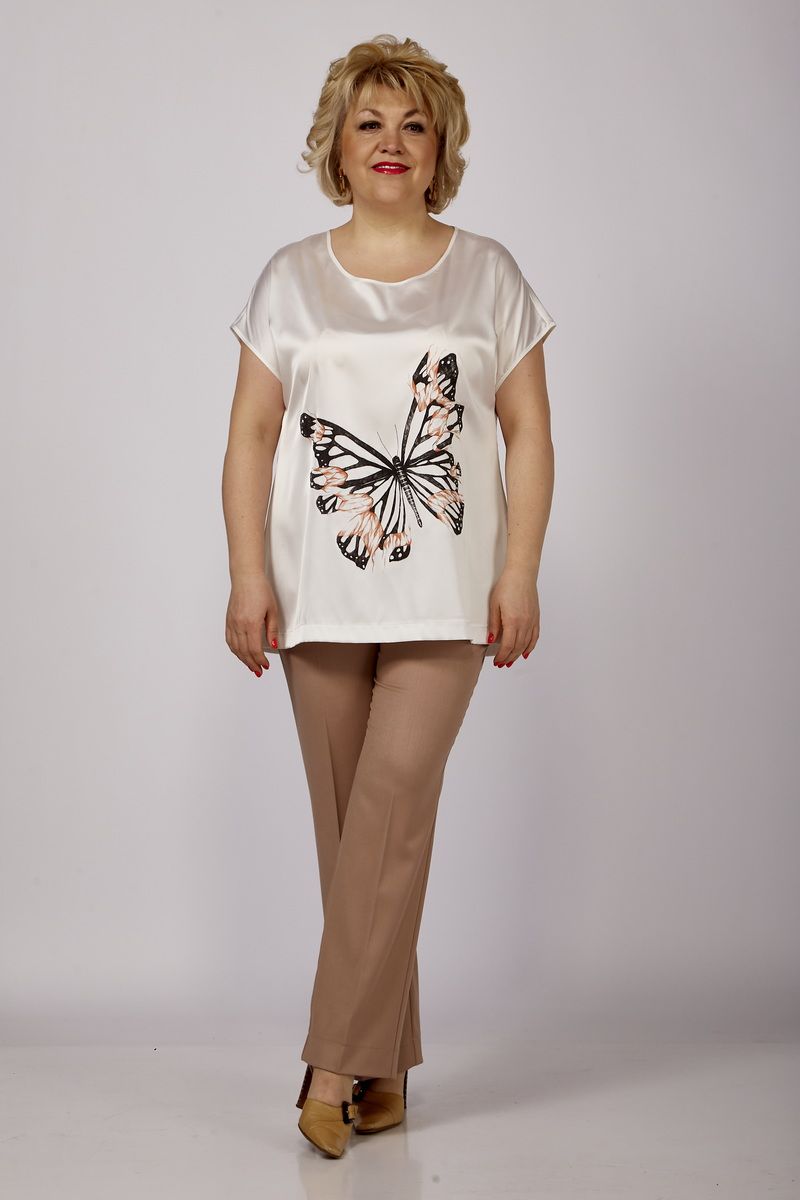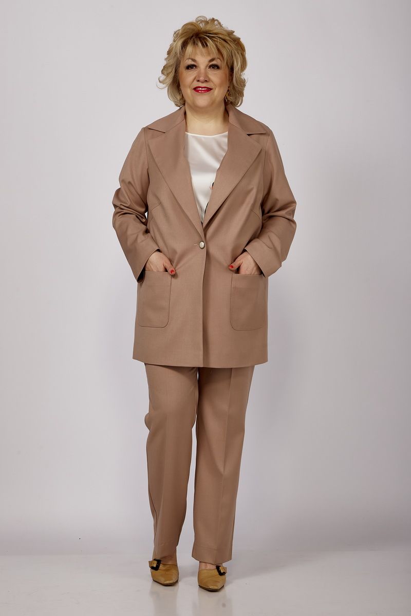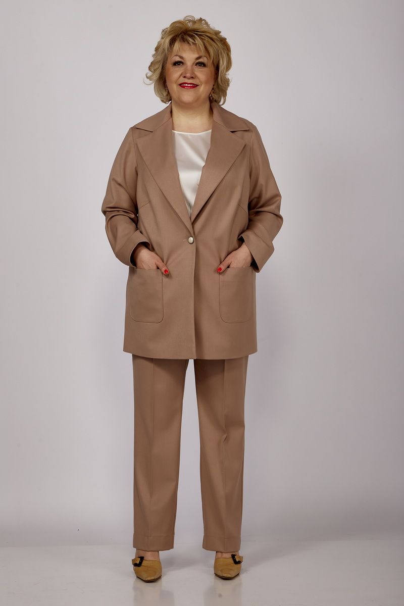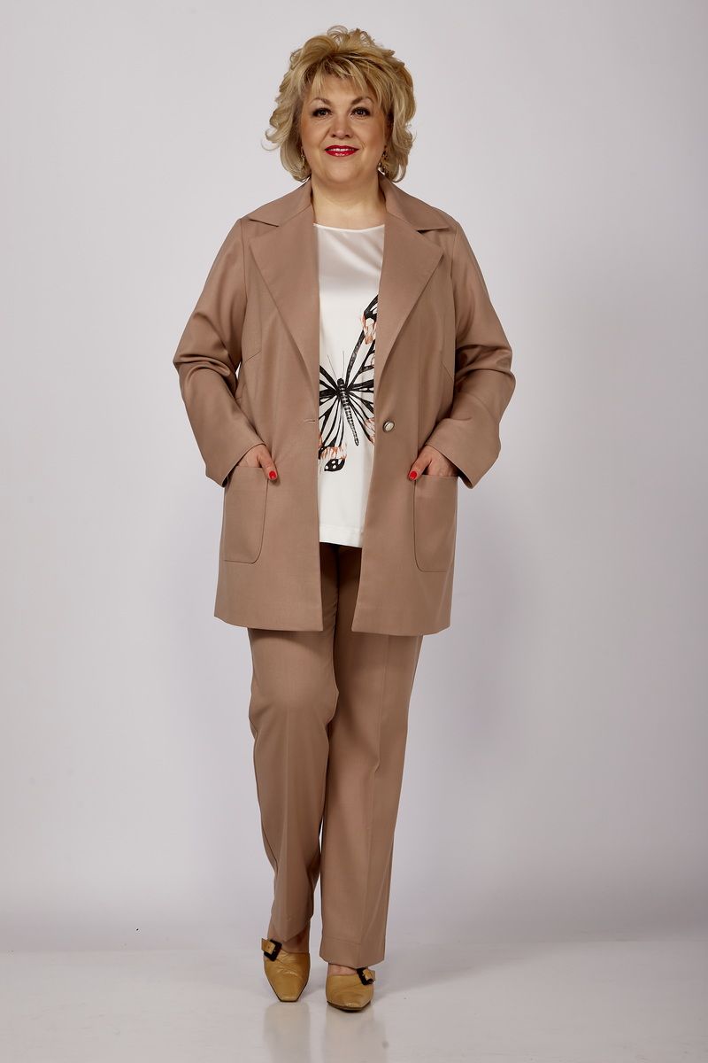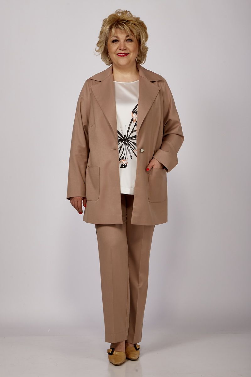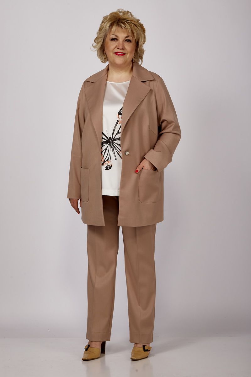 Комплект женский 3-х предметный. Состоит из жакета, топа и брюк. Жакет однобортный, свободного силуэта на подкладке. На передней полке расположены нагрудные выточки и два накладных кармана. Спинка со средним швом. Воротник пиджачного типа. Рукава жакета одношовные. Застежка на 1 петлю и пуговицу. Топ свободного прилегания. По переду расположена печать «Бабочка». Спинка топа на кокетке. Рукав спущен. Брюки классического кроя, прямые. Отрезной пояс, по бокам пояса вставлена резинка. Пояс на пуговице.