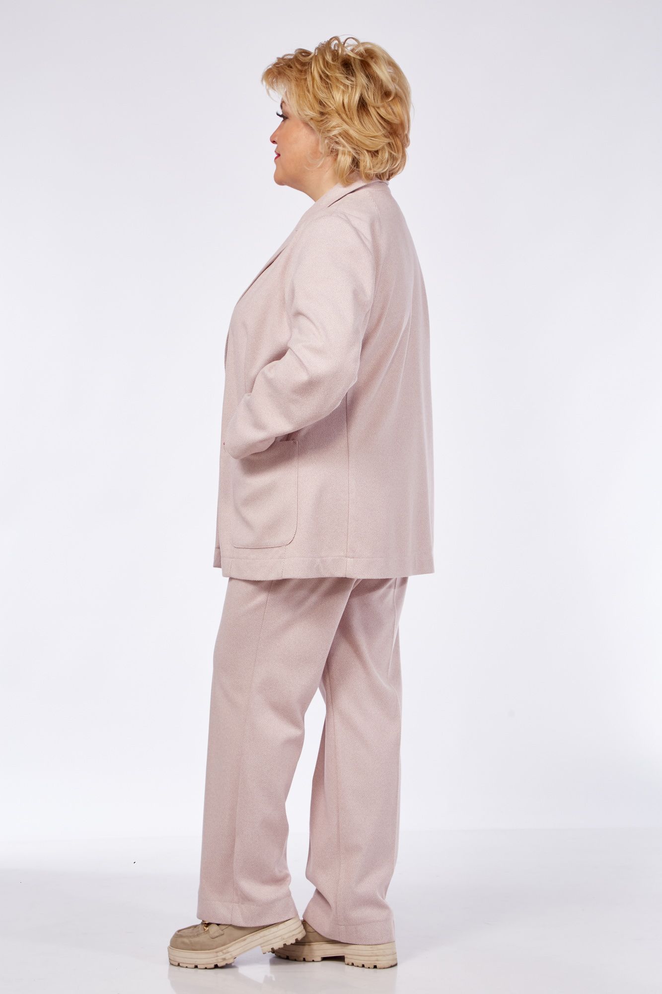 Костюм женский двух предметный состоит из жакета и брюк. Комплект выполнен из теплой и уютной ткани Жакет классический, свободного силуэта. Воротник отложной.. Рукав втачной. Жакет на двух пуговица. Спереди жакета выточки по линии талии. Карманы по переду накладные. По спинке рельефные выточки. Жакет без подкладки. Брюки прямые на притачном поясе. Пояс на пуговице.