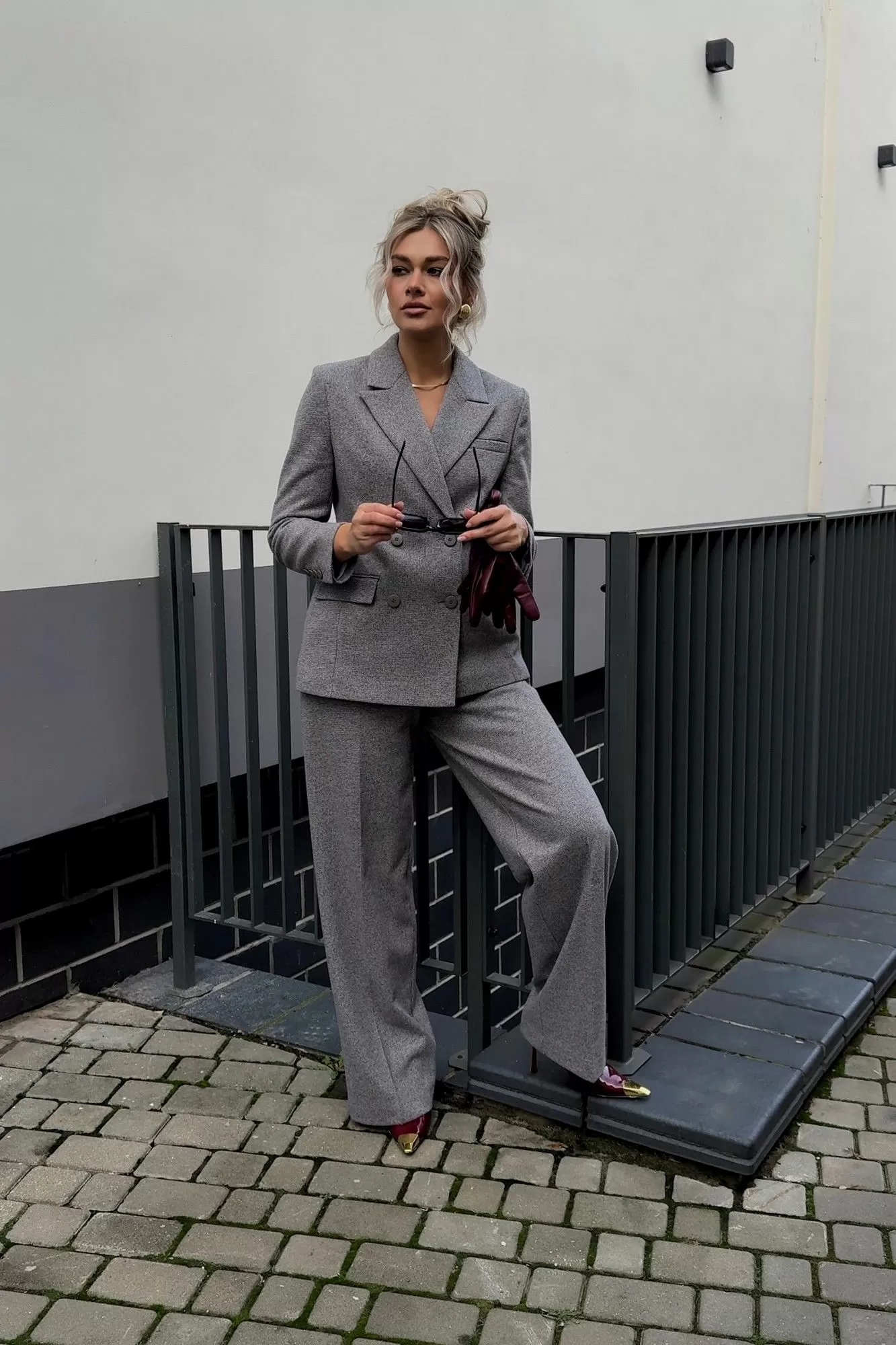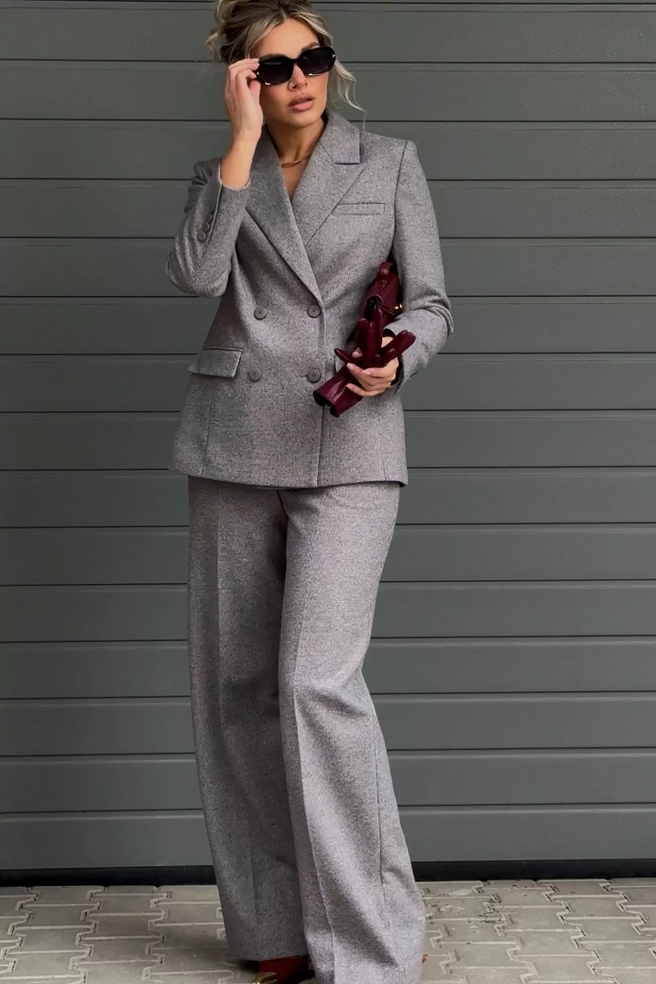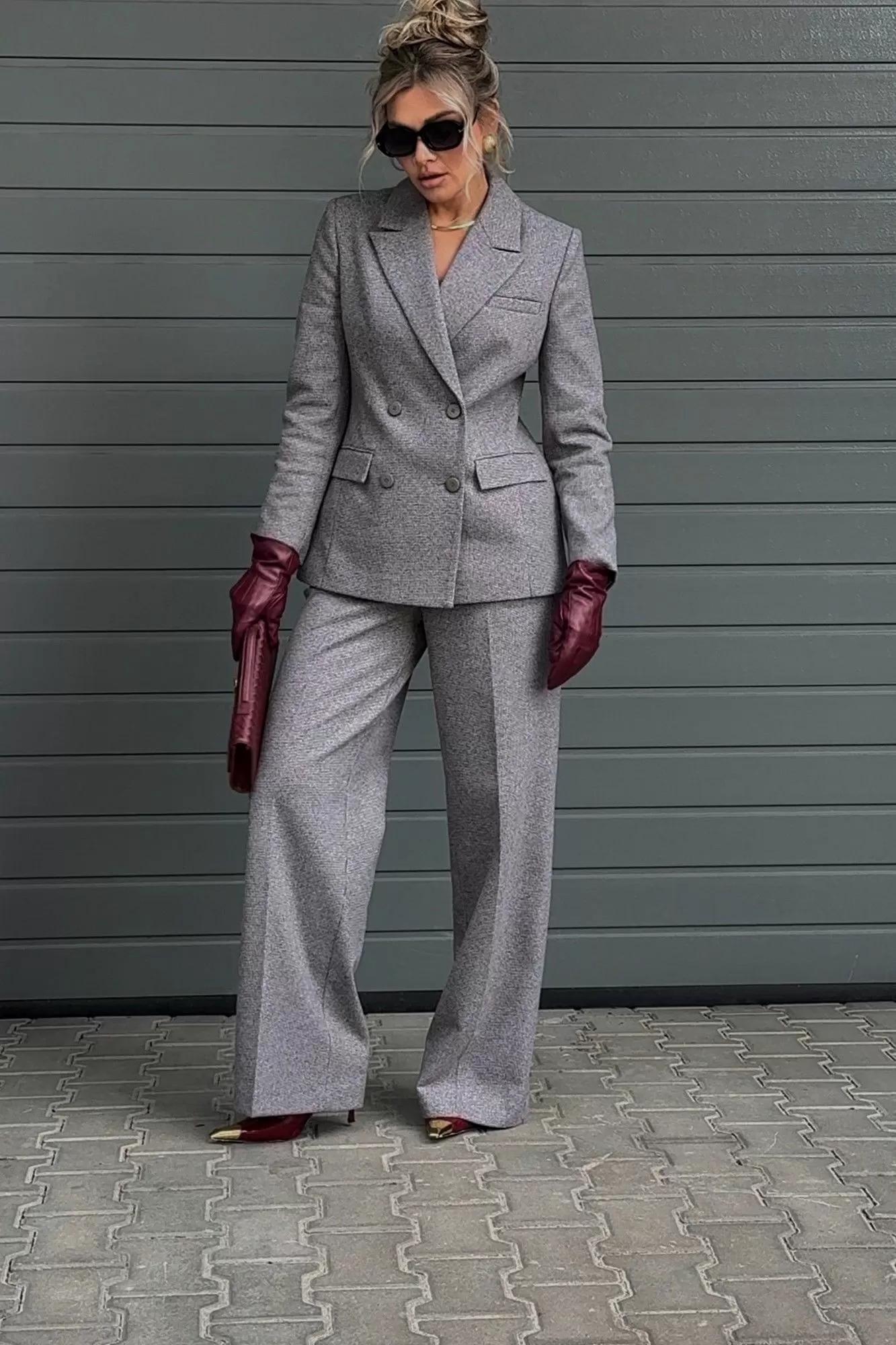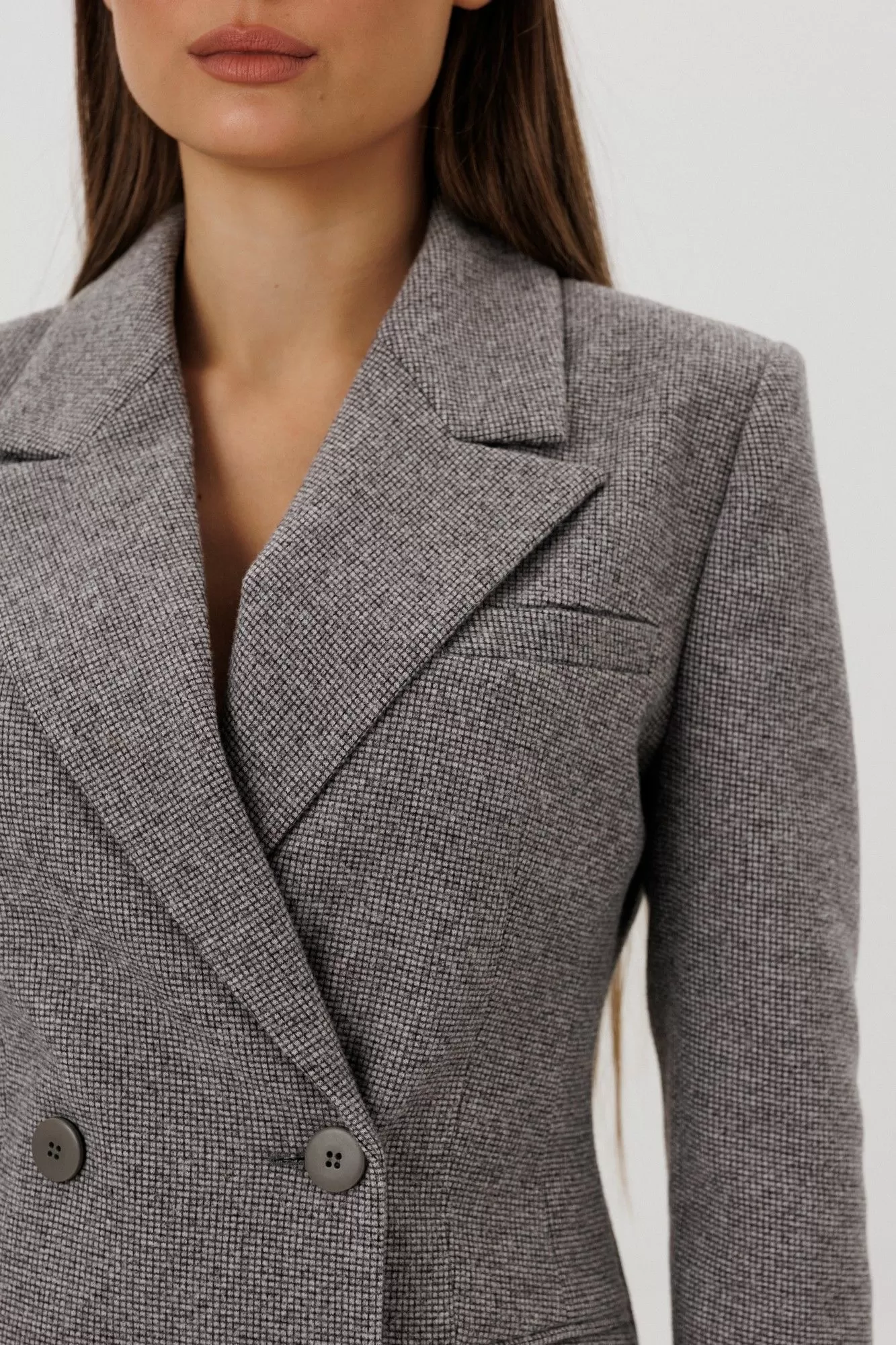 Жакет двубортный полуприлегающего силуэтта. Имеються функциональные карманы