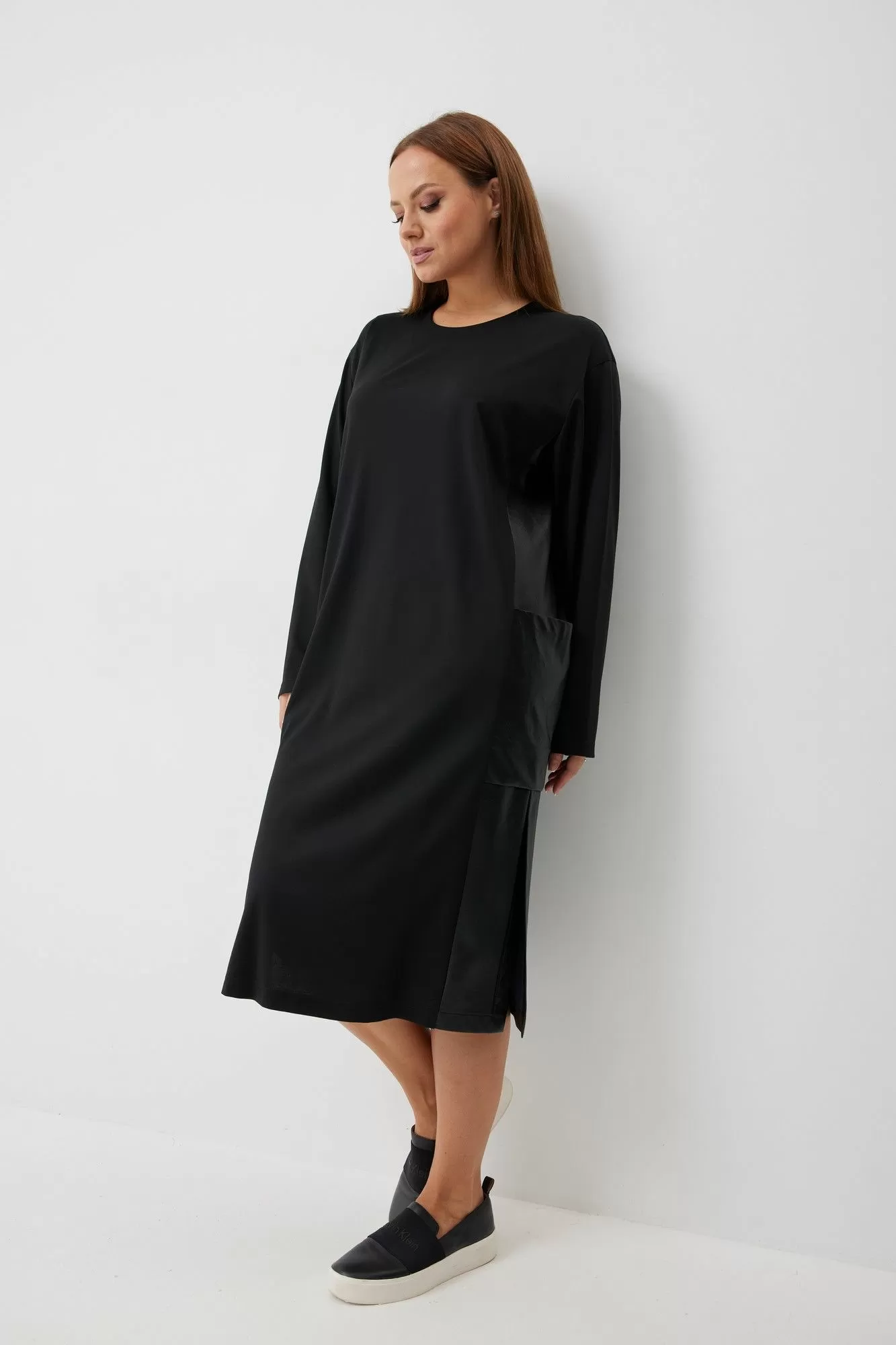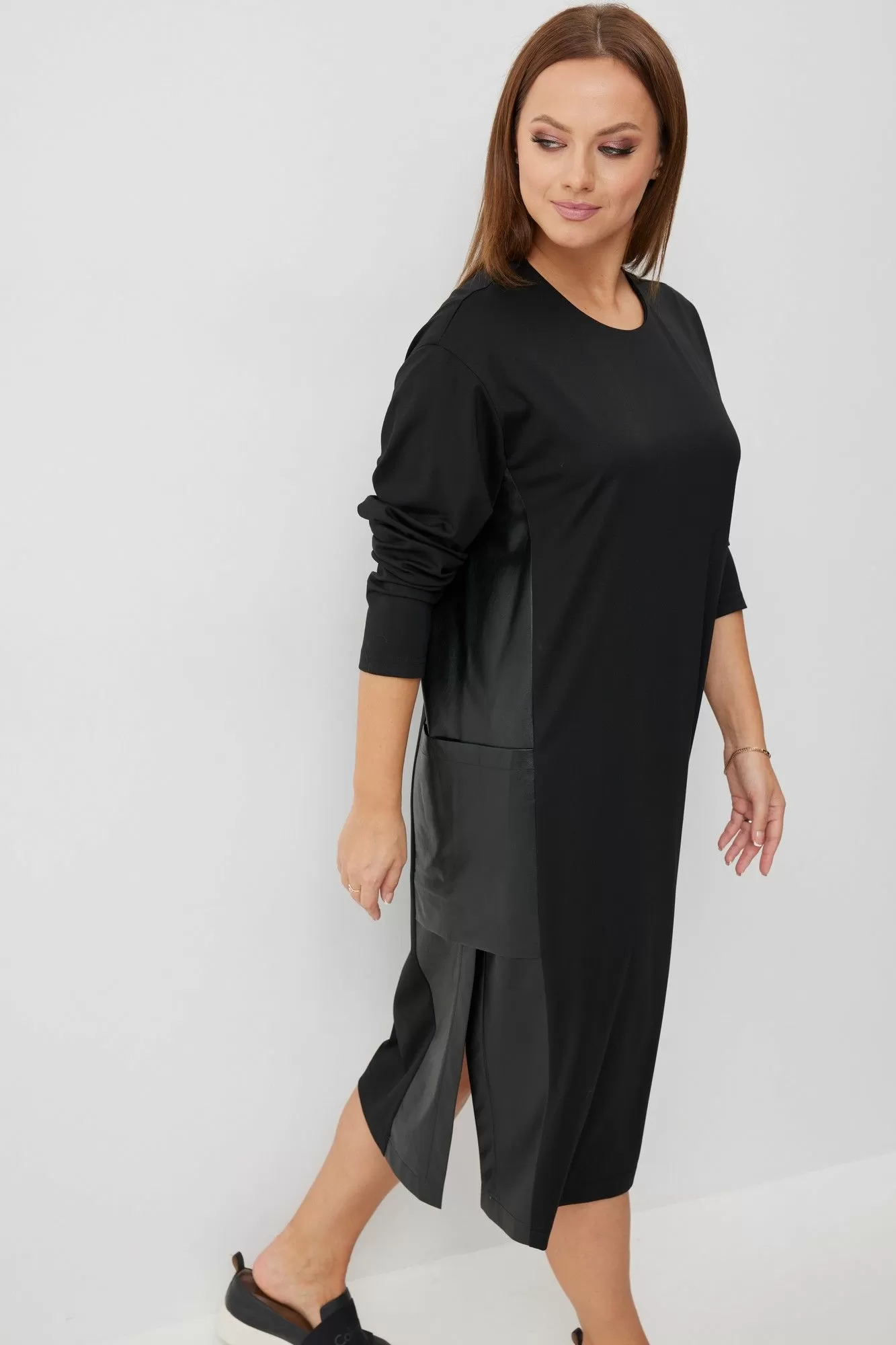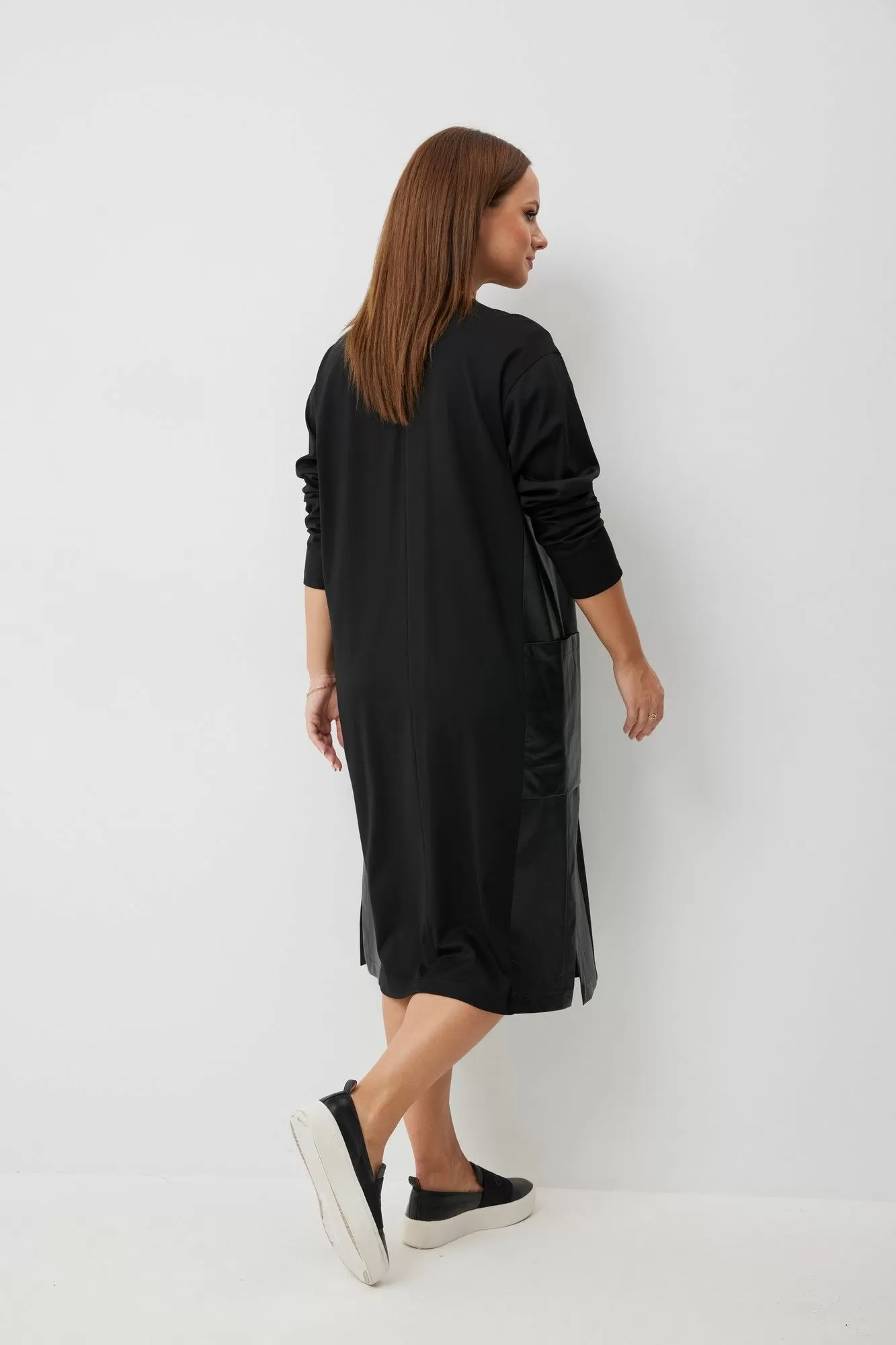 Платье из мягкого трикотажа сочетает в себе комфорт и практичность, а вставки из эко-кожи добавляют образу нотку элегантности. Удобный крой не сковывет движения, а вырезы по бокам подчеркивают женственность и добавляют легкости. Длина изделия -109 см