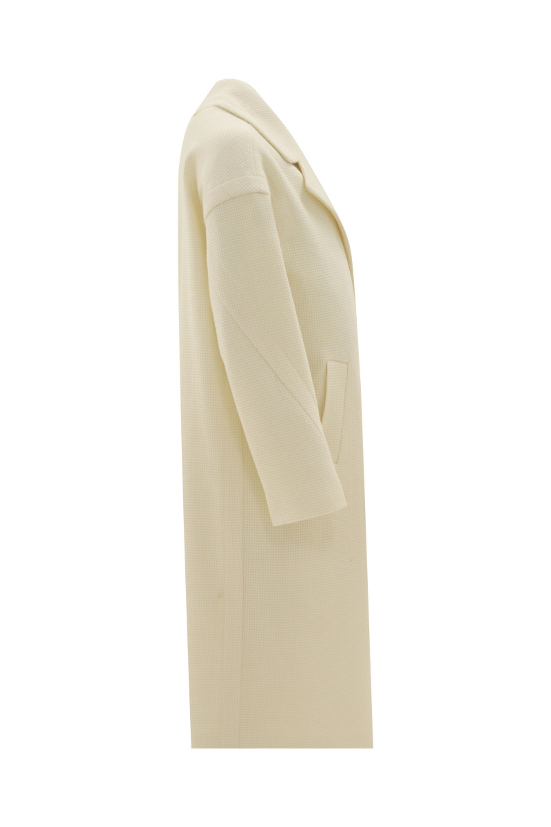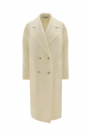 Пальто женское демисезонное, двубортное, прямого силуэта длиной ниже колена. Застежка на пуговицы и петли. Перед с функциональными карманами- листочка. Рукав длинный, двухшовный. Воротник и лацканы отложные. По воротнику, рукавам, лацканам и борту широкие отделочные строчки. Пальто на подкладке.