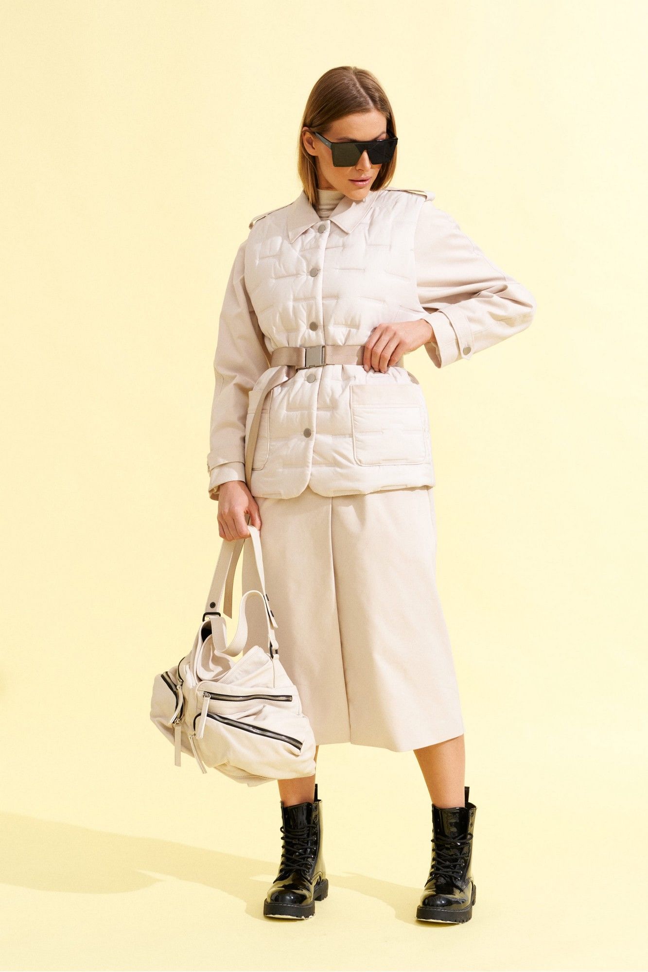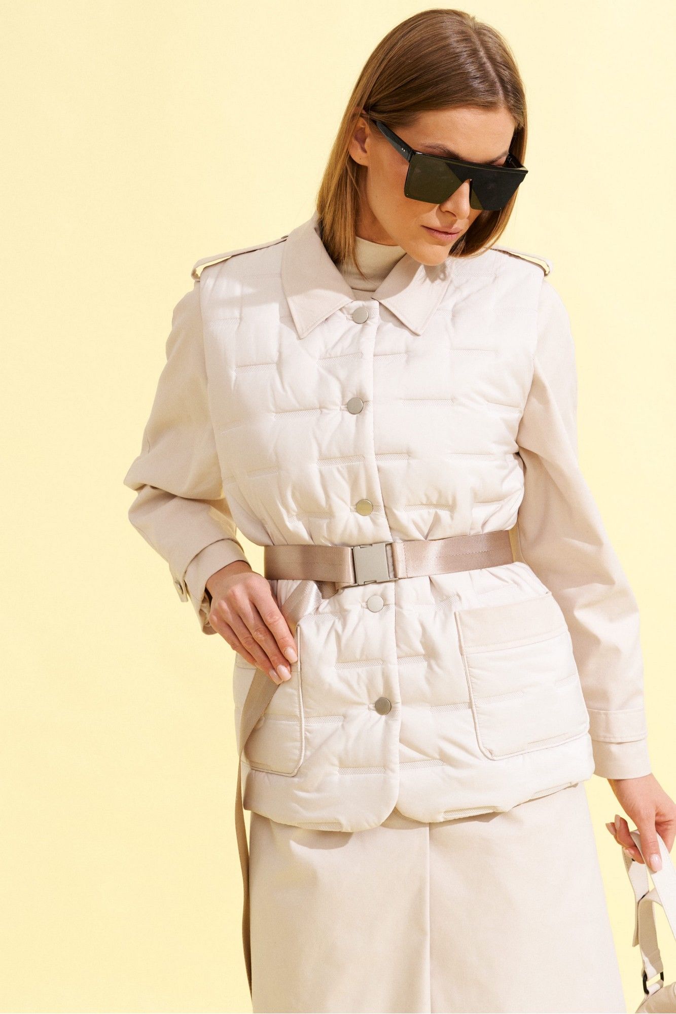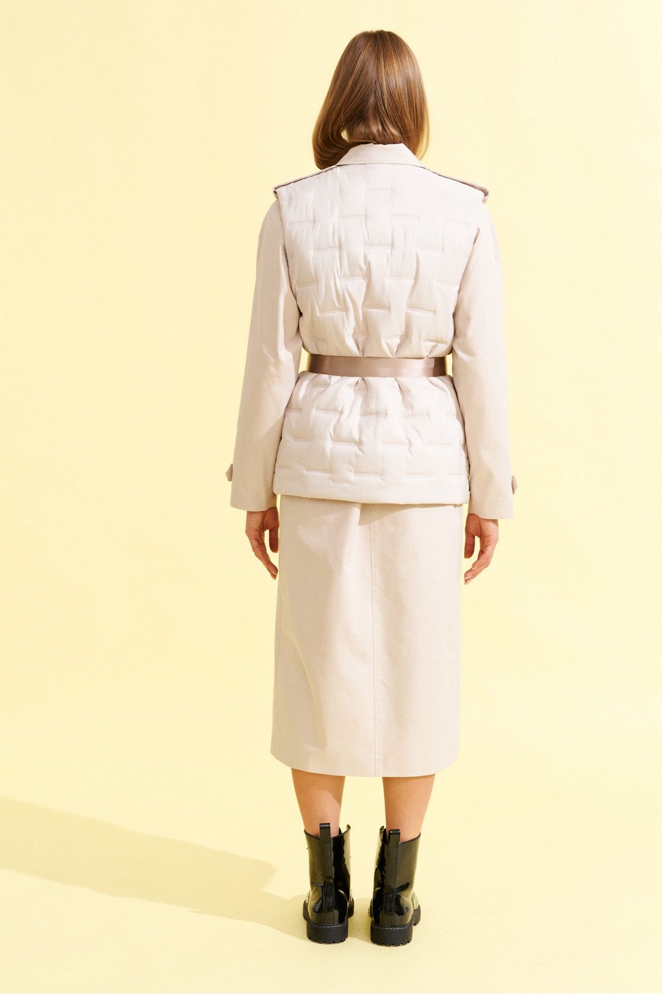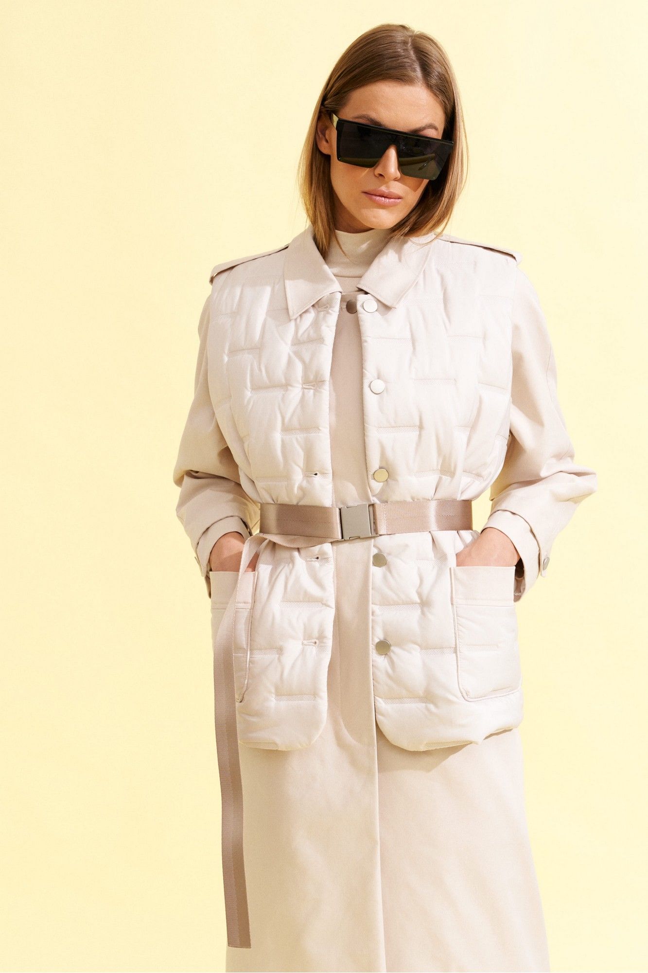 Плащ прямого силуэта, длинный, с рукавом реглан, центральной потайной застежкой на петли и пуговицы и сьемным поясом из ременной тесьмы с пряжкой, из хлопковой плотной ткани ,на подкладке. На полочках прорезные карманы с листочкой. Спинка со средним швом. Рукав реглан двухшовный с патами по плечам и в нижней части рукава. Воротник на стойке, отложной. К плащу пристегнут декоративный элемент - жилет со стеганной ткани с накладными карманами, круглым вырезом горловины и центральной бортовой застежкой на петли и пуговицы, длиной чуть ниже линии бедер.