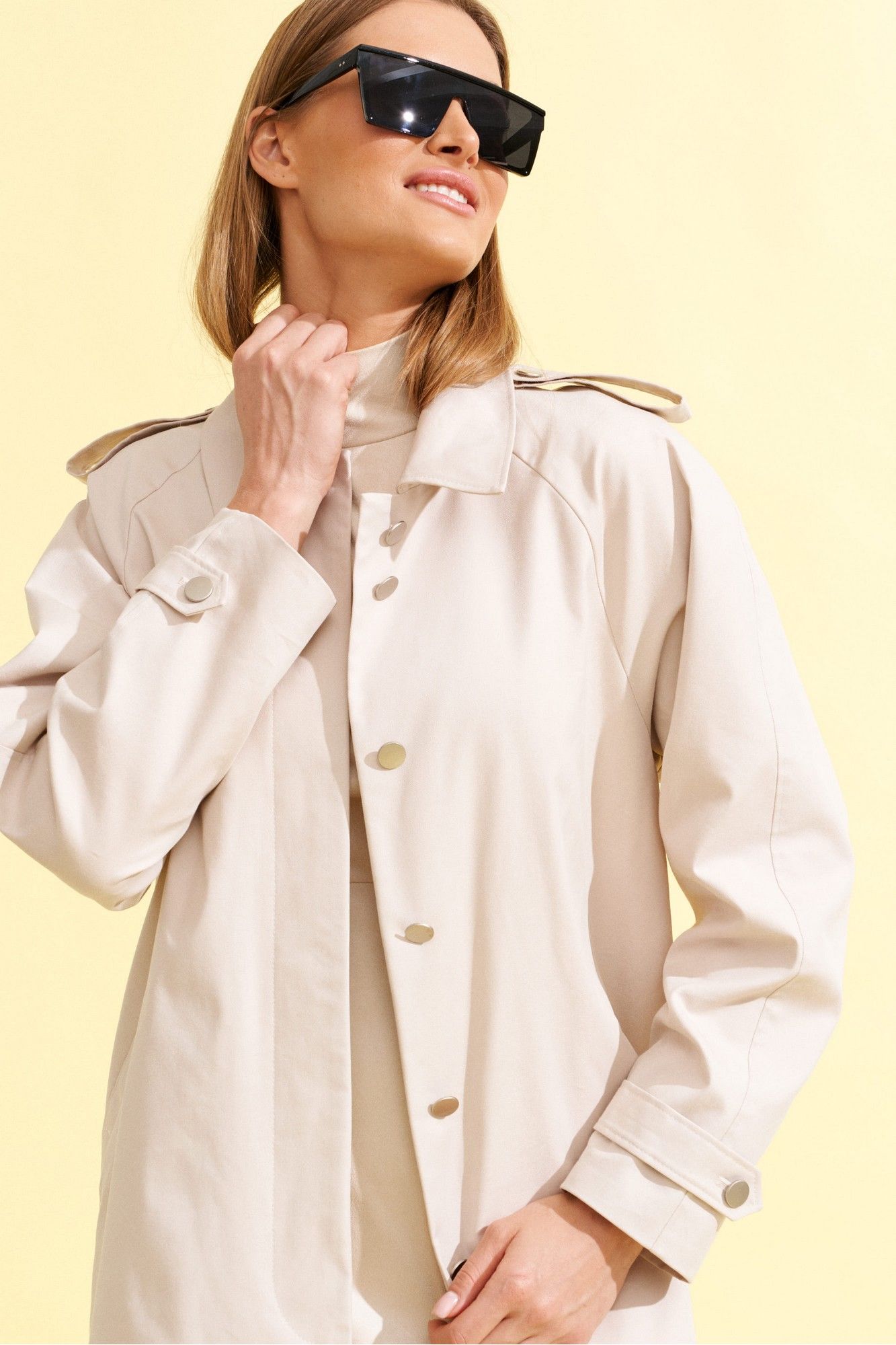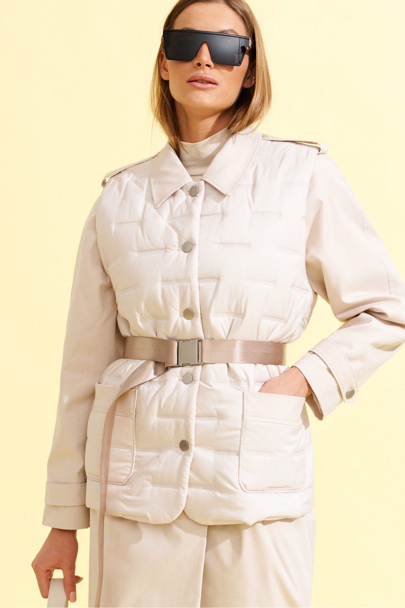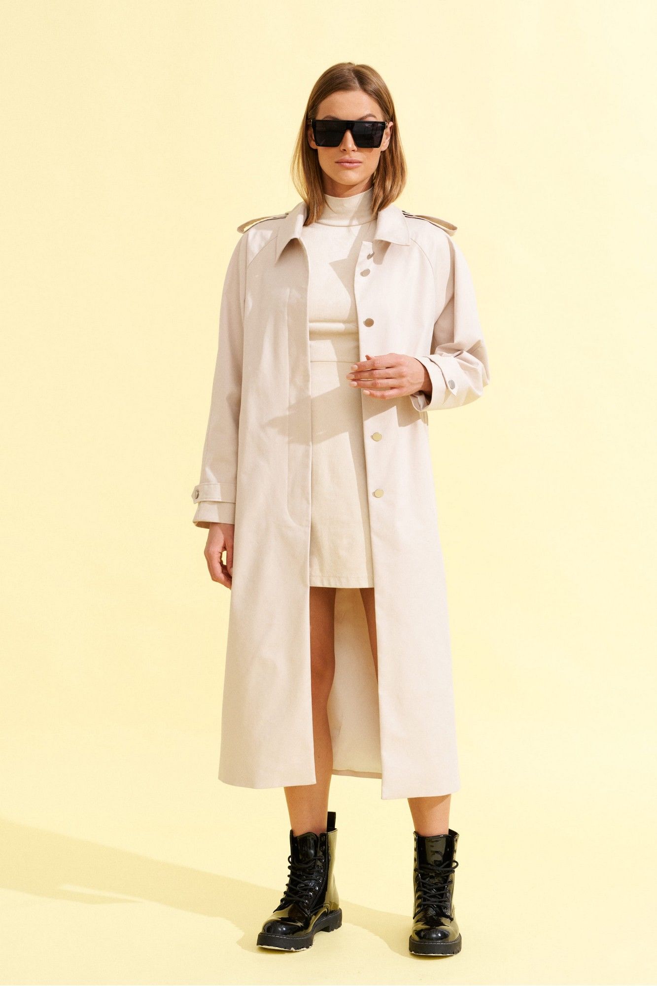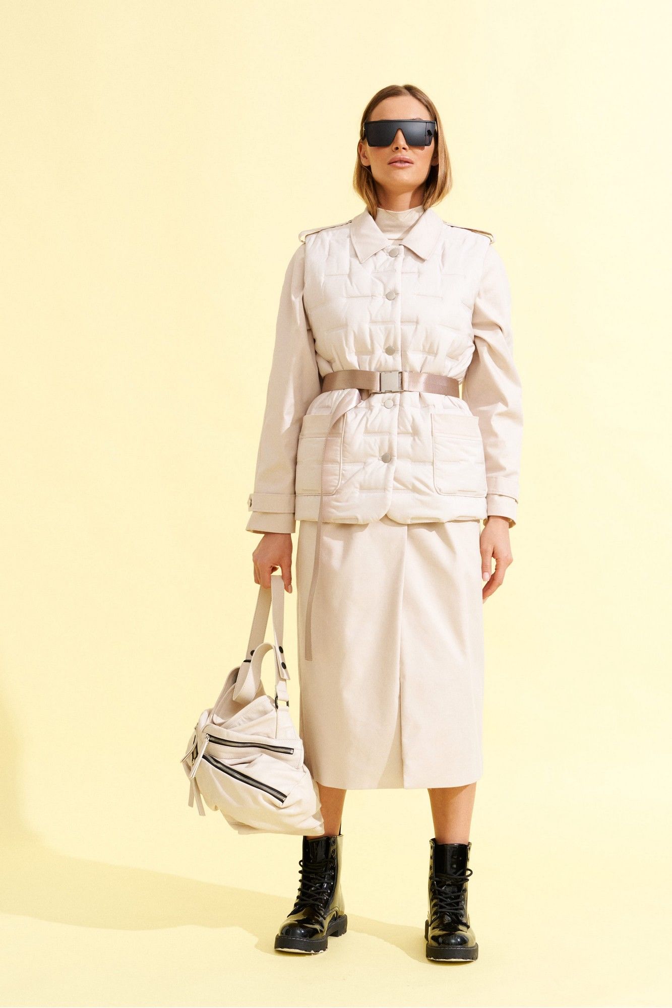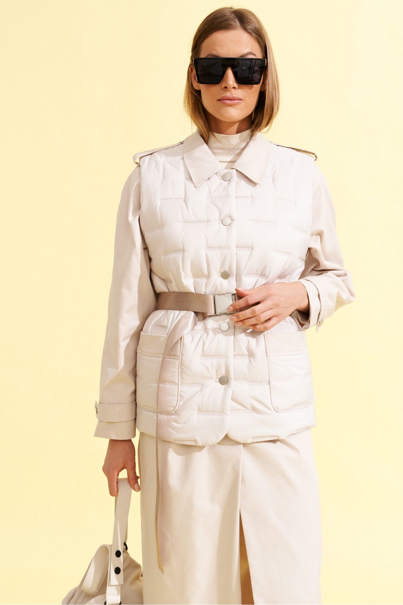 Плащ прямого силуэта, длинный, с рукавом реглан, центральной потайной застежкой на петли и пуговицы и сьемным поясом из ременной тесьмы с пряжкой, из хлопковой плотной ткани ,на подкладке. На полочках прорезные карманы с листочкой. Спинка со средним швом. Рукав реглан двухшовный с патами по плечам и в нижней части рукава. Воротник на стойке, отложной. К плащу пристегнут декоративный элемент - жилет со стеганной ткани с накладными карманами, круглым вырезом горловины и центральной бортовой застежкой на петли и пуговицы, длиной чуть ниже линии бедер.