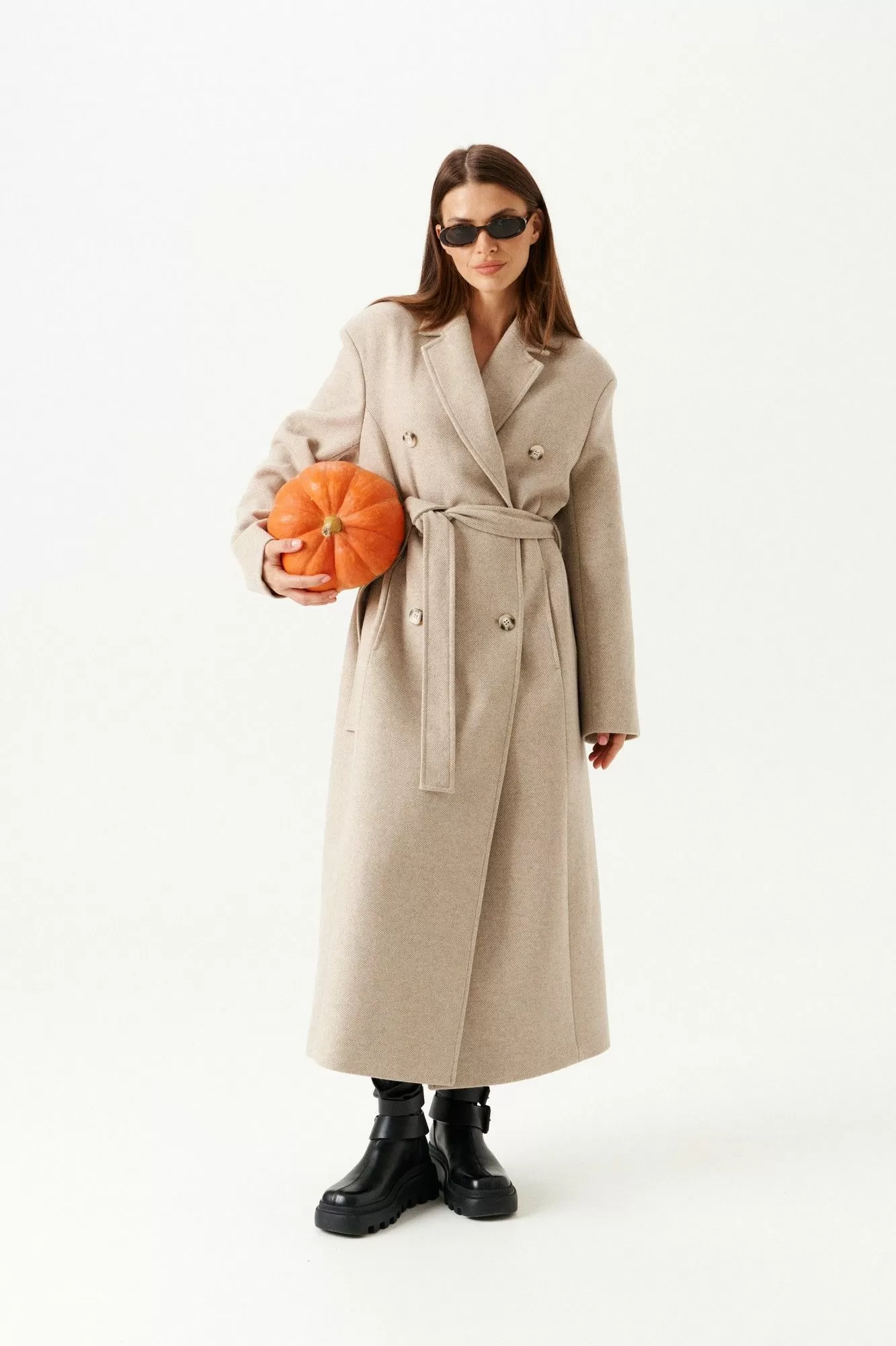Пальто из пальтовой ткани, прямого силуэта, свободное, со спущенной линией плеча, с центральной двубортной застежкой на петли и пуговицы, отложным воротником и лацканами пиджачного типа, на подкладке. Полочки с отрезными бочками и карманами в швах. Спинка со средним швом и шлицей, с отрезными бочками и плечевыми вытачками. Рукав втачной, длинный, двухшовный. В комплекте пояс из основной ткани.