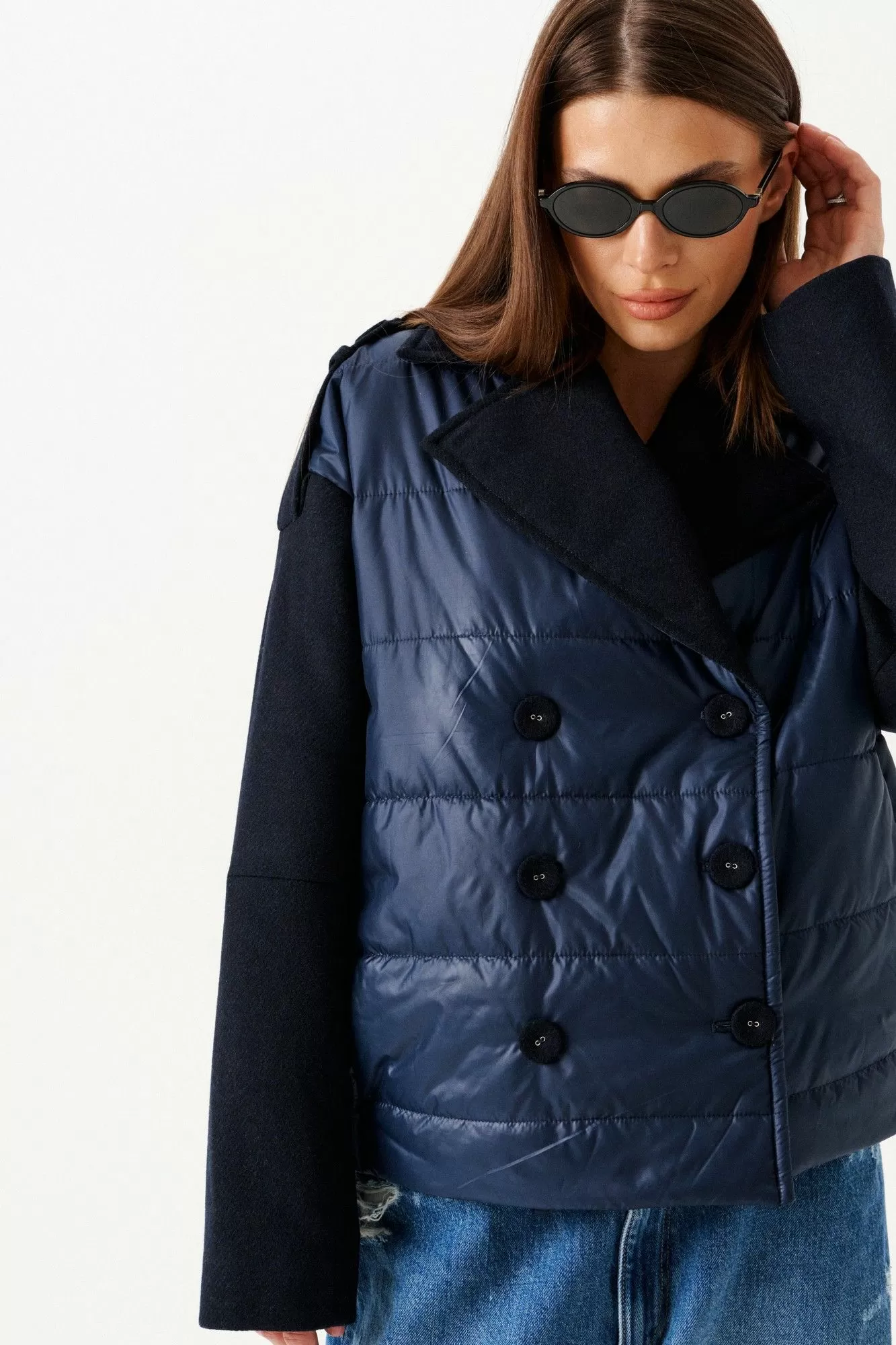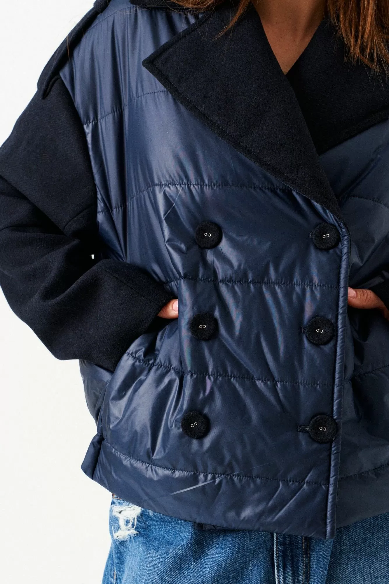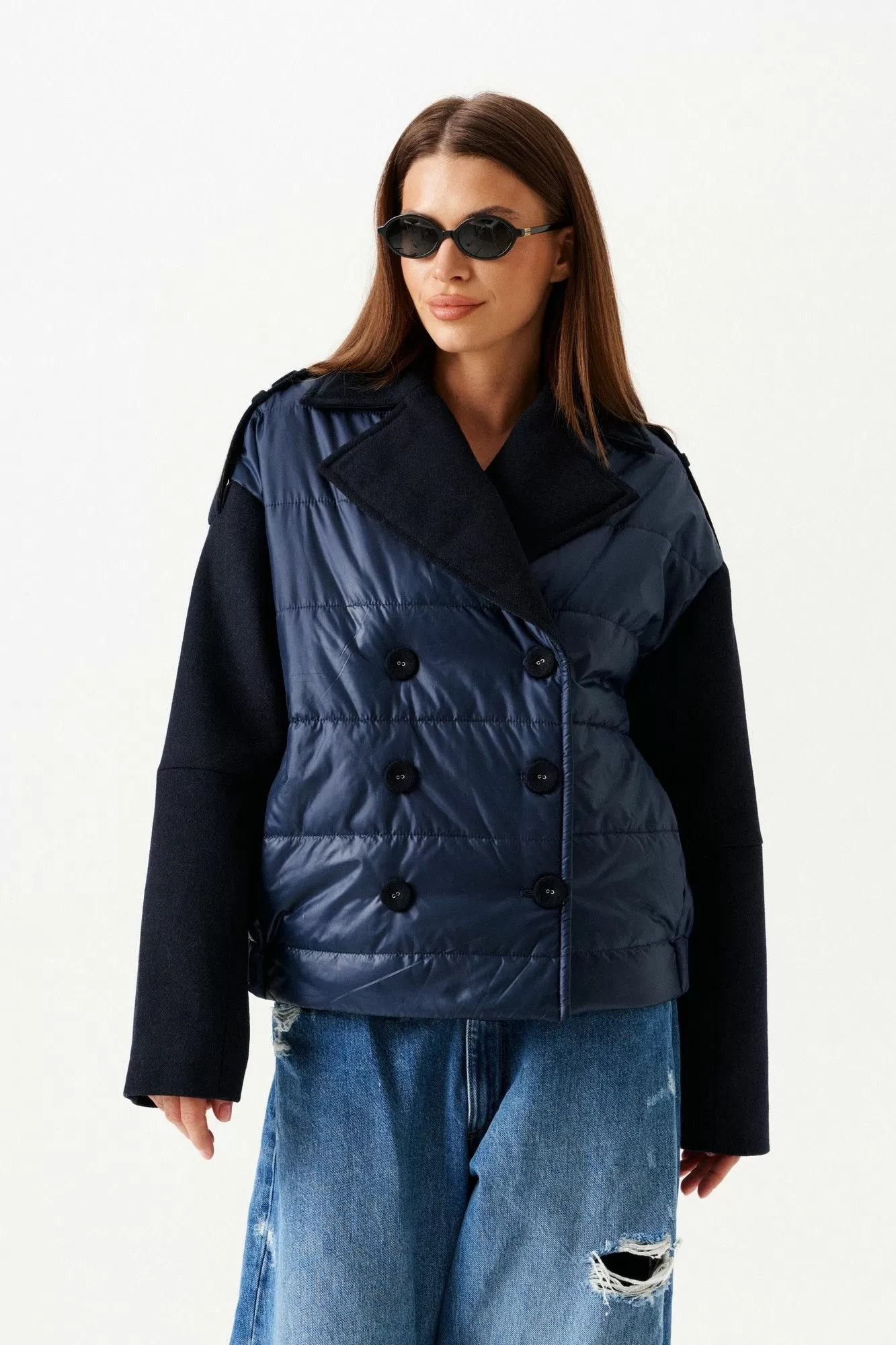 Куртка из различных материлов, прямого силуэта, со спущенной линией плеча, с центральной двубортной застежкой на петли и пуговицы, отложным воротником и лацканами пиджачного типа, на подкладке.В рельефах полочек расположены карманы. Низ спинки обработан притачным поясом на резинке. На верхней части рукава притачной погон с застежкой на прорезную петлю и пуговицу. Рукав двухшовный, длинный. Полочки и спинка из плащевой стеганной ткани с утеплителем изософт150г/м2. Воротник,лацканы, рукава, погоны из пальтовой ткани.