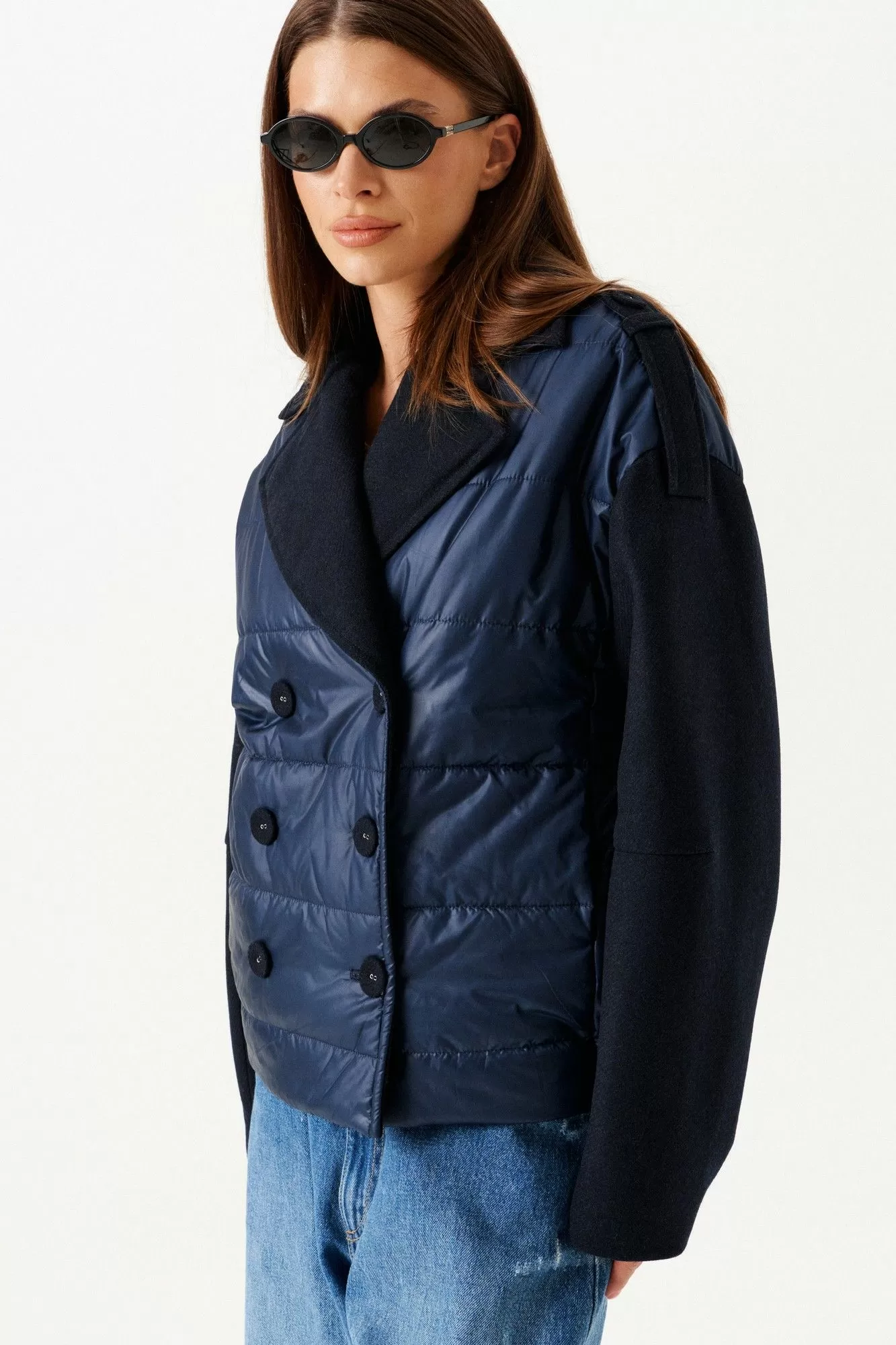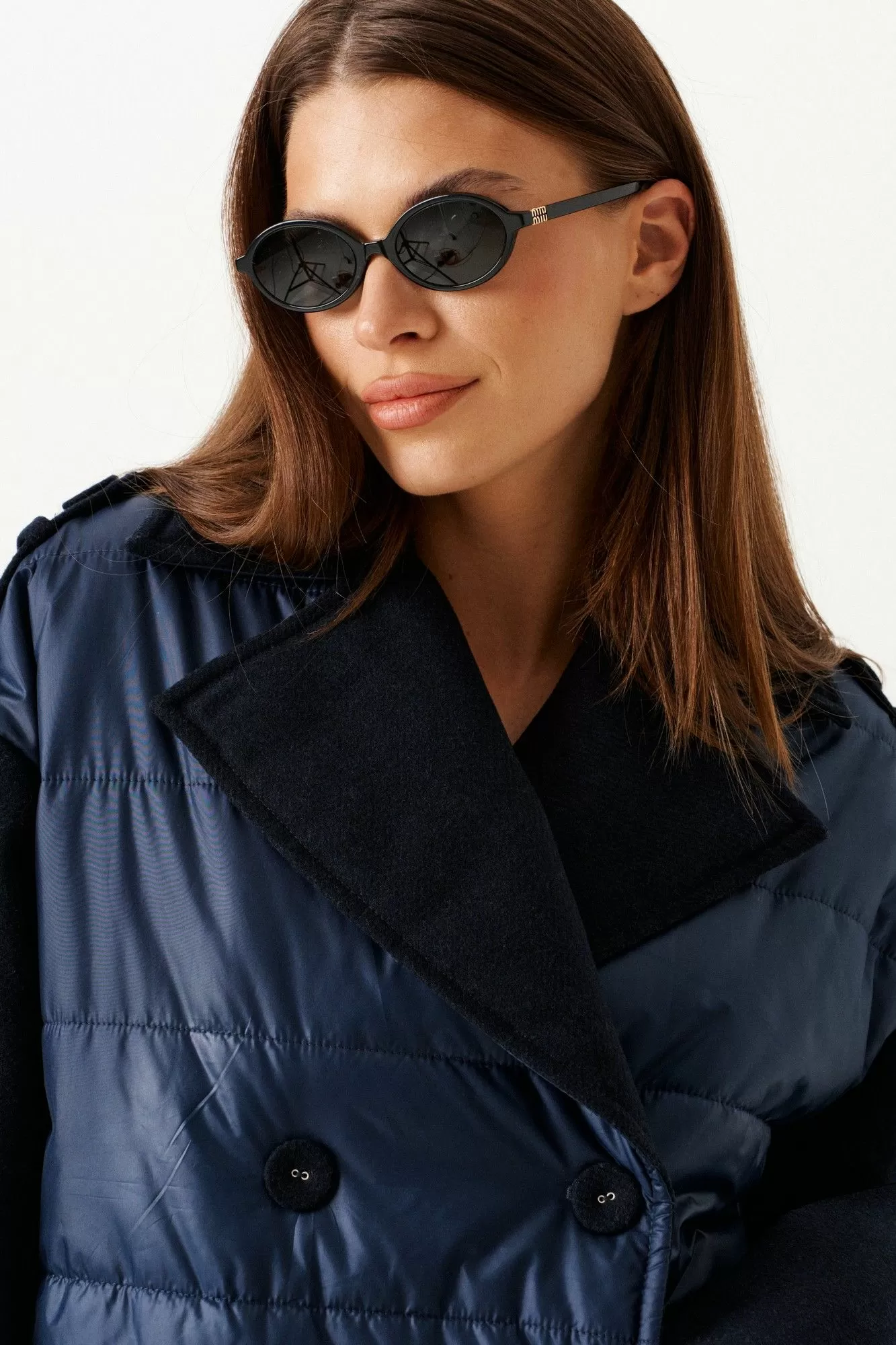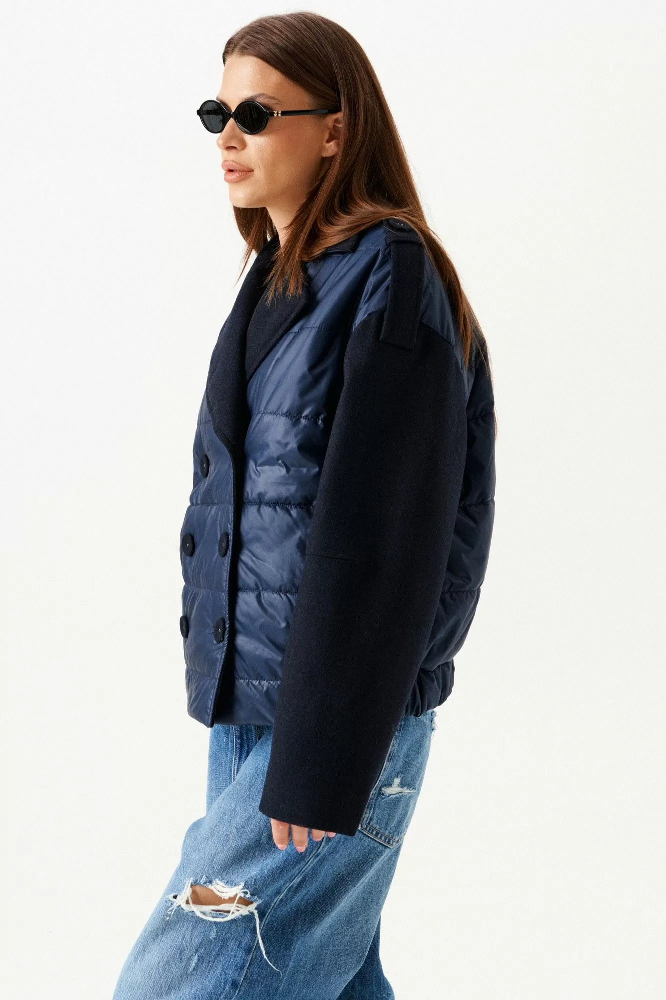 Куртка из различных материлов, прямого силуэта, со спущенной линией плеча, с центральной двубортной застежкой на петли и пуговицы, отложным воротником и лацканами пиджачного типа, на подкладке.В рельефах полочек расположены карманы. Низ спинки обработан притачным поясом на резинке. На верхней части рукава притачной погон с застежкой на прорезную петлю и пуговицу. Рукав двухшовный, длинный. Полочки и спинка из плащевой стеганной ткани с утеплителем изософт150г/м2. Воротник,лацканы, рукава, погоны из пальтовой ткани.