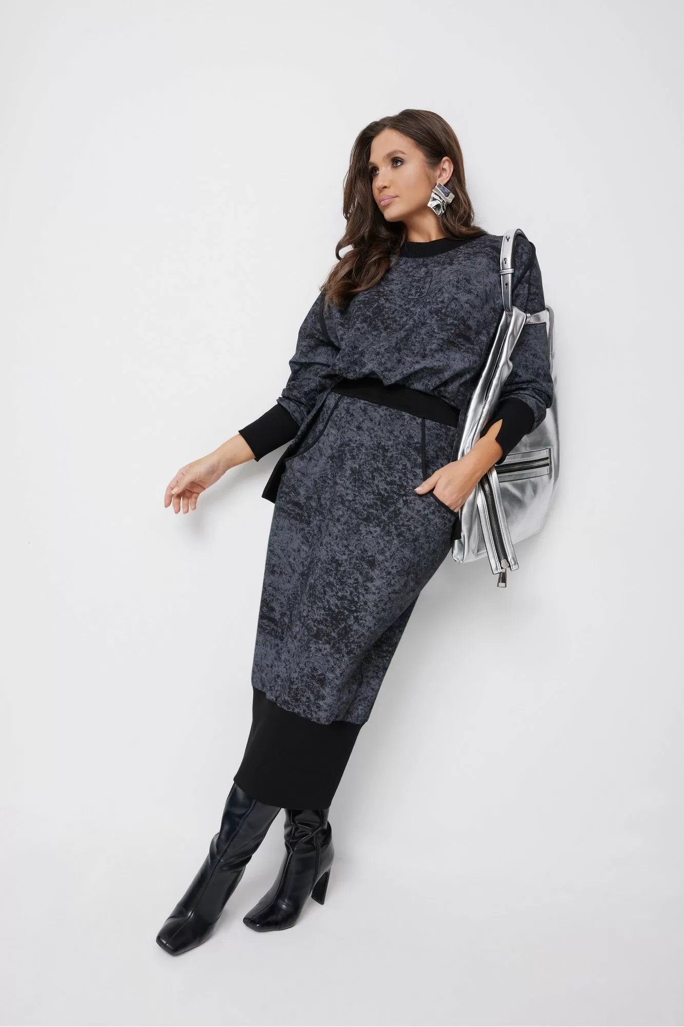 Комплект женский, состоящий из юбки и джемпера. Джемпер прямого силуэта, по переду вытачки, рельефы и разрезы в них. Горловина круглой формы с притачной планкой, рукав покроя реглан заканчивающейся манжетой с разрезом. По низу переда и спинки притачные планки. Низ разноуровневый. По переду джемпера декор с фирменным логотипом. Юбка прямого силуэта. Заднее полотнище с подрезом, переднее с боковыми объемными карманами. Пояс притачной с резинкой по кругу, по низу притачная планка с разрезом на заднем полотнище. В швах проймы переда, спинки и подреза заднего полотнища юбки, так же в карманах планки с открытыми срезами.