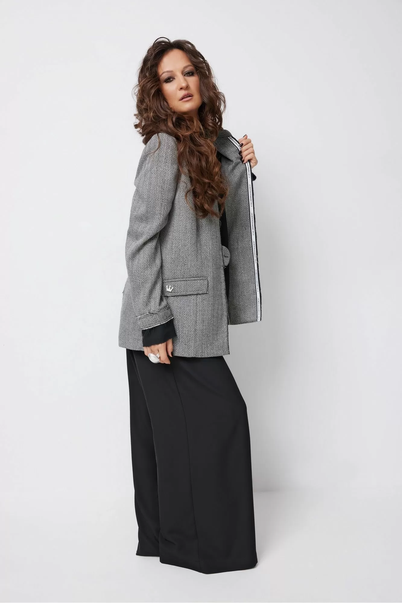Комплект женский, состоящий из блузы, брюк и жакета. Блуза прямого силуэта с круглым вырезом, рукав втачной одношовный короткий. Перед спинки и рукав двойные с разноуровневым низом и открытым срезом. Жакет полуприлегающего силуэта, воротник стойка с центральной бортовой застежкой и навесной петлей и пуговицей, рукав втачной двушовный длинный, заканчивающийся притачной манжетой и декоративным элементом ввиде манжеты из отделочной ткани. Перед с вертикальными рельефами и карманами "в рамку" с клапаном. Спинка со средним швом и высоким вырезом. В жакете применяются швы с открытым срезом. В комплекте нарядная съемная брошь. Брюки прямого силуэта на притачном поясе с резинкой по задней части и бокам. Перед с имитацией гульфика и боковыми карманами.