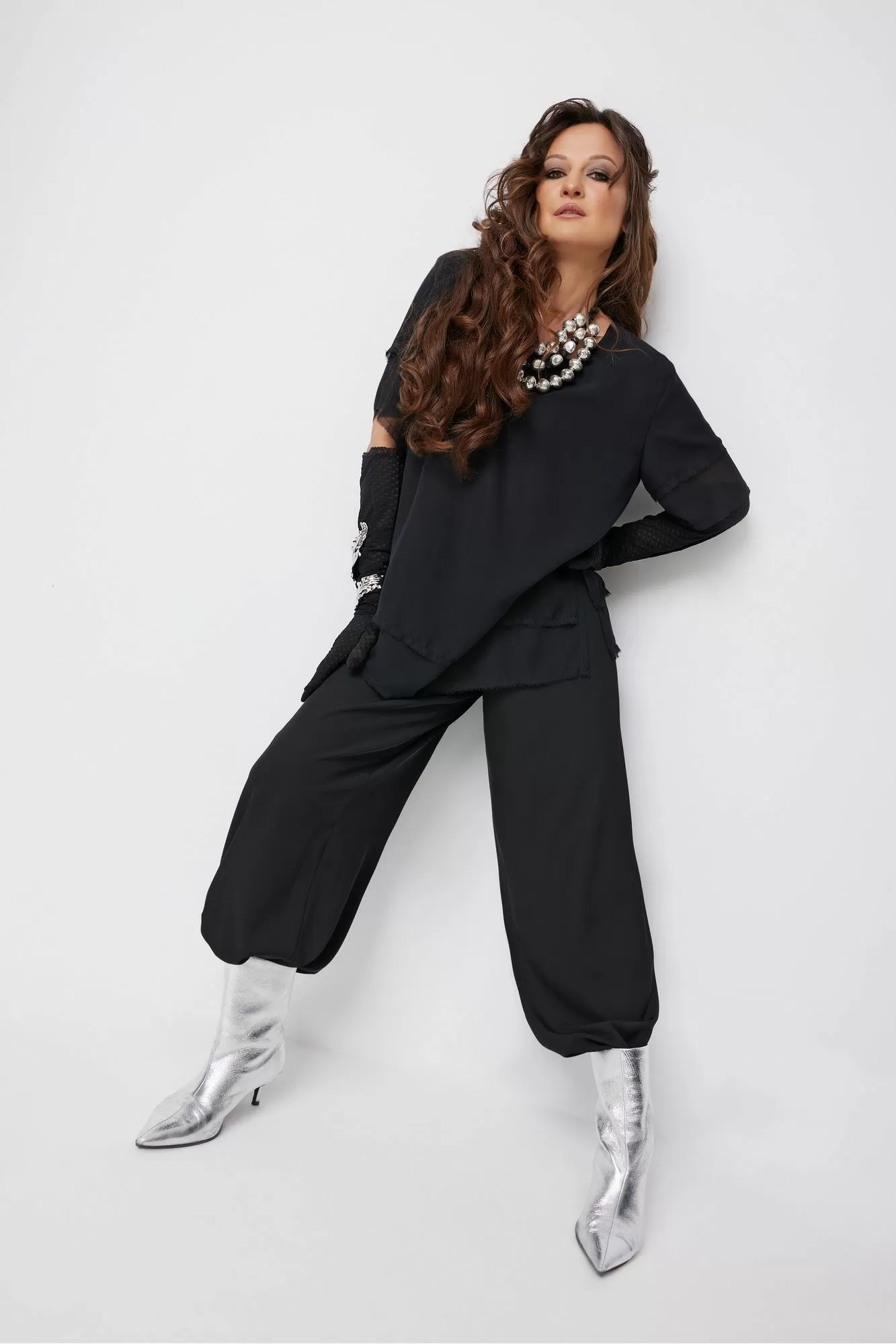 Размер 44 : Жакет : ОГ-96,ОТ-92, ОБ-104, длина изделия спинки без воротника-71, ширина плеча-10,5. ширина рукава на уровне ОП-17, длина рукава втачного с манжетой-65, ширина рукава на уровне низа-12,5. Блуза : ОГ-106,ОТ-108,ширина изделия по линии низа-56,ширина изделия спинки-41, длина изделия спинки-65,длина рукава втачного-24. Брюки : ОТ в собр-66, ОТ в раст-88, ОБ-104, ширина изделия по низу-34, длина изделия по боковому шву с поясом-111.