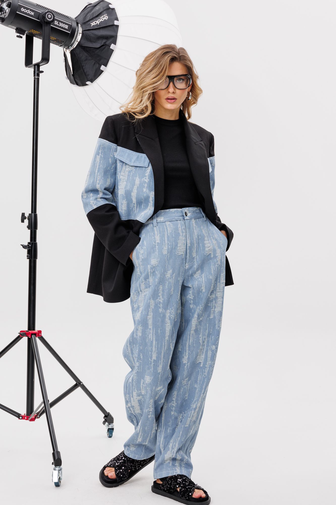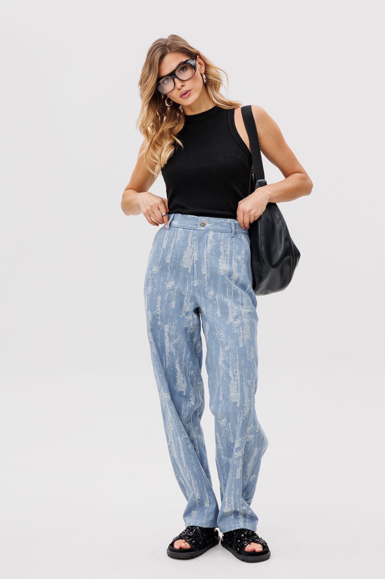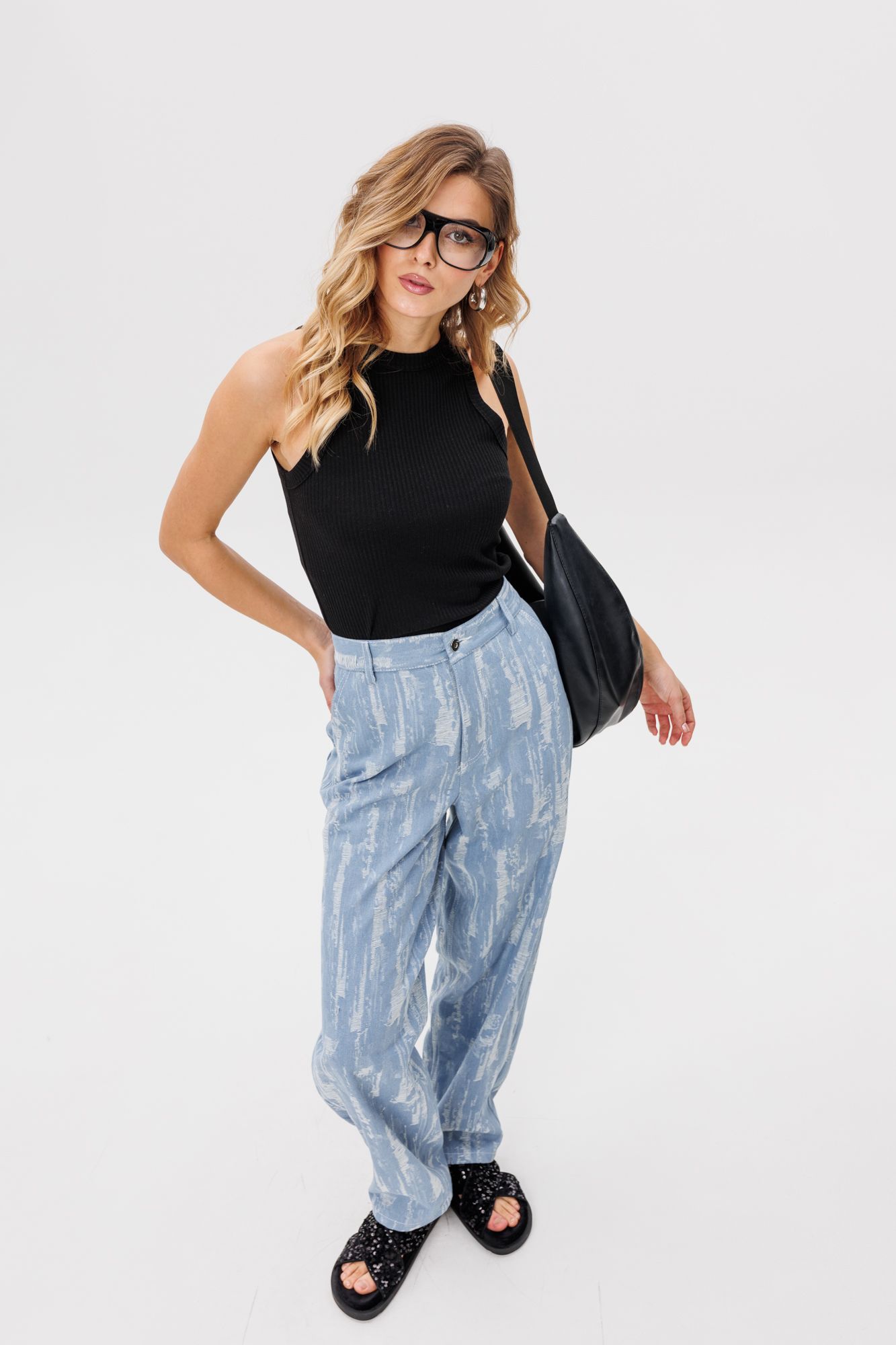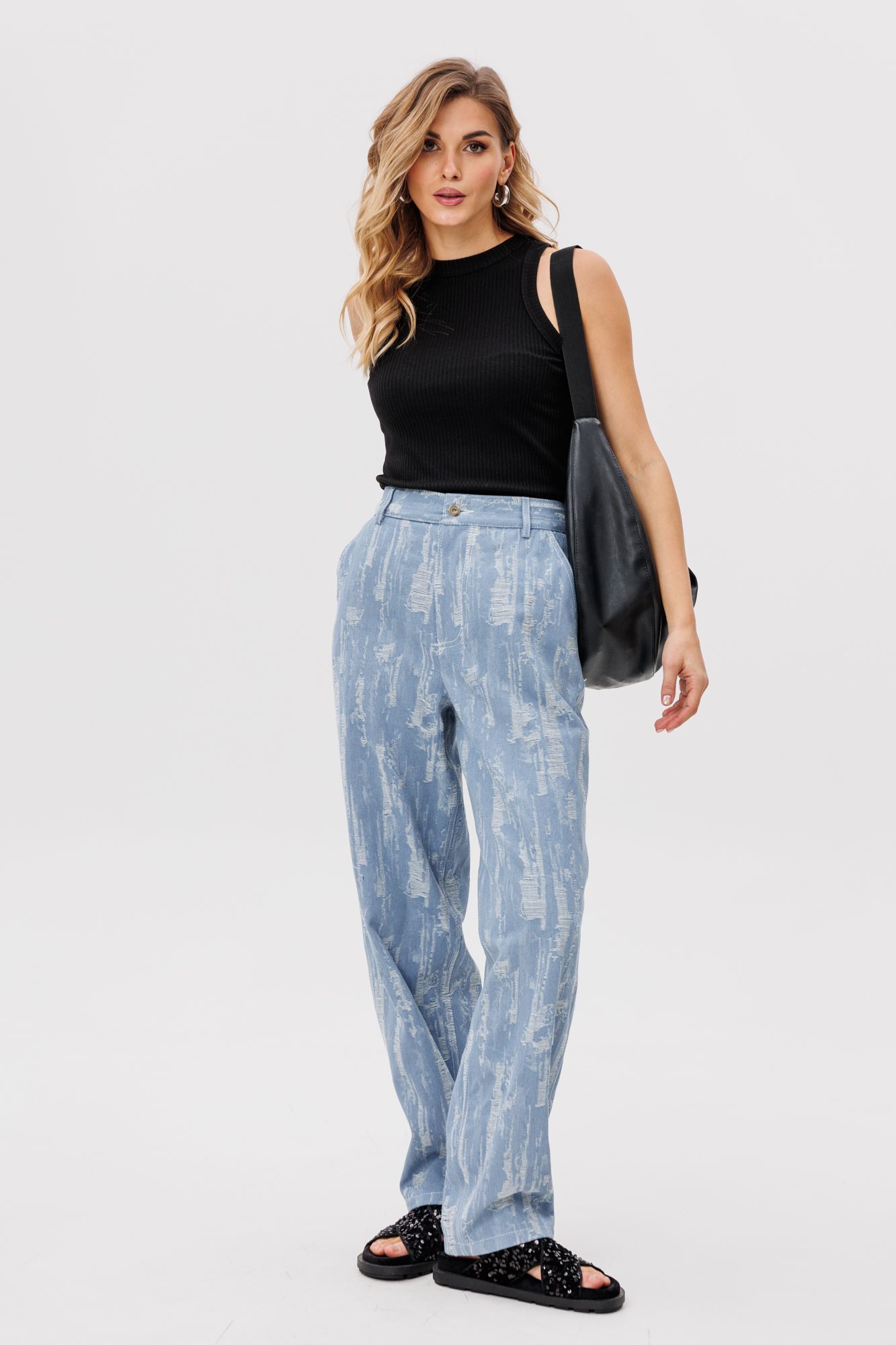 Брюки выполнены из джинса. Брюки свободного покроя на притачном поясе. Спереди боковые карманы с фигурным входом и застежка на молнию. На задних частях кокетки и накладные карманы. Пояс застегивается на одну пуговицу. Длина брюк: р. 44-48 - 107 см, р. 50-54 - 108,5 см. 44 46 48 50 52 54 Длина сбоку с поясом 107 107 107 108,5 108,5 108,5 Объем по талии 72 76 80 84 88 92 Объем по бедрам 104 108 112 116 120 124 Ширина пояса 4,5 4,5 4,5 4,5 4,5 4,5