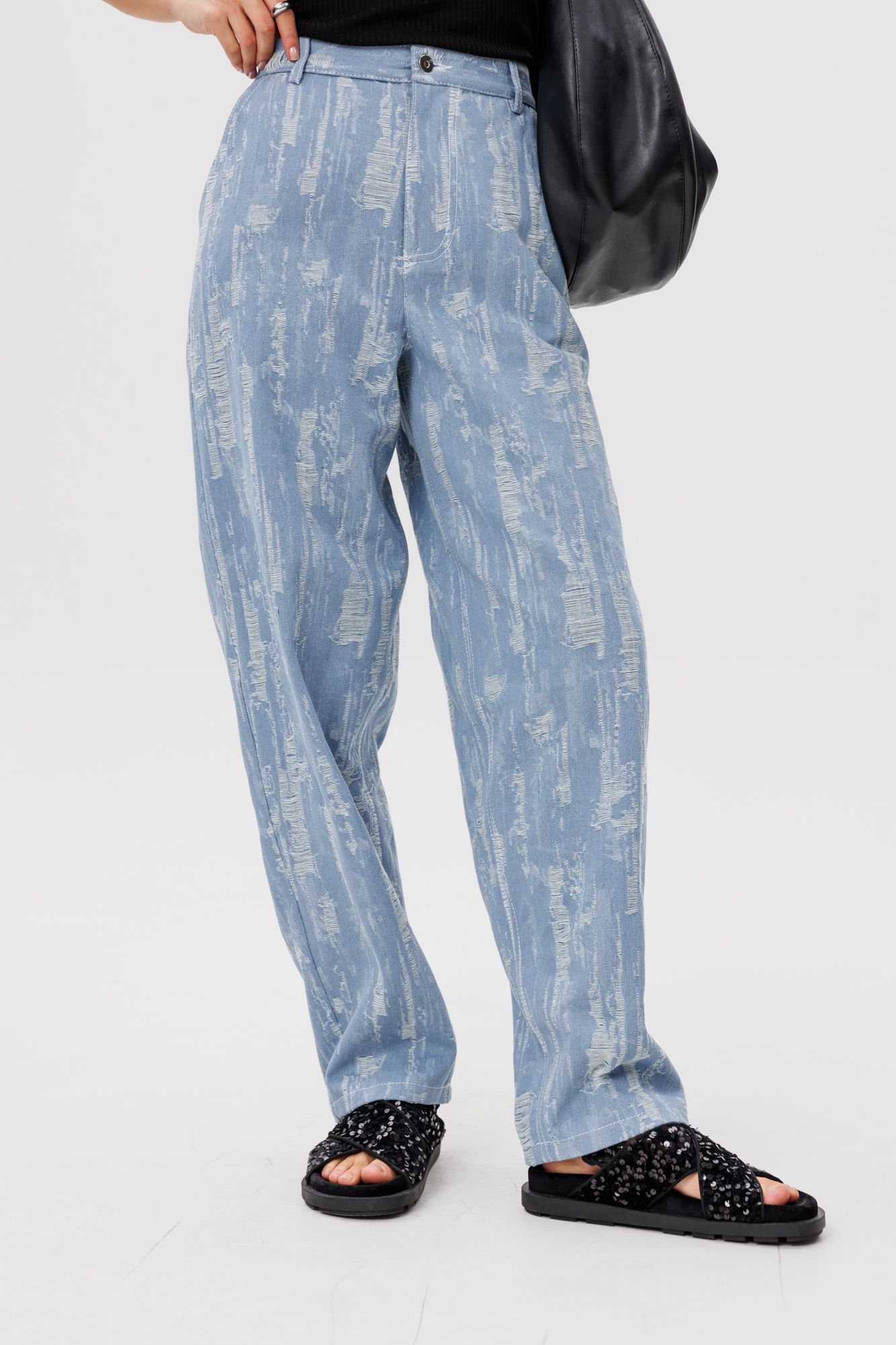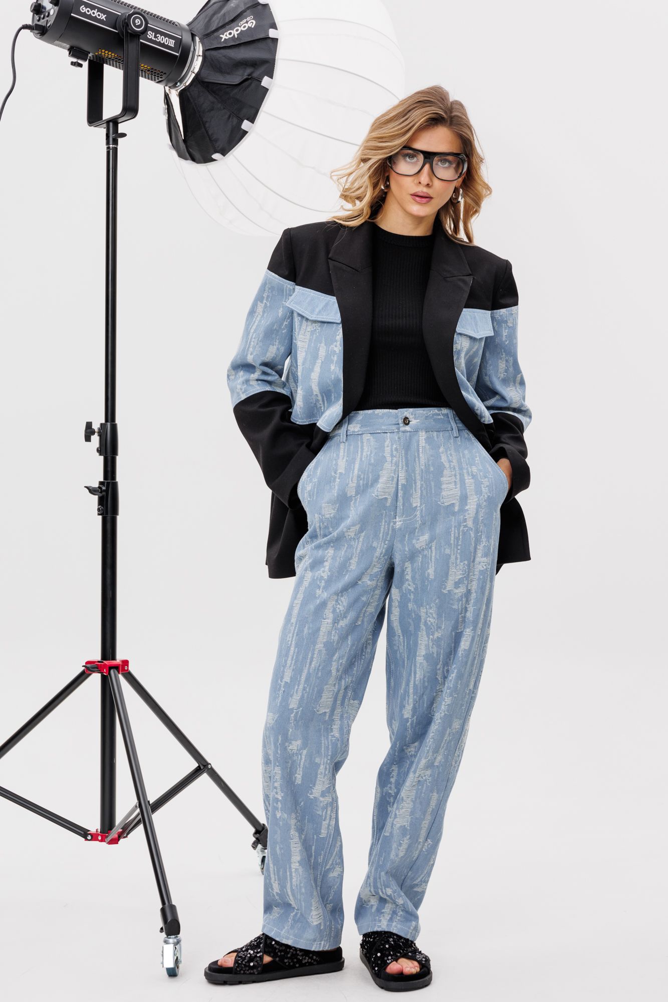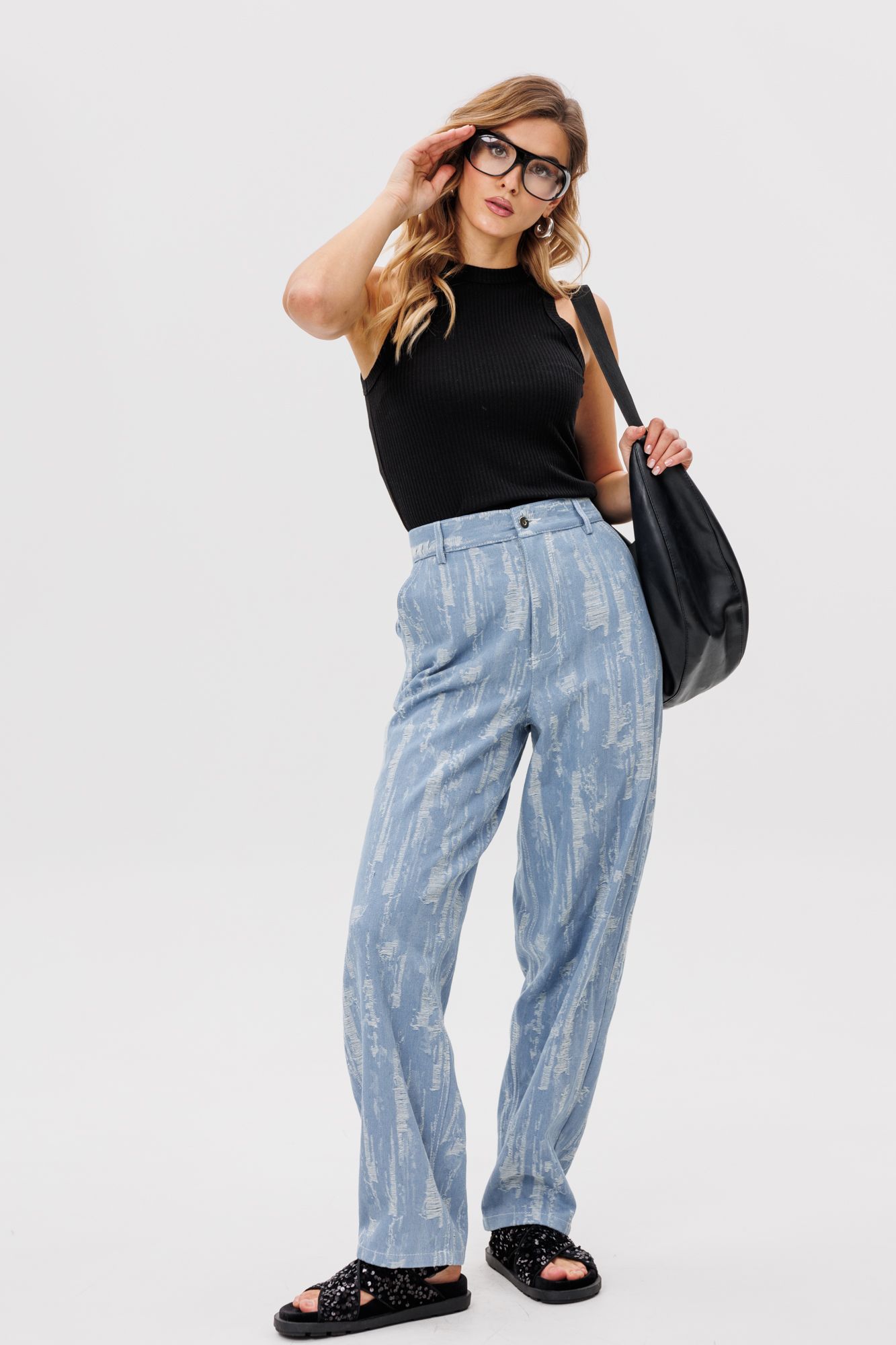 Брюки выполнены из джинса. Брюки свободного покроя на притачном поясе. Спереди боковые карманы с фигурным входом и застежка на молнию. На задних частях кокетки и накладные карманы. Пояс застегивается на одну пуговицу. Длина брюк: р. 44-48 - 107 см, р. 50-54 - 108,5 см. 44 46 48 50 52 54 Длина сбоку с поясом 107 107 107 108,5 108,5 108,5 Объем по талии 72 76 80 84 88 92 Объем по бедрам 104 108 112 116 120 124 Ширина пояса 4,5 4,5 4,5 4,5 4,5 4,5