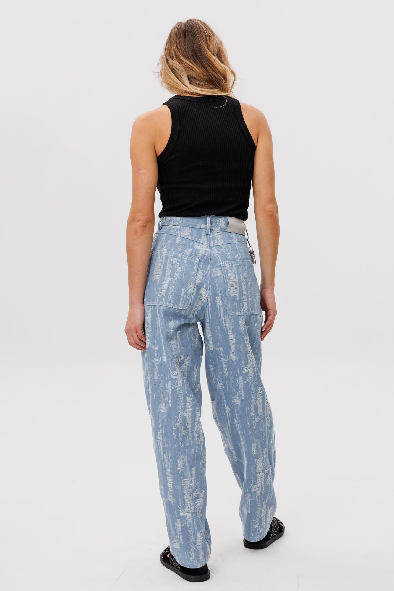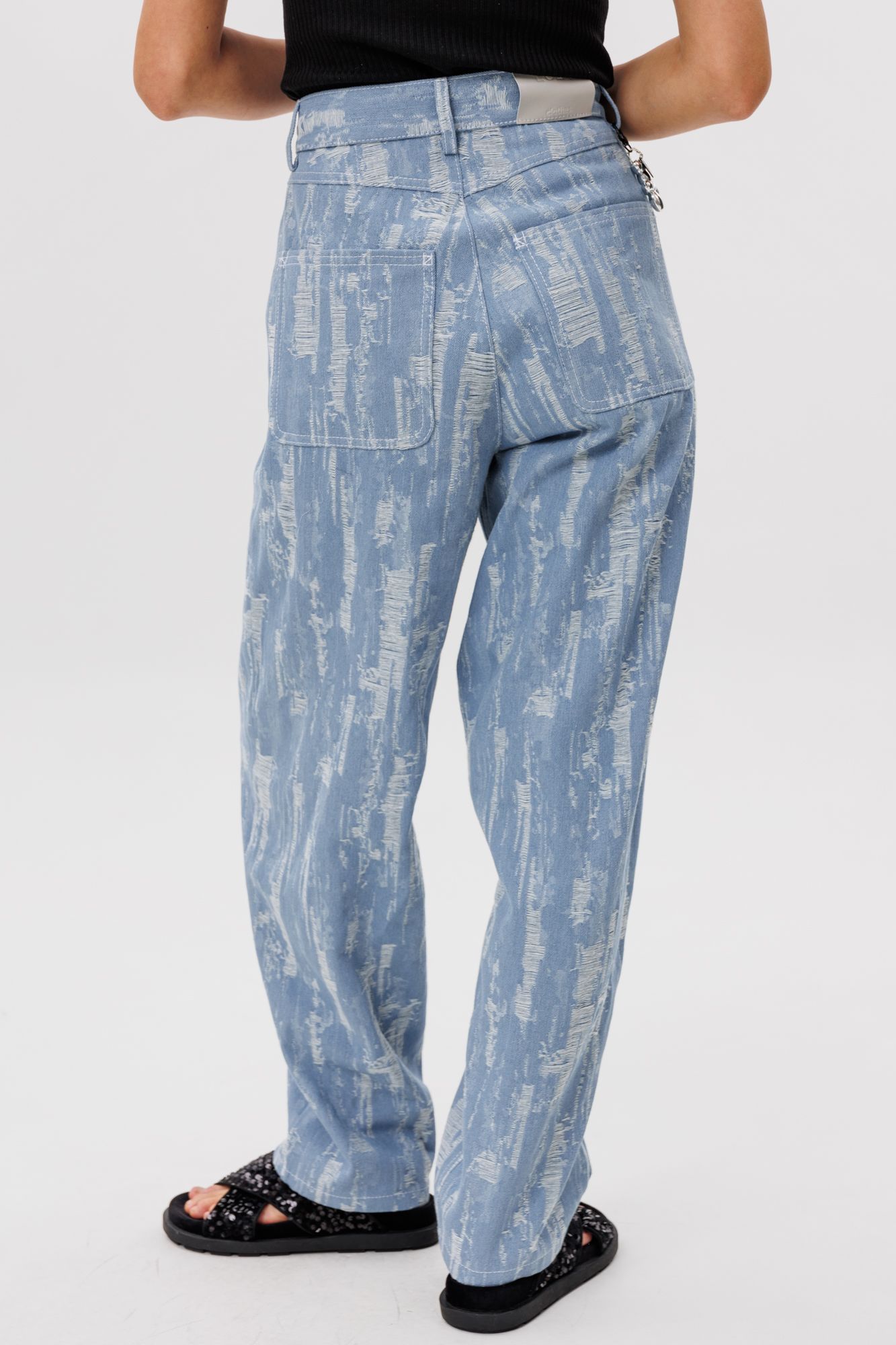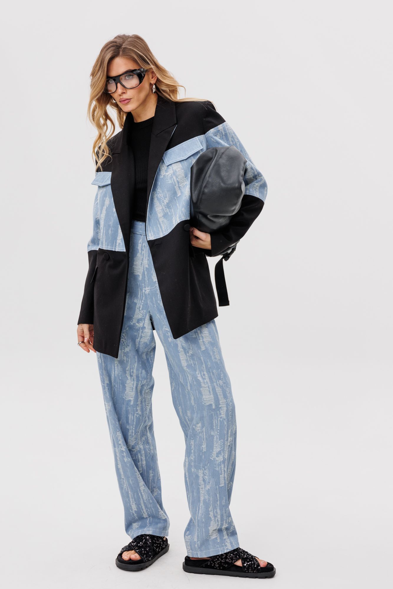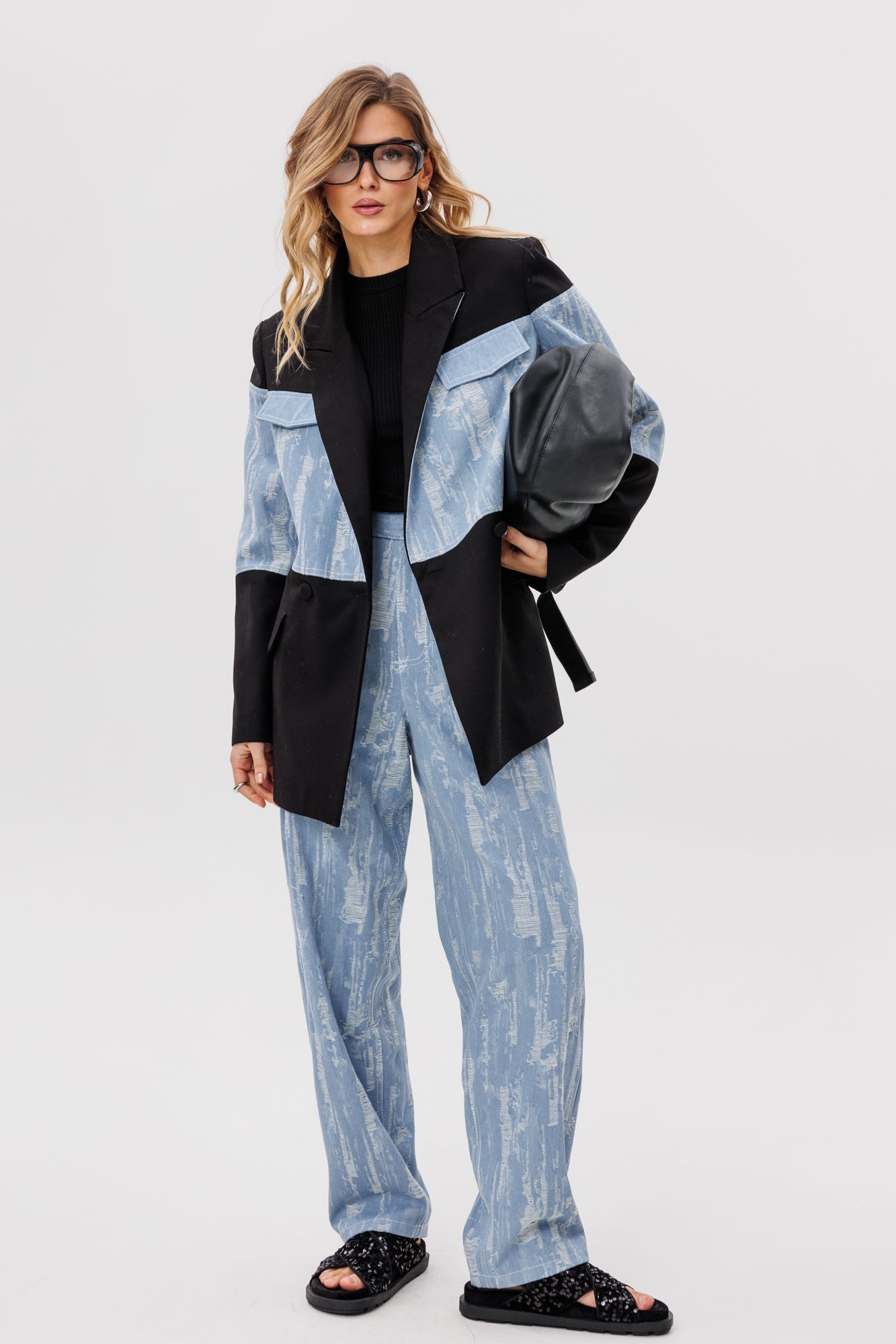 Брюки выполнены из джинса. Брюки свободного покроя на притачном поясе. Спереди боковые карманы с фигурным входом и застежка на молнию. На задних частях кокетки и накладные карманы. Пояс застегивается на одну пуговицу. Длина брюк: р. 44-48 - 107 см, р. 50-54 - 108,5 см. 44 46 48 50 52 54 Длина сбоку с поясом 107 107 107 108,5 108,5 108,5 Объем по талии 72 76 80 84 88 92 Объем по бедрам 104 108 112 116 120 124 Ширина пояса 4,5 4,5 4,5 4,5 4,5 4,5
