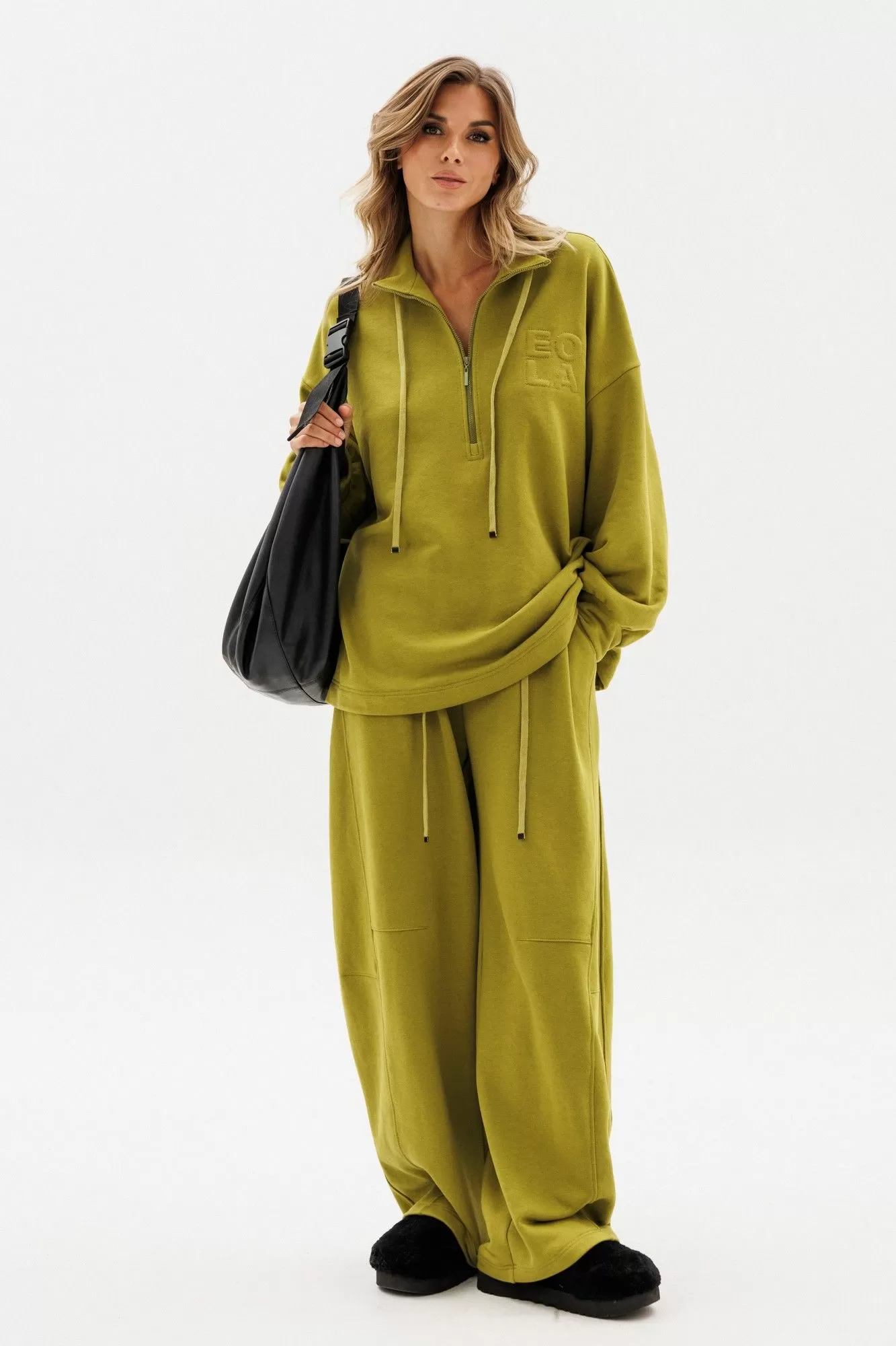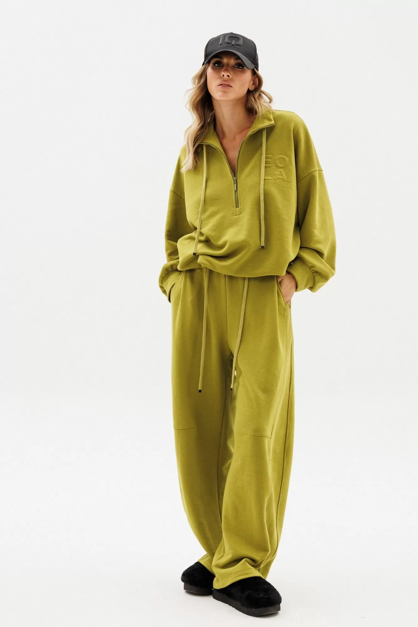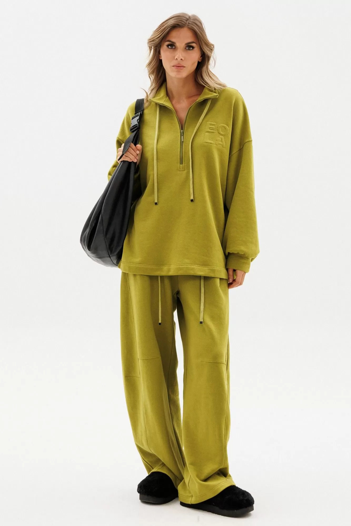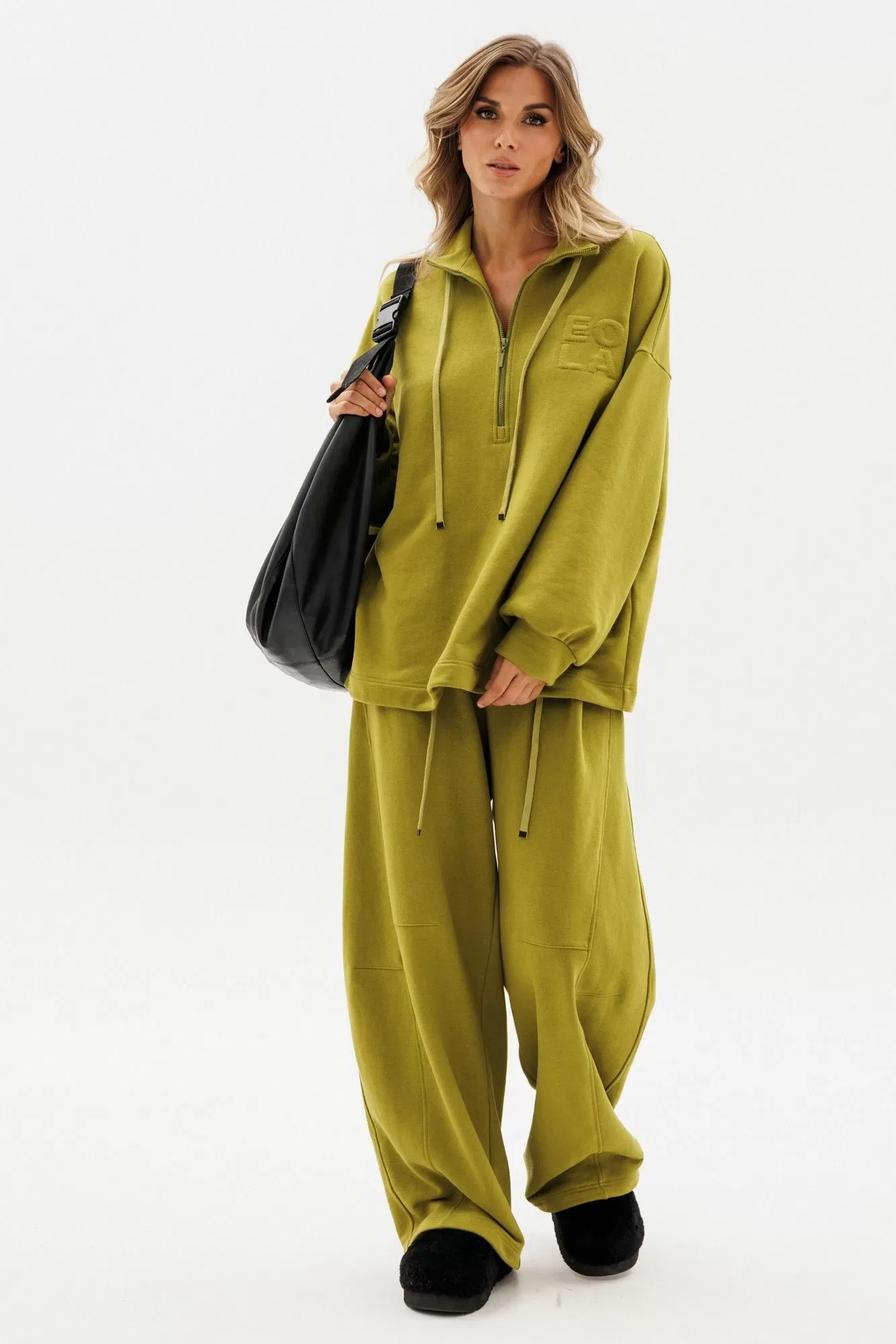 Комплект: джемпер+брюки. Комплект выполнен из трикотажного полотна. Джемпер прямого силуэта, покроя "oversize" длиной до линии бедер. Спереди застежка на молнию. Воротник-стойка. Плечевой шов удлинен. Рукав рубашечного покроя, одношовный, расширенный и присборенный к низу. Низ рукава на притачной манжете. Низ джемпера на эластичной тесьме с фиксаторами. Джемпер декорирован вышивкой по переду. Брюки прямого силуэта, длиной в пол, на притачном поясе с эластичной тесьмой. Спереди боковые карманы с фигурным входом, петли в поясе, в которые втянут шнур из основной ткани, коленные вытачки, складки. Сзади справа накладной карман.